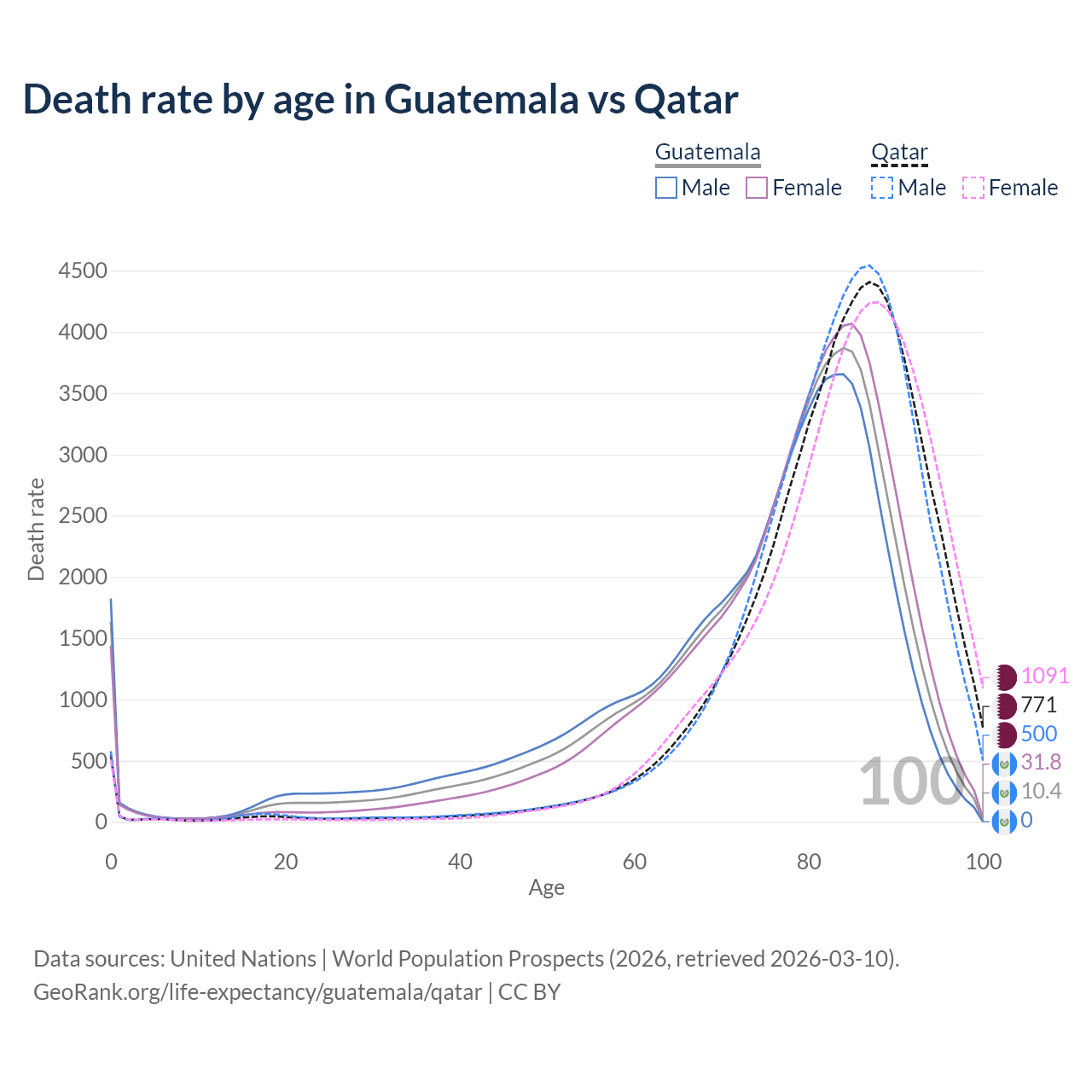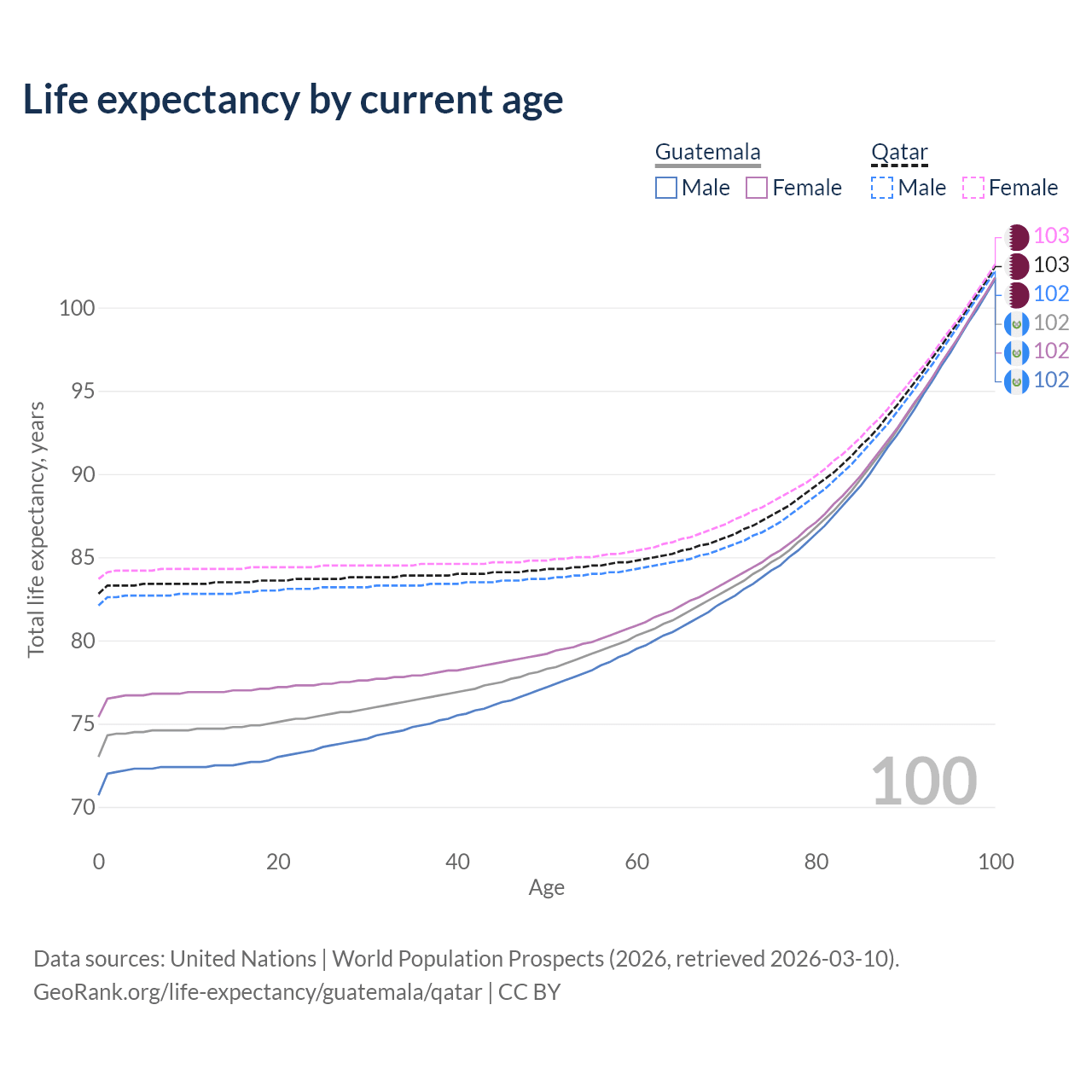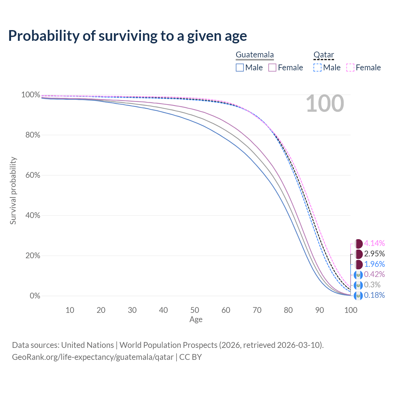 This life expectancy calculator shows the odds of living to 100, 95, 90, and below based on current age for both males and females in Guatemala and Qatar, along with mean and median age of death. The calculations are based on the 2026 life tables (actuarial tables) from the UN World Population Prospects.