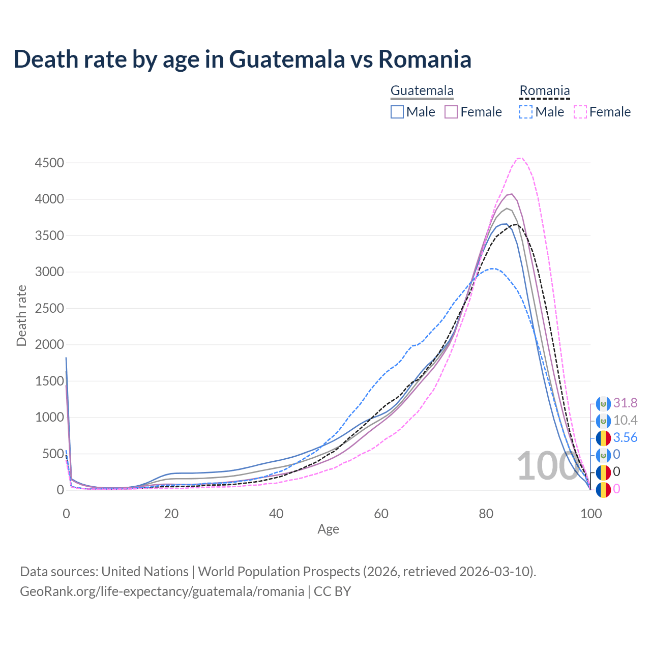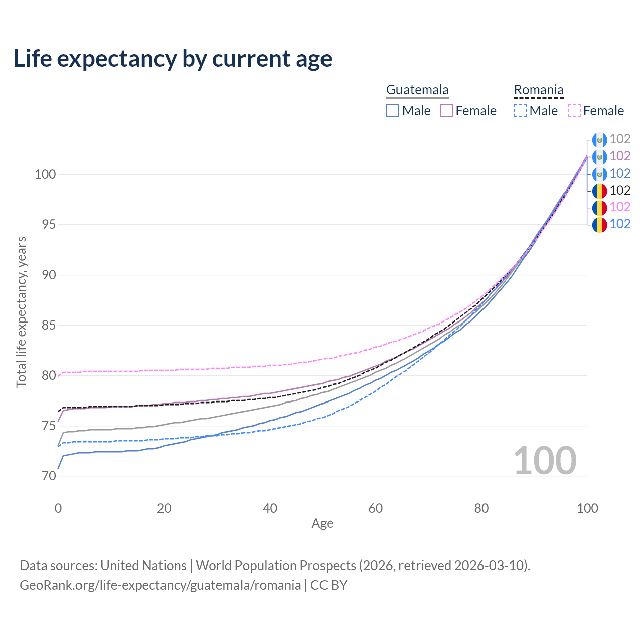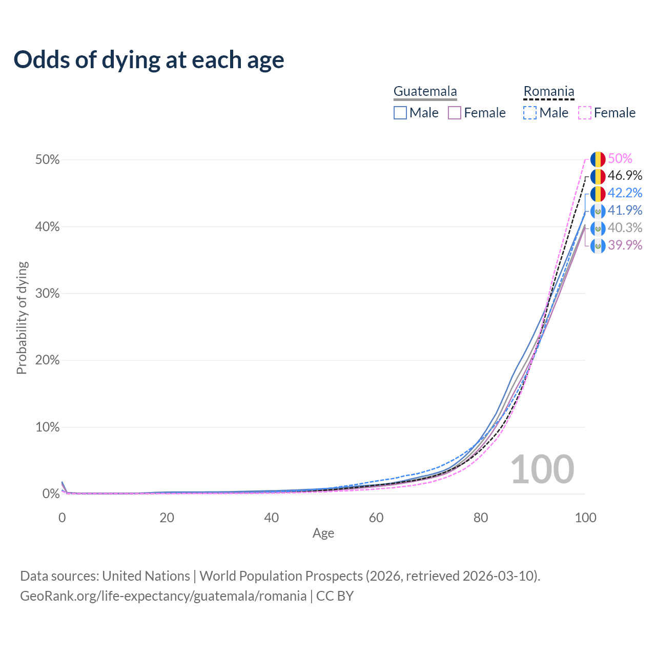 This life expectancy calculator shows the odds of living to 100, 95, 90, and below based on current age for both males and females in Guatemala and Romania, along with mean and median age of death. The calculations are based on the 2026 life tables (actuarial tables) from the UN World Population Prospects.