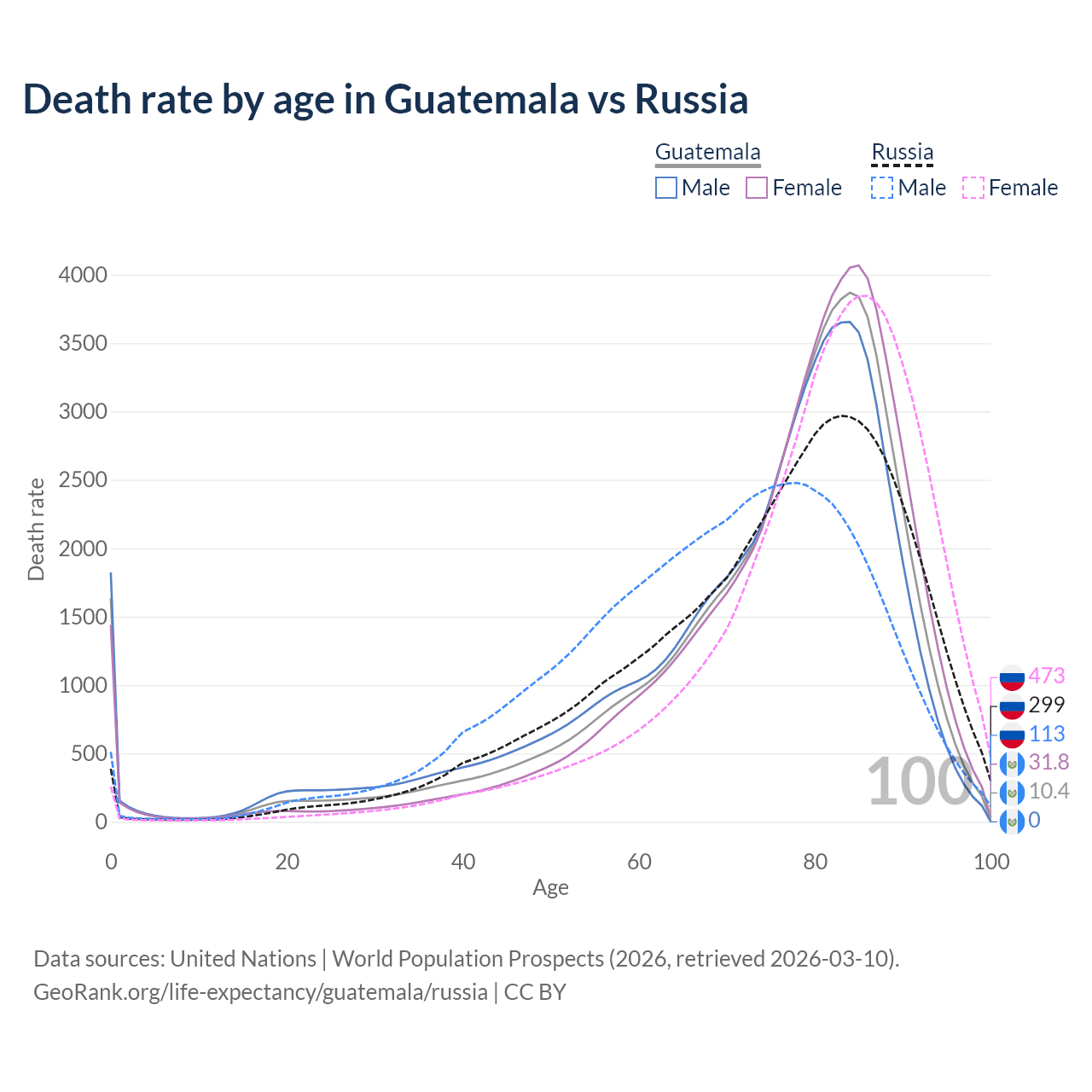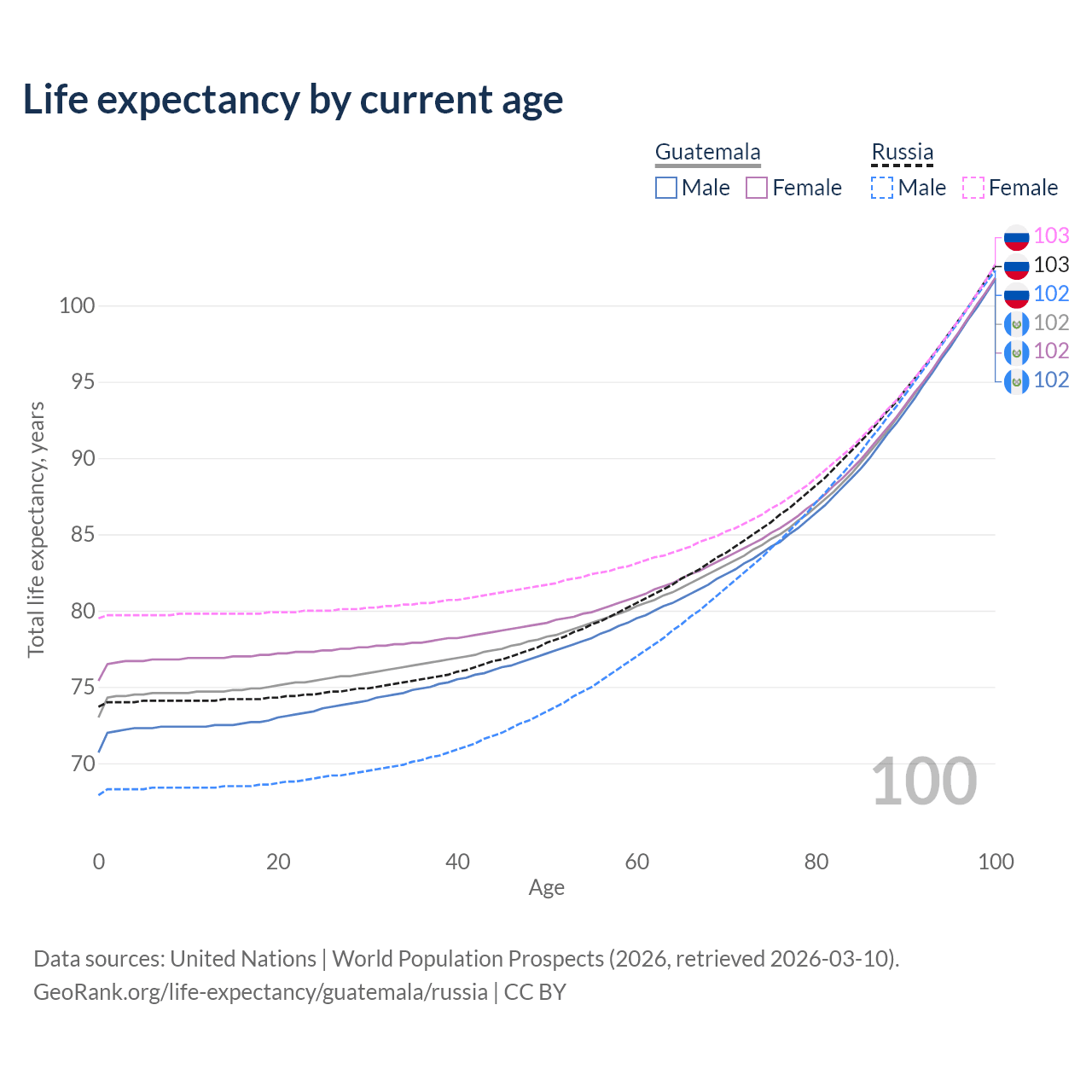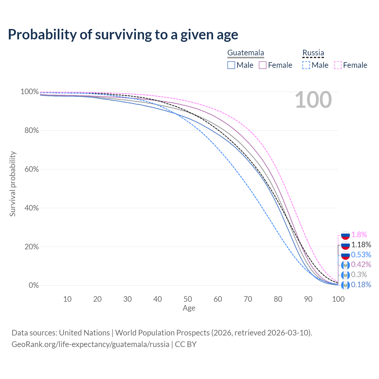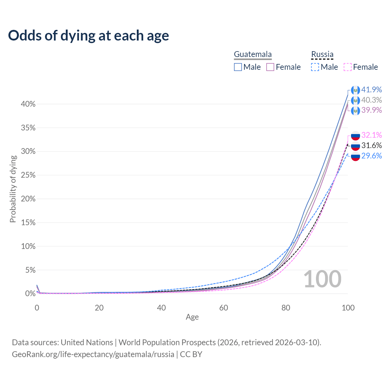 This life expectancy calculator shows the odds of living to 100, 95, 90, and below based on current age for both males and females in Guatemala and Russia, along with mean and median age of death. The calculations are based on the 2026 life tables (actuarial tables) from the UN World Population Prospects.