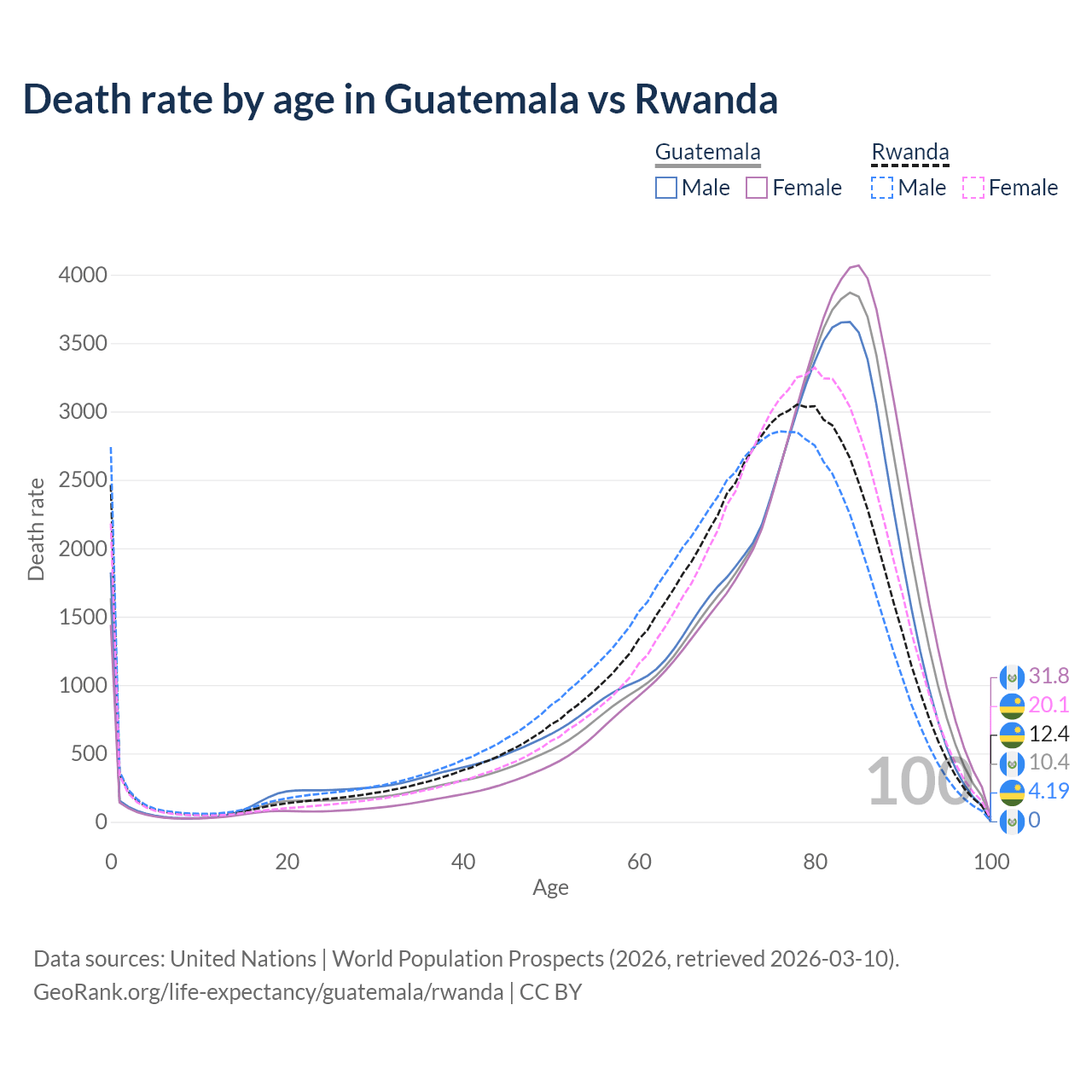 This life expectancy calculator shows the odds of living to 100, 95, 90, and below based on current age for both males and females in Guatemala and Rwanda, along with mean and median age of death. The calculations are based on the 2026 life tables (actuarial tables) from the UN World Population Prospects.