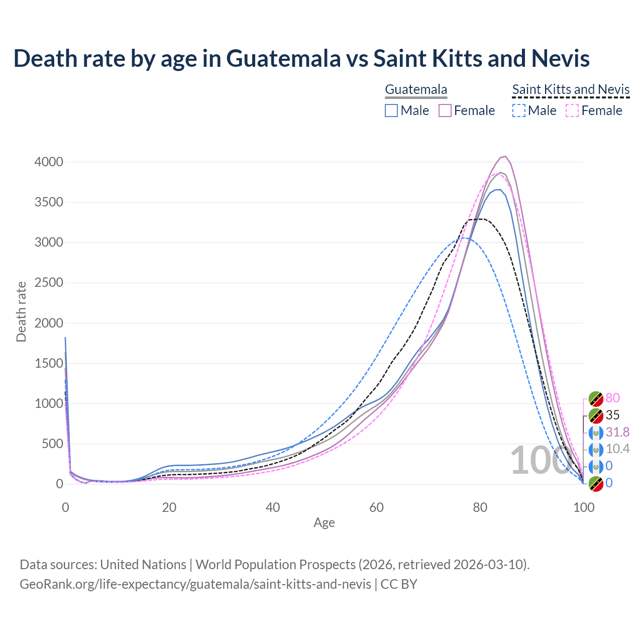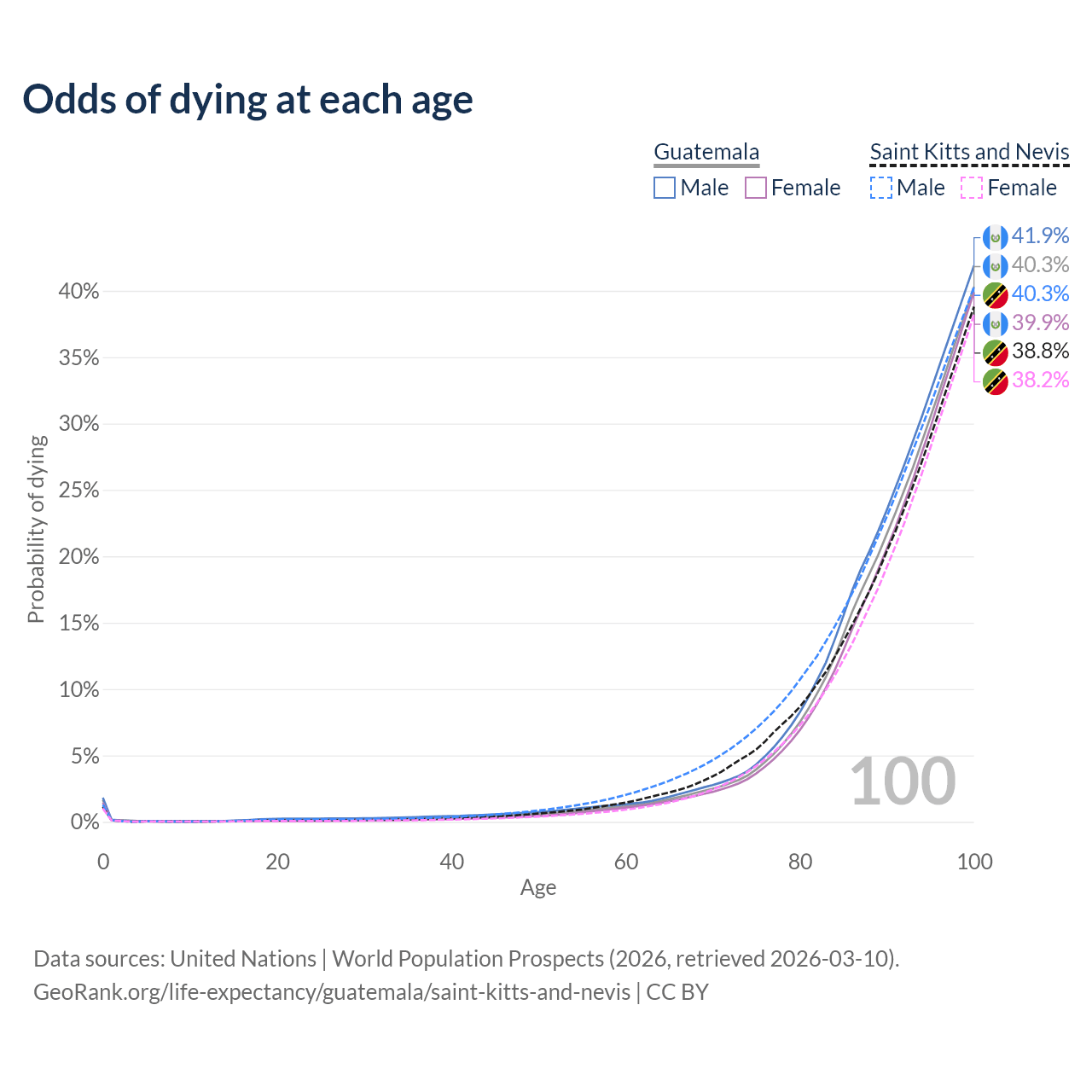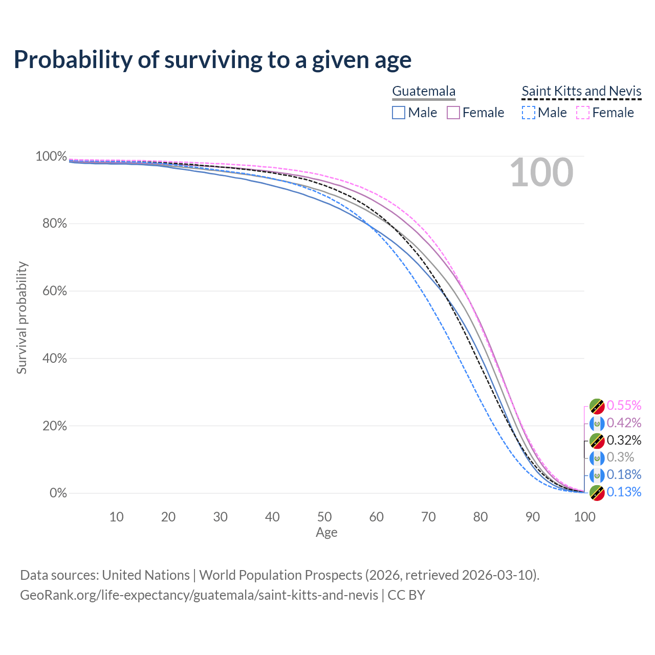 This life expectancy calculator shows the odds of living to 100, 95, 90, and below based on current age for both males and females in Guatemala and Saint Kitts and Nevis, along with mean and median age of death. The calculations are based on the 2026 life tables (actuarial tables) from the UN World Population Prospects.