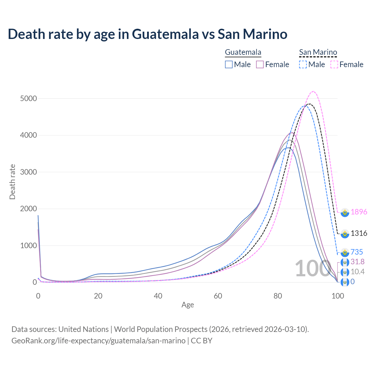 In Guatemala, the most common age of death is 84, compared to 91 in San Marino. The median age of death is 78.7 in Guatemala and 88.3 in San Marino, meaning only half of each cohort is expected to live past that age.
