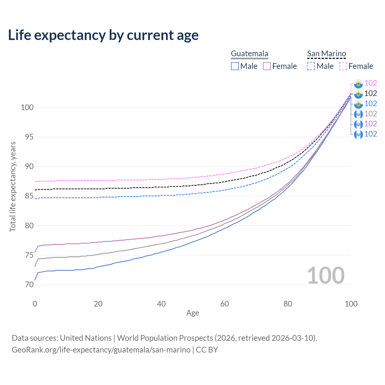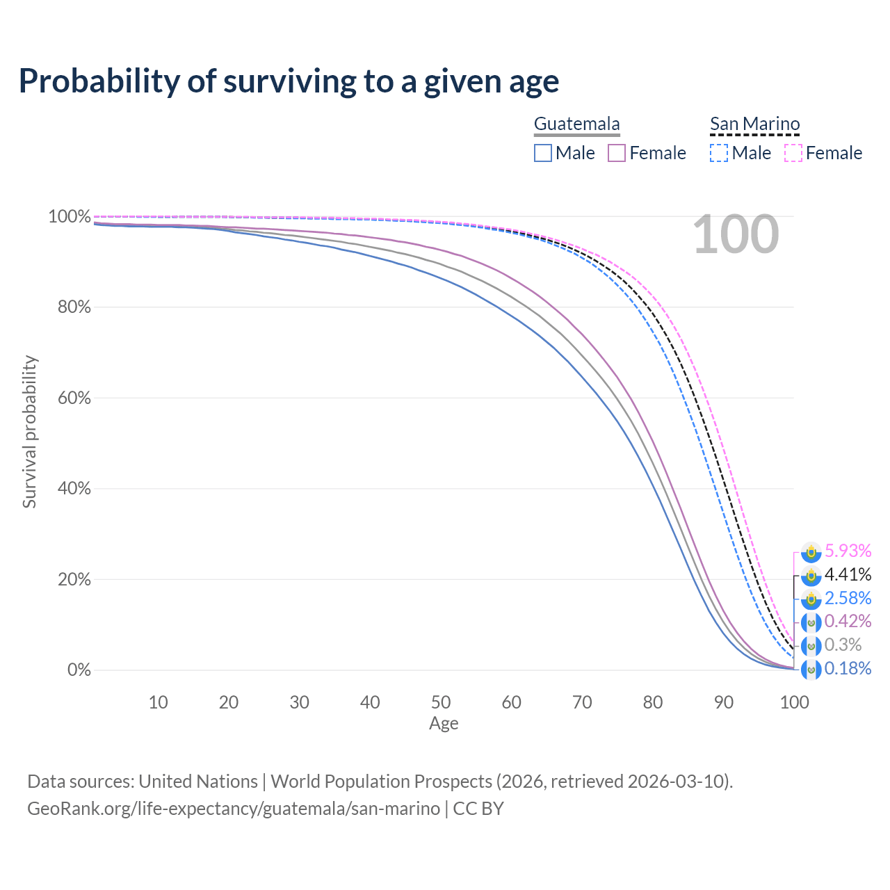 This life expectancy calculator shows the odds of living to 100, 95, 90, and below based on current age for both males and females in Guatemala and San Marino, along with mean and median age of death. The calculations are based on the 2026 life tables (actuarial tables) from the UN World Population Prospects.