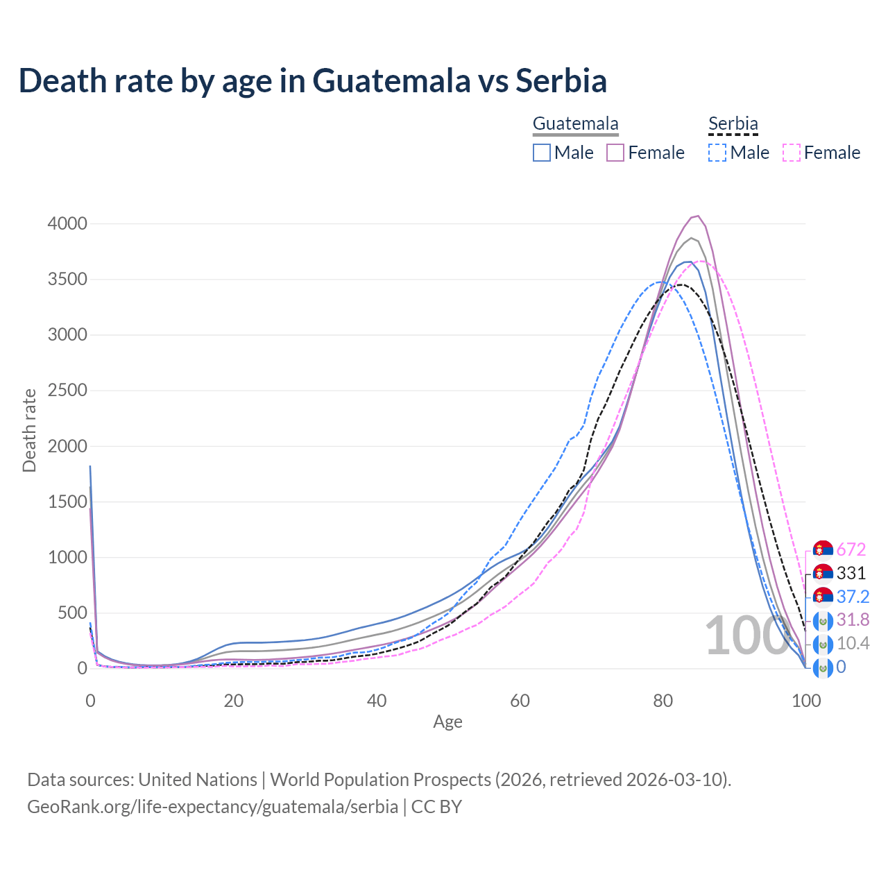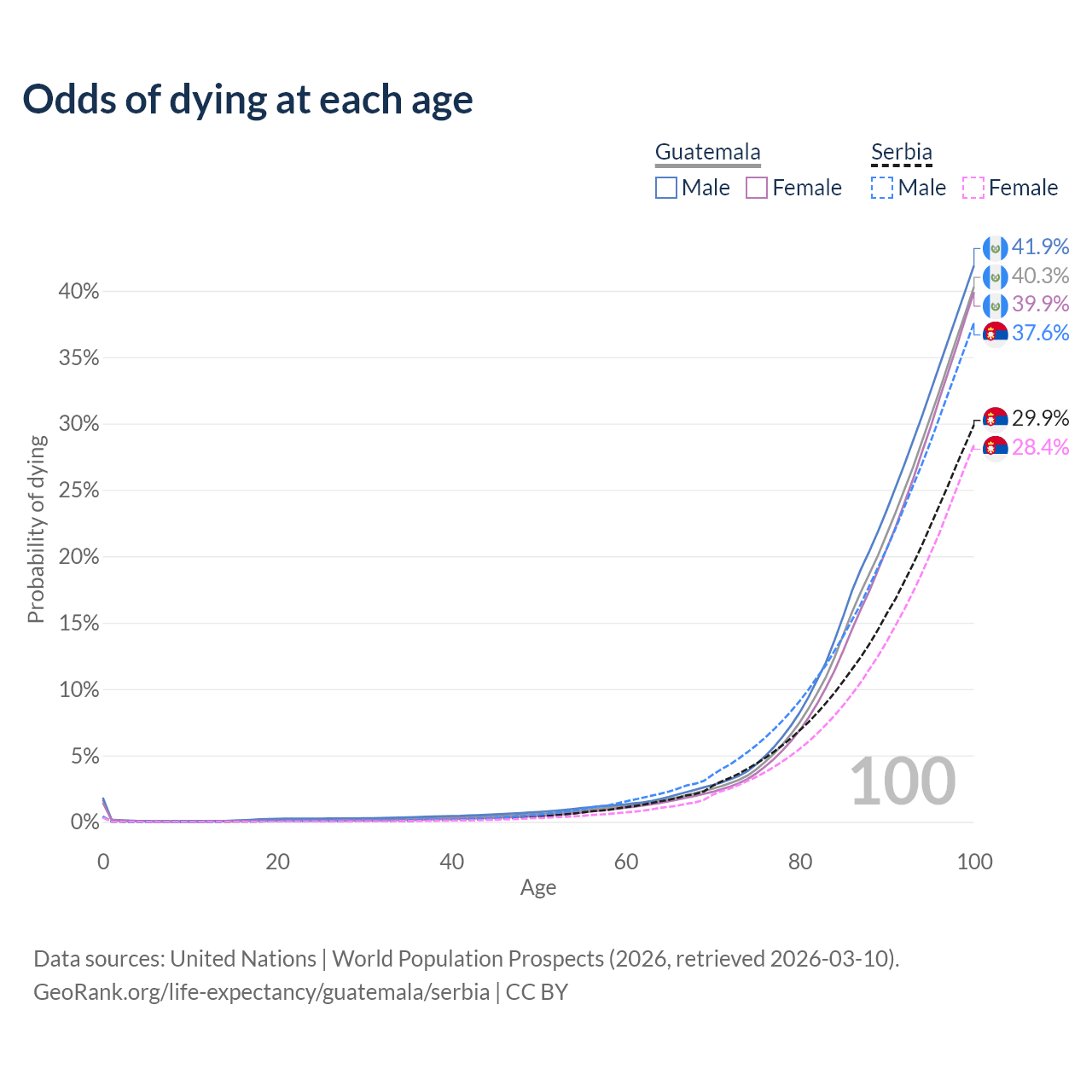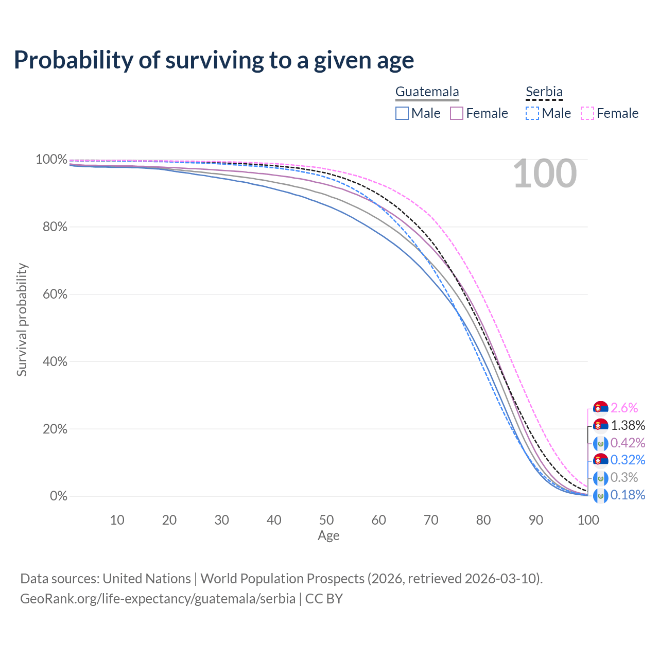 This life expectancy calculator shows the odds of living to 100, 95, 90, and below based on current age for both males and females in Guatemala and Serbia, along with mean and median age of death. The calculations are based on the 2026 life tables (actuarial tables) from the UN World Population Prospects.