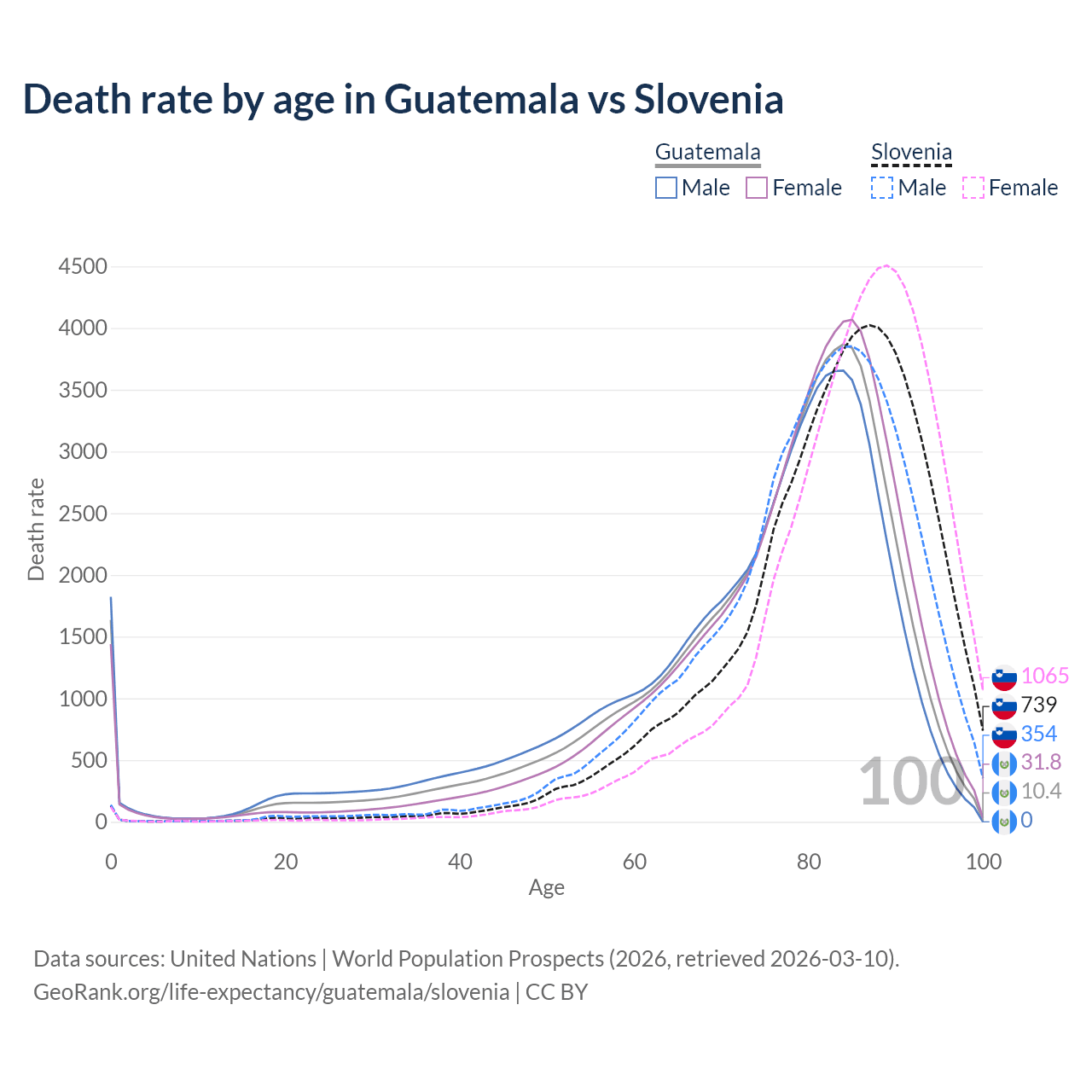 In Guatemala, the most common age of death is 84, compared to 87 in Slovenia. The median age of death is 78.7 in Guatemala and 84.4 in Slovenia, meaning only half of each cohort is expected to live past that age.