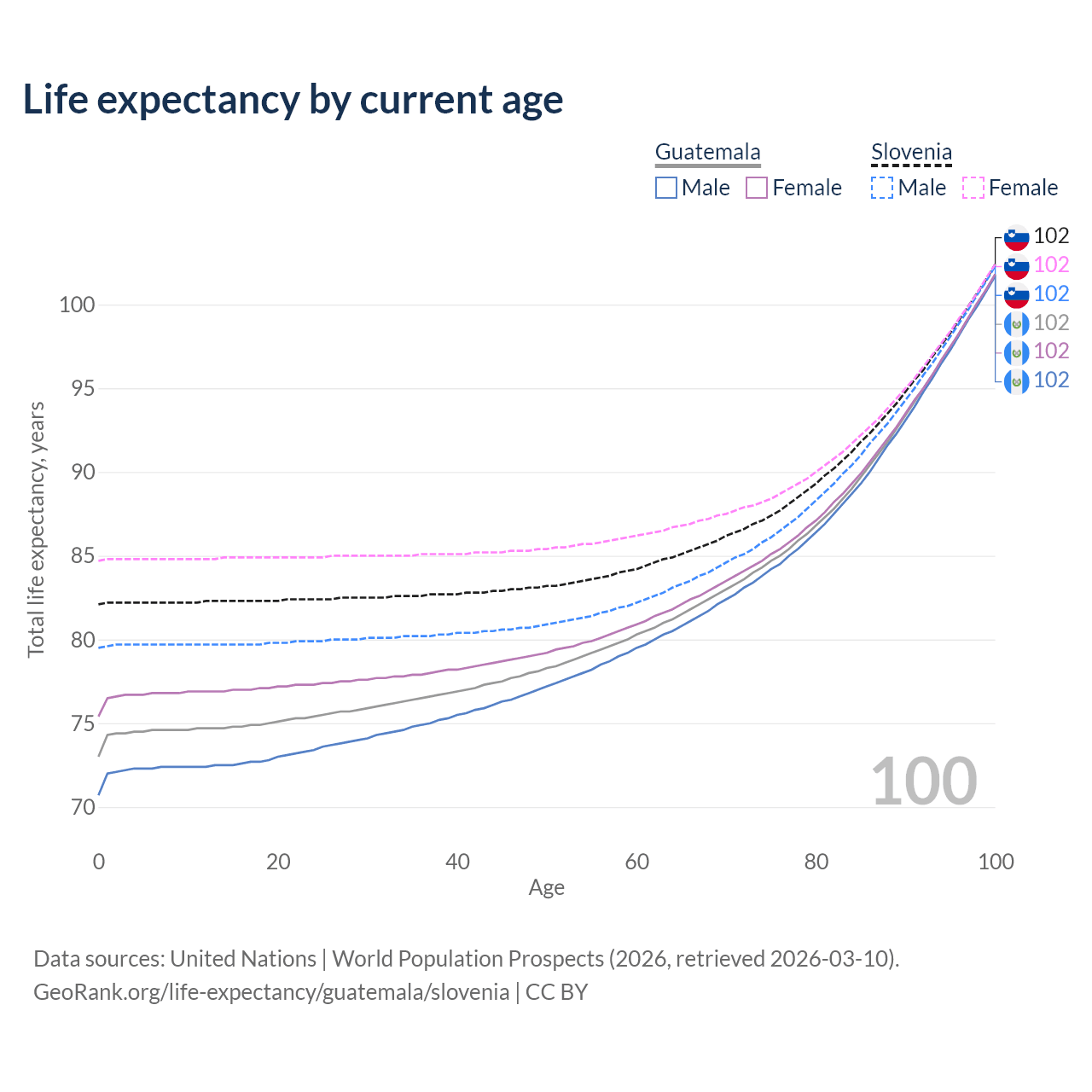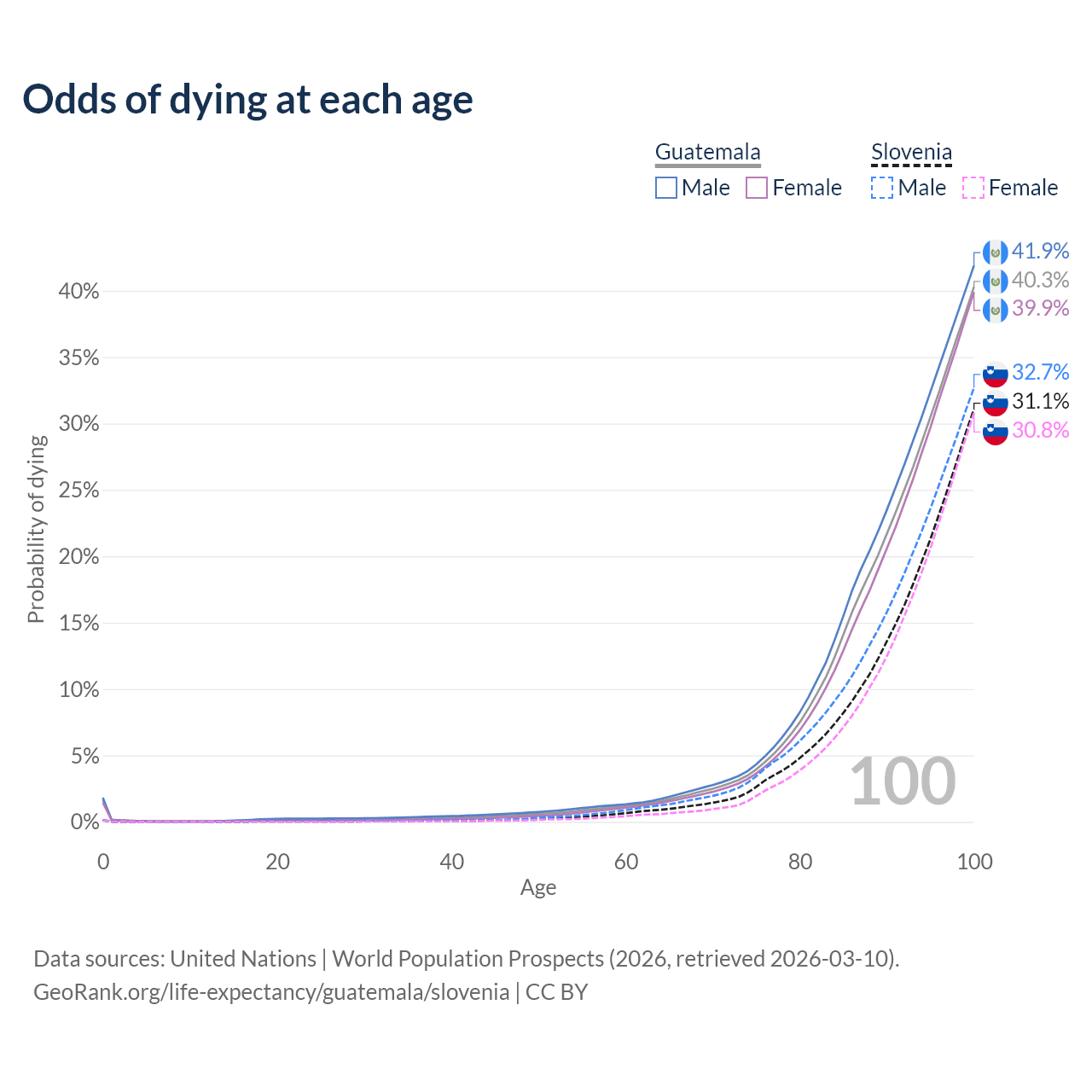 This life expectancy calculator shows the odds of living to 100, 95, 90, and below based on current age for both males and females in Guatemala and Slovenia, along with mean and median age of death. The calculations are based on the 2026 life tables (actuarial tables) from the UN World Population Prospects.