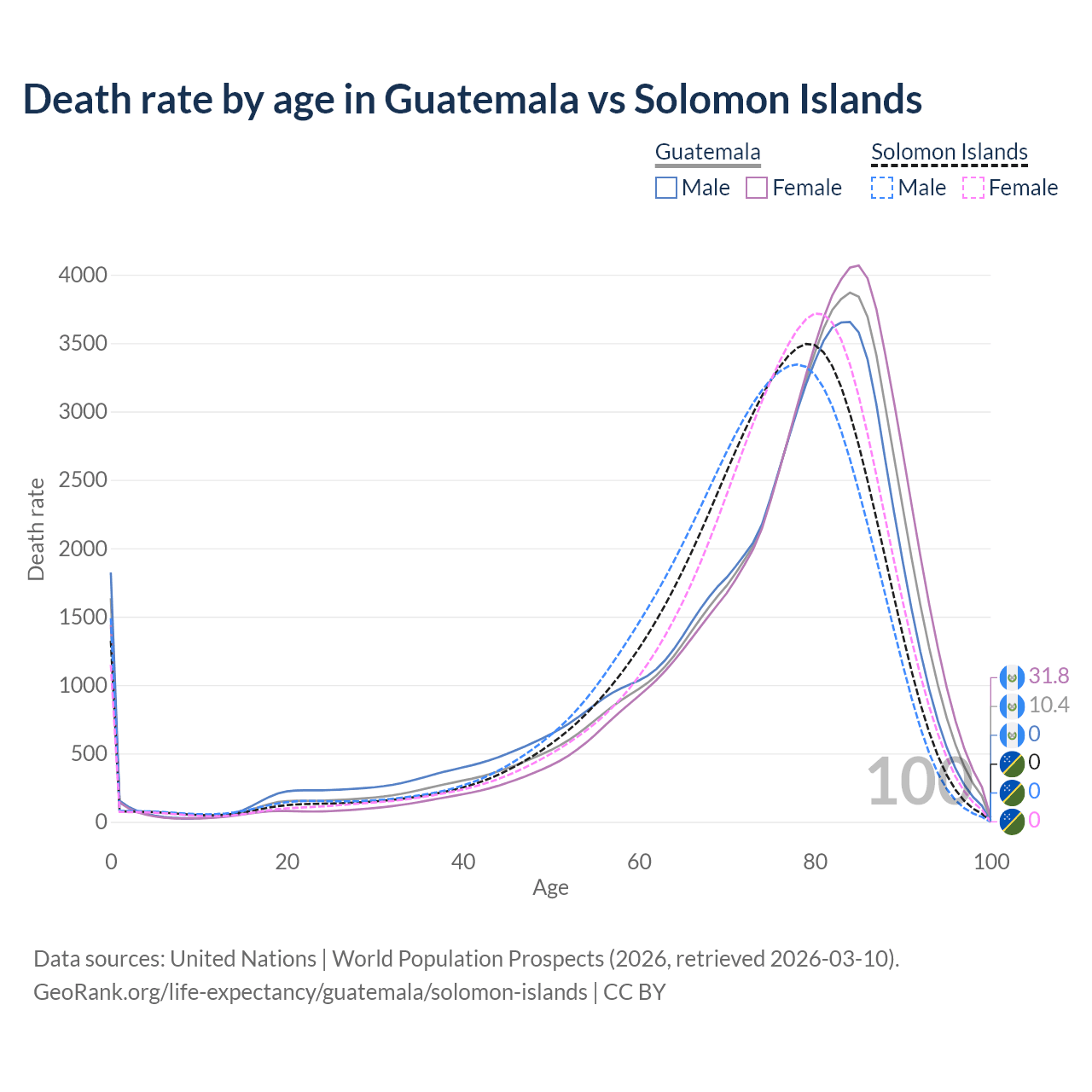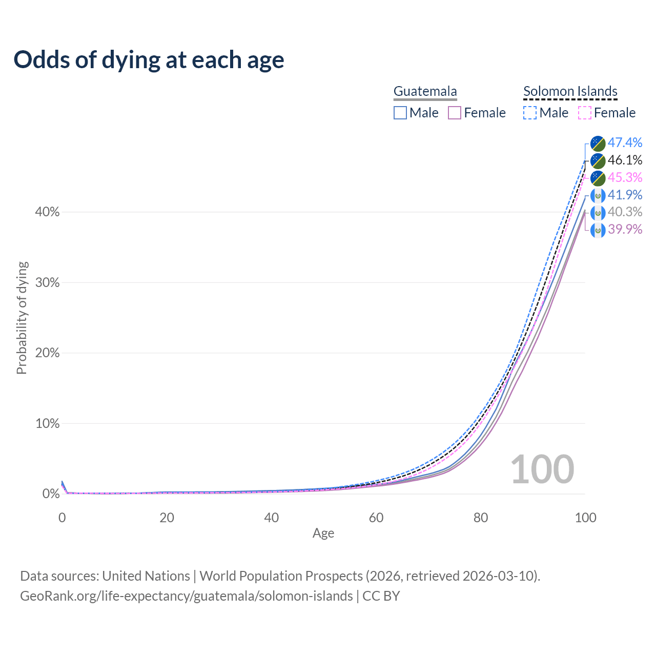 This life expectancy calculator shows the odds of living to 100, 95, 90, and below based on current age for both males and females in Guatemala and the Solomon Islands, along with mean and median age of death. The calculations are based on the 2026 life tables (actuarial tables) from the UN World Population Prospects.