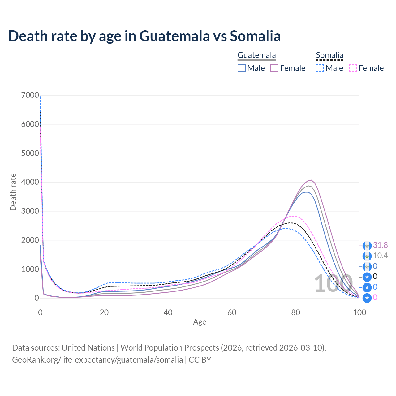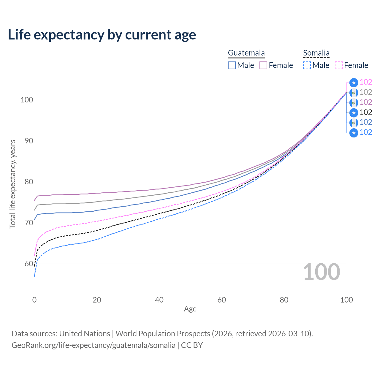 This life expectancy calculator shows the odds of living to 100, 95, 90, and below based on current age for both males and females in Guatemala and Somalia, along with mean and median age of death. The calculations are based on the 2026 life tables (actuarial tables) from the UN World Population Prospects.