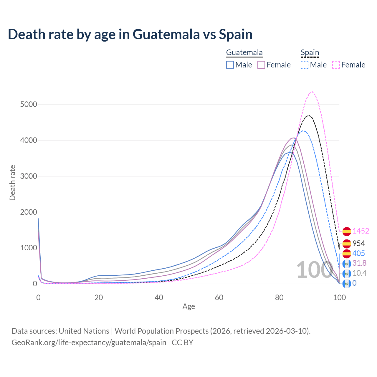 In Guatemala, the most common age of death is 84, compared to 90 in Spain. The median age of death is 78.7 in Guatemala and 87 in Spain, meaning only half of each cohort is expected to live past that age.