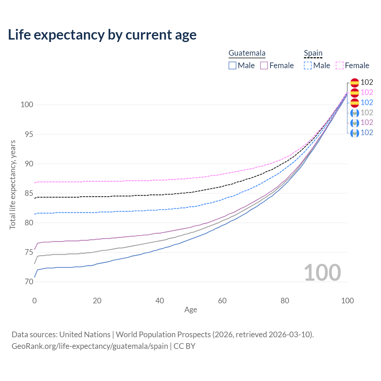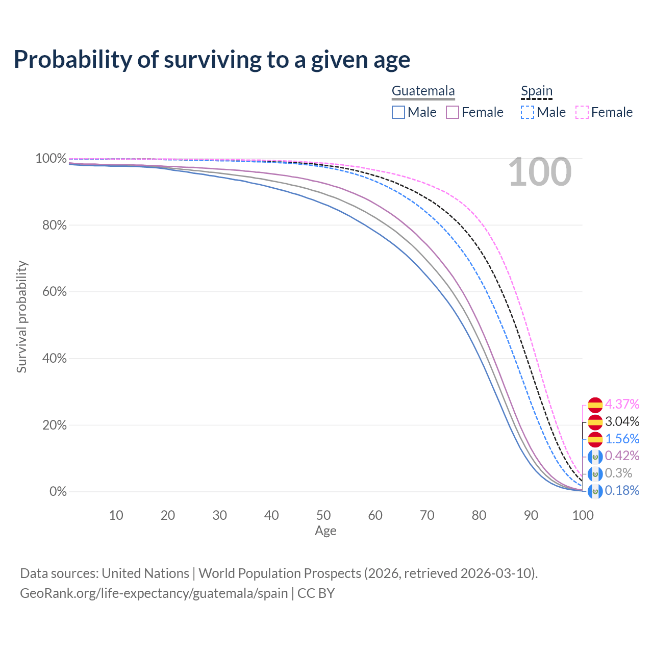 This life expectancy calculator shows the odds of living to 100, 95, 90, and below based on current age for both males and females in Guatemala and Spain, along with mean and median age of death. The calculations are based on the 2026 life tables (actuarial tables) from the UN World Population Prospects.