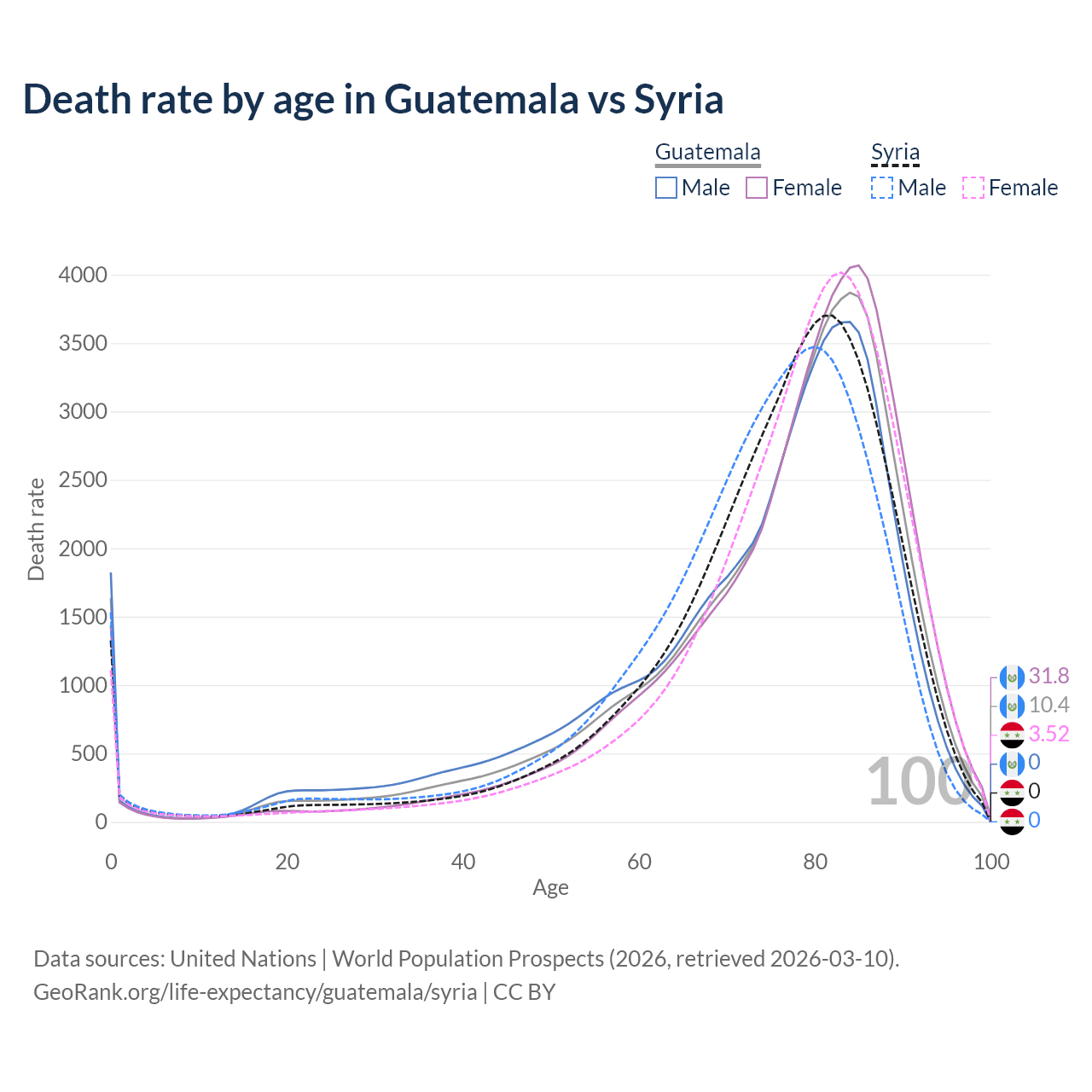 In Guatemala, the most common age of death is 84, compared to 82 in Syria. The median age of death is 78.7 in Guatemala and 77.7 in Syria, meaning only half of each cohort is expected to live past that age.
