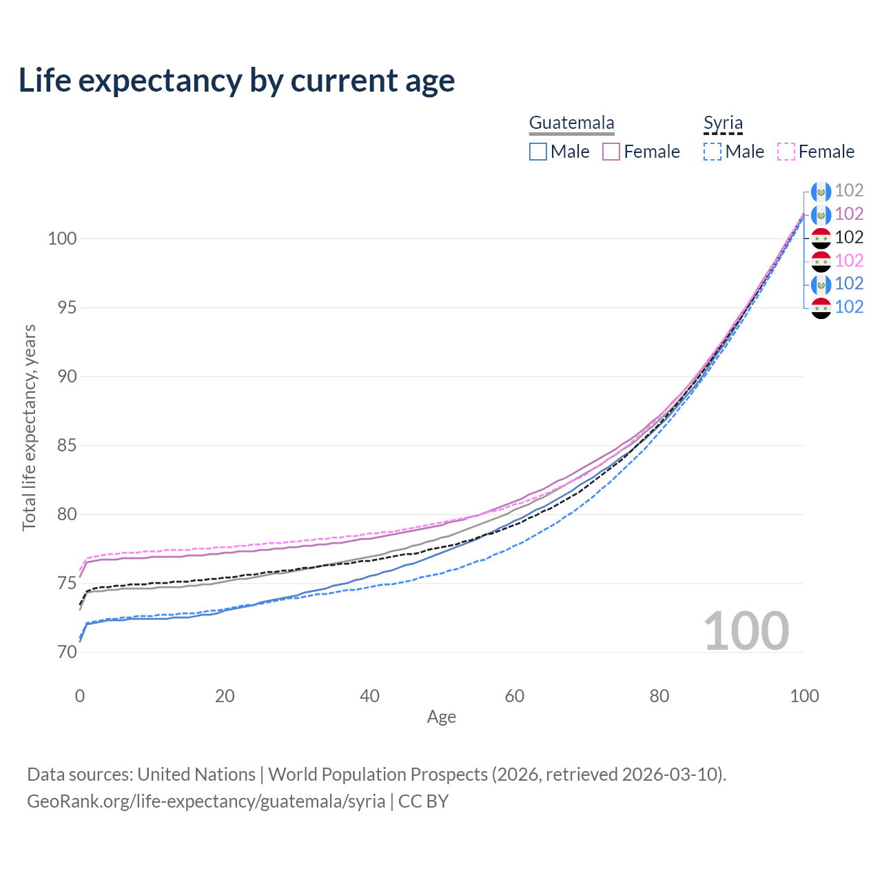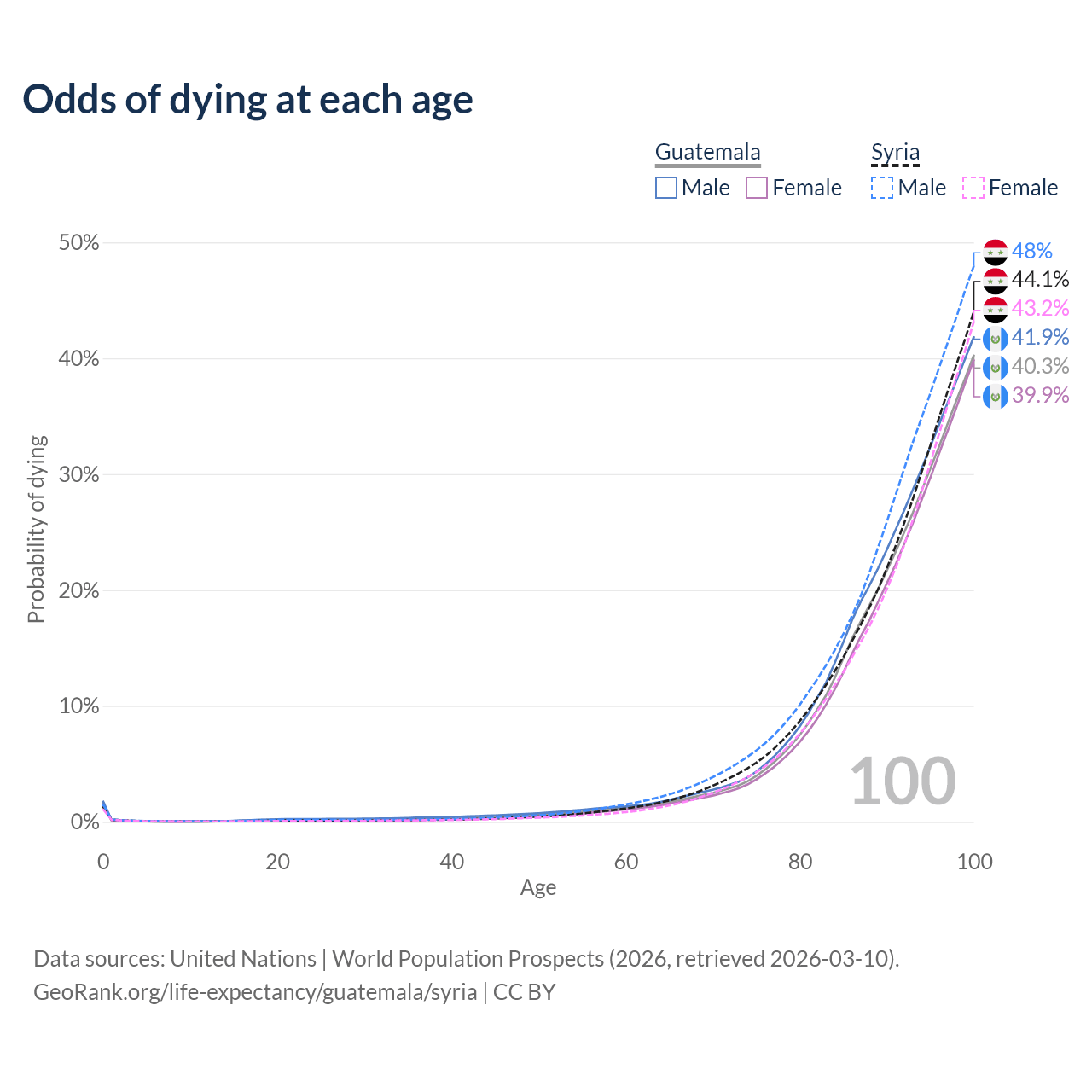 This life expectancy calculator shows the odds of living to 100, 95, 90, and below based on current age for both males and females in Guatemala and Syria, along with mean and median age of death. The calculations are based on the 2026 life tables (actuarial tables) from the UN World Population Prospects.