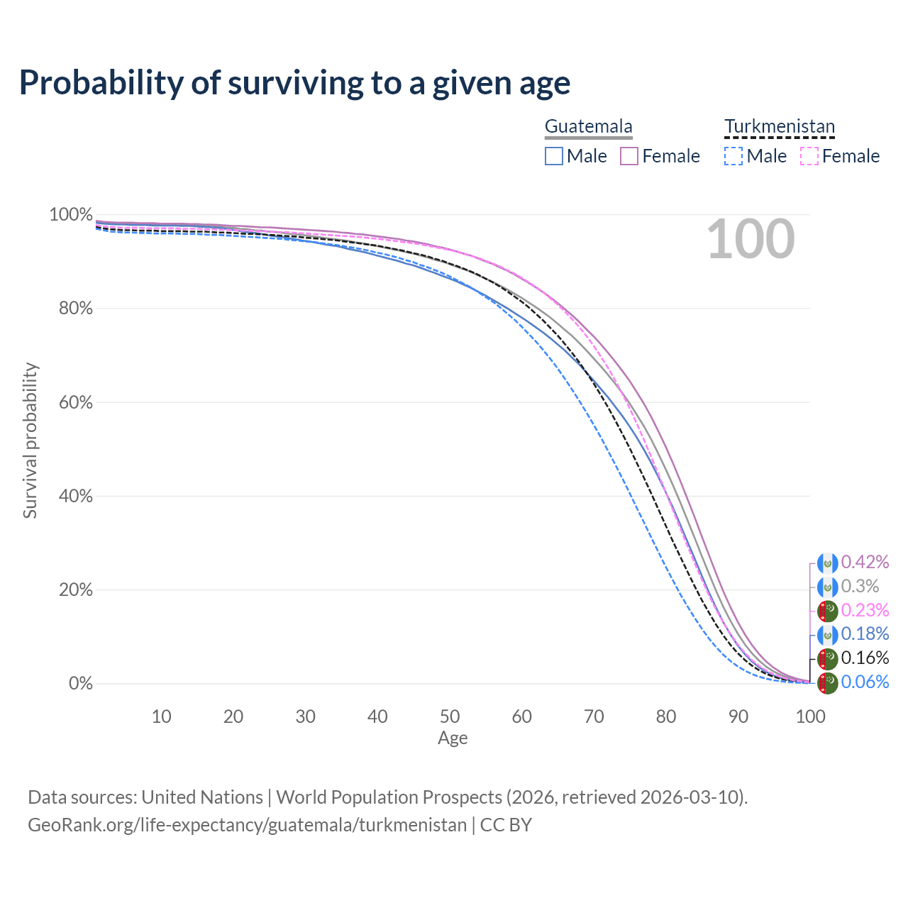 This life expectancy calculator shows the odds of living to 100, 95, 90, and below based on current age for both males and females in Guatemala and Turkmenistan, along with mean and median age of death. The calculations are based on the 2026 life tables (actuarial tables) from the UN World Population Prospects.