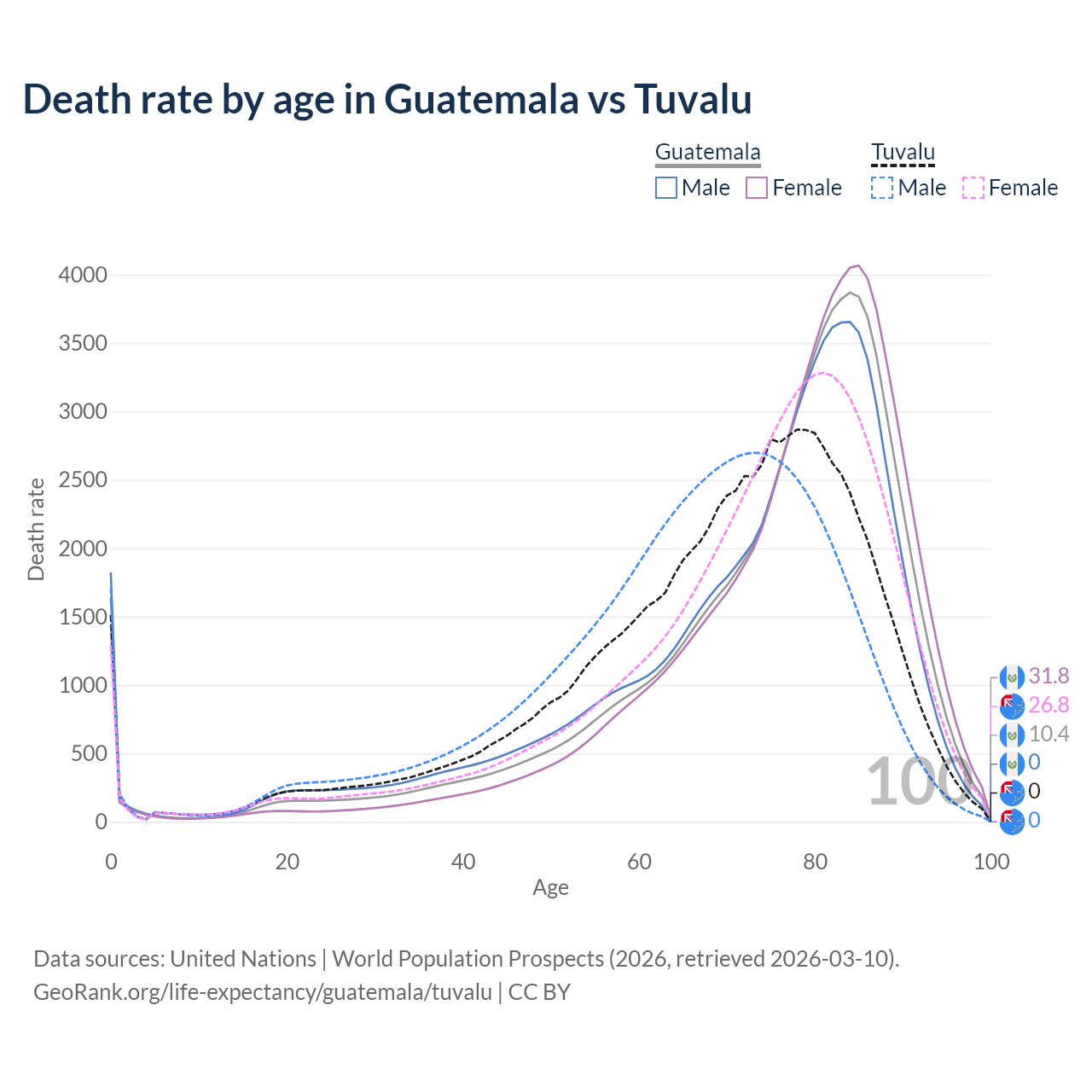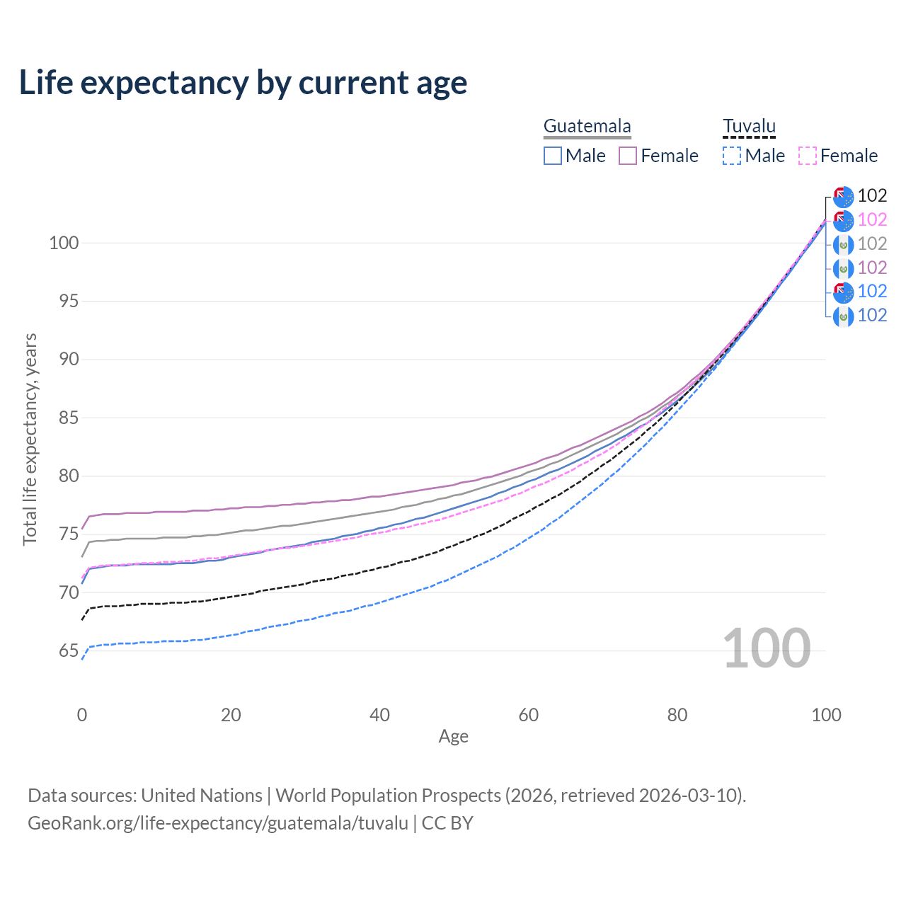 This life expectancy calculator shows the odds of living to 100, 95, 90, and below based on current age for both males and females in Guatemala and Tuvalu, along with mean and median age of death. The calculations are based on the 2026 life tables (actuarial tables) from the UN World Population Prospects.
