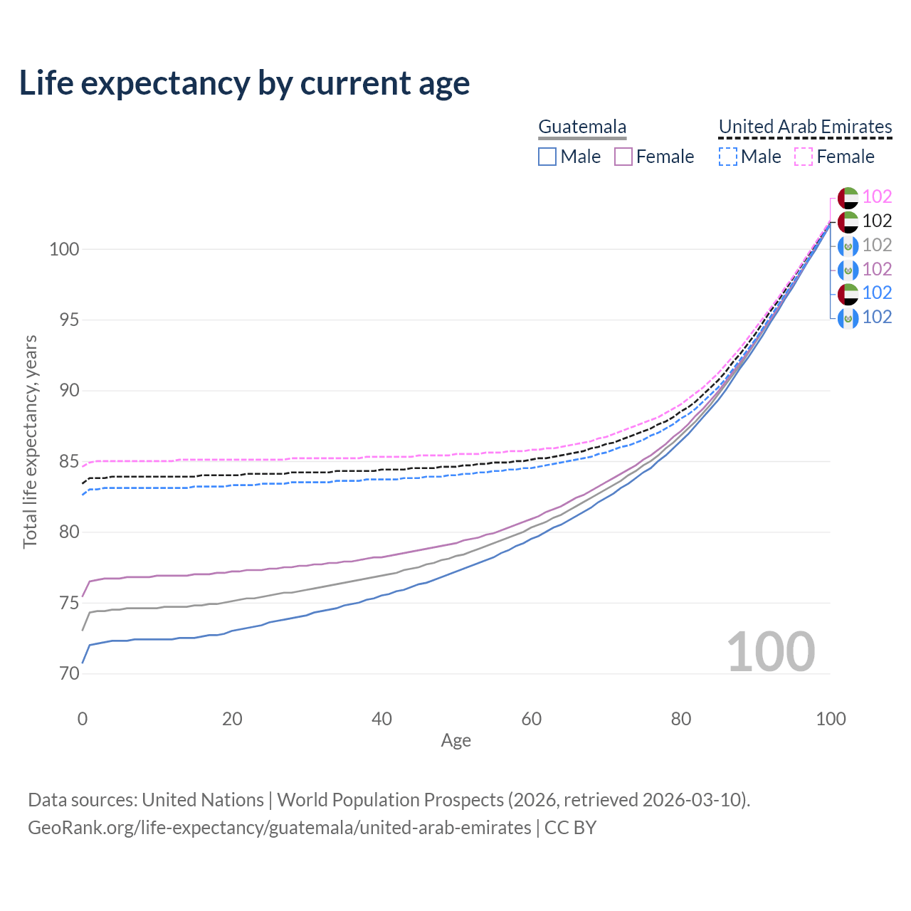 This life expectancy calculator shows the odds of living to 100, 95, 90, and below based on current age for both males and females in Guatemala and the United Arab Emirates, along with mean and median age of death. The calculations are based on the 2026 life tables (actuarial tables) from the UN World Population Prospects.