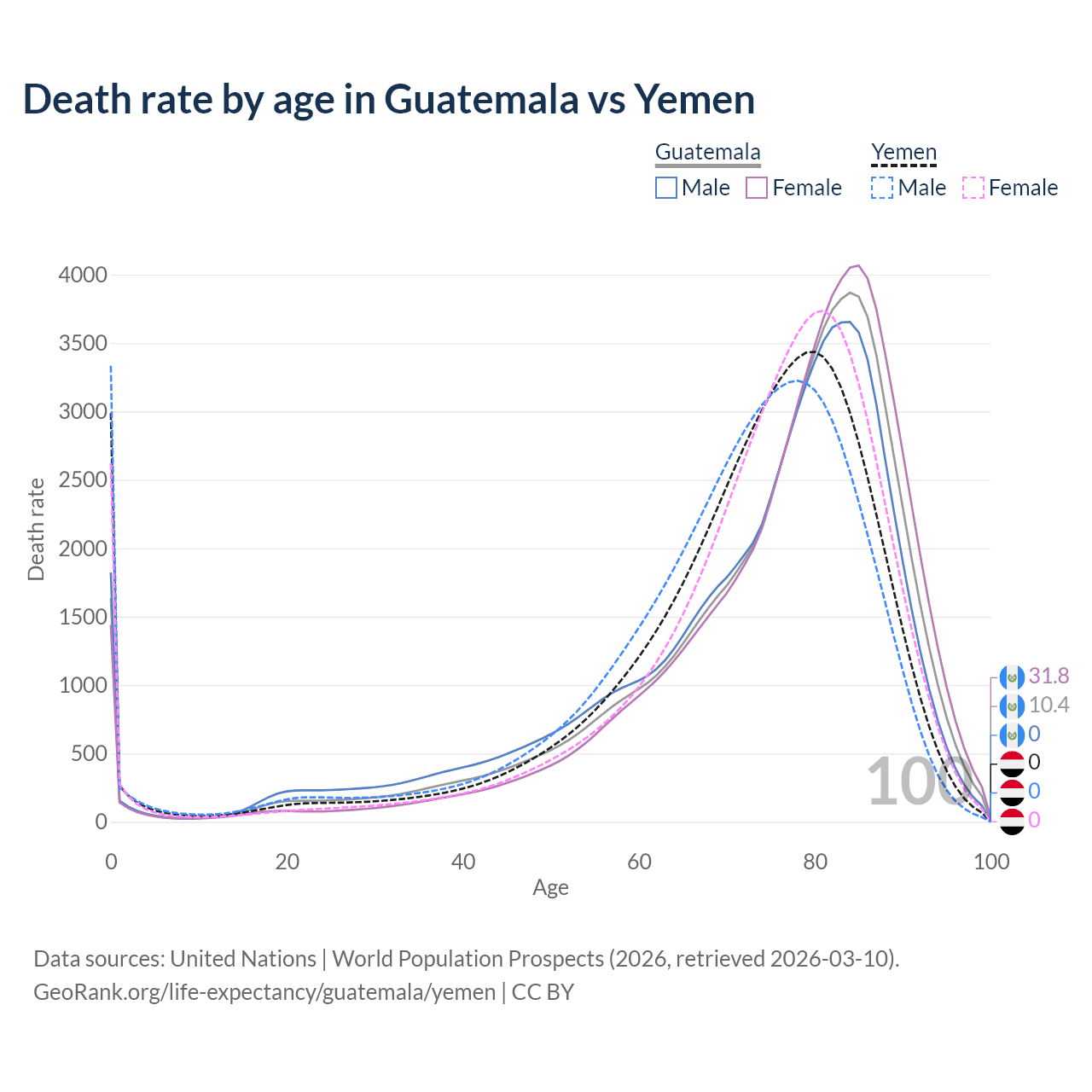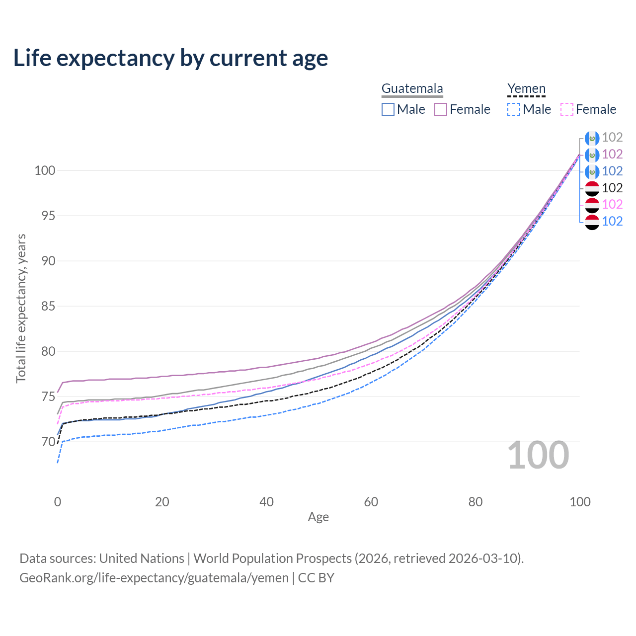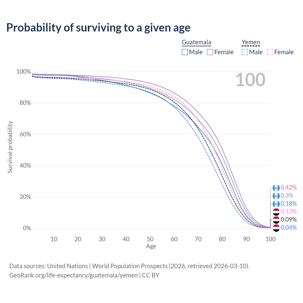 This life expectancy calculator shows the odds of living to 100, 95, 90, and below based on current age for both males and females in Guatemala and Yemen, along with mean and median age of death. The calculations are based on the 2026 life tables (actuarial tables) from the UN World Population Prospects.