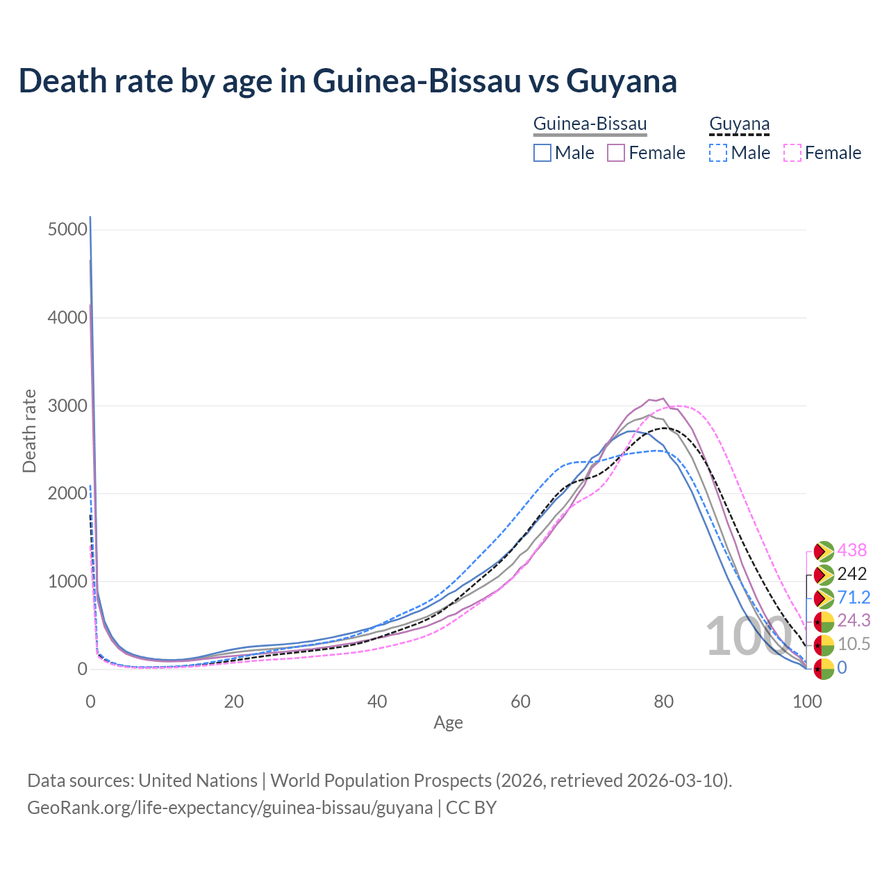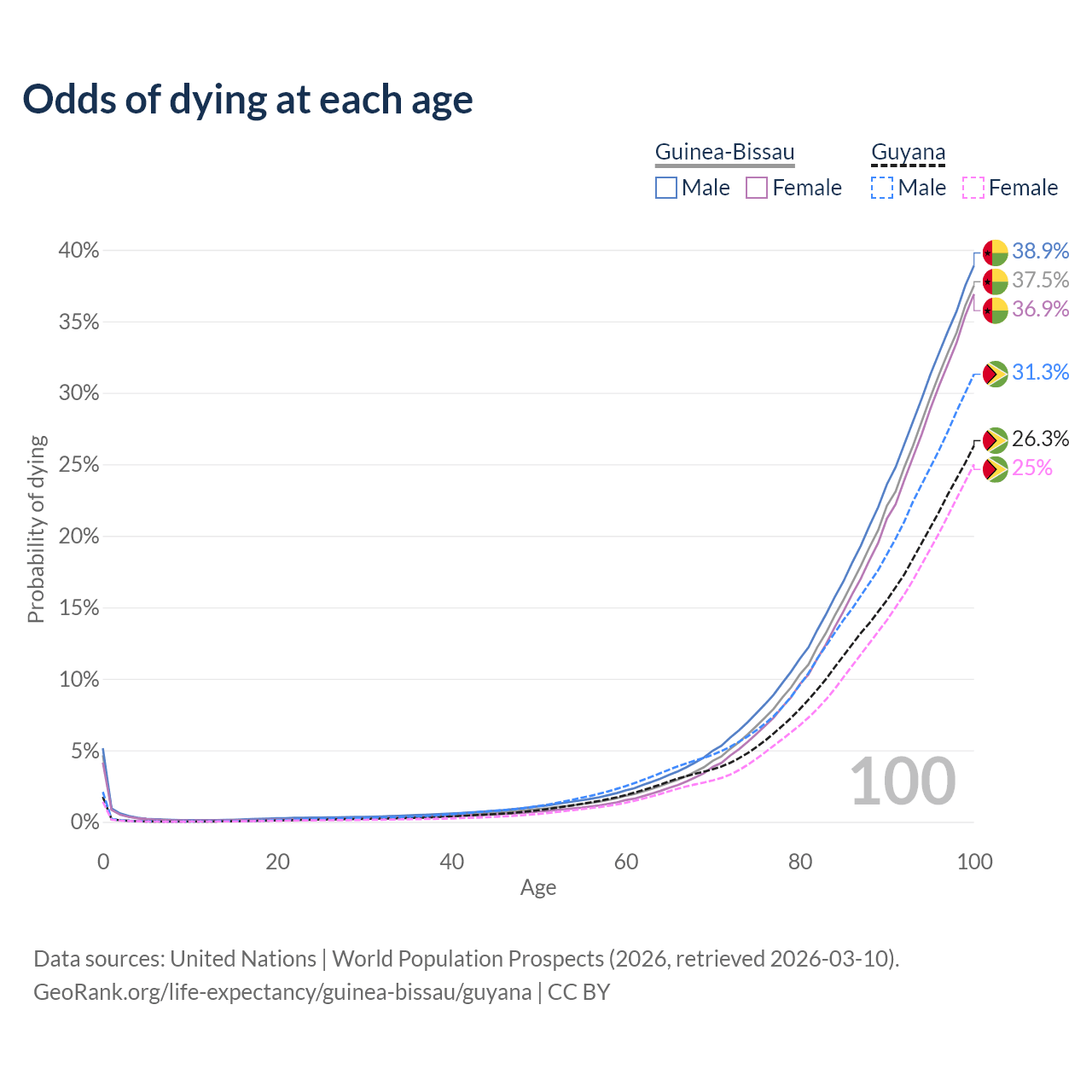 This life expectancy calculator shows the odds of living to 100, 95, 90, and below based on current age for both males and females in Guinea-Bissau and Guyana, along with mean and median age of death. The calculations are based on the 2026 life tables (actuarial tables) from the UN World Population Prospects.