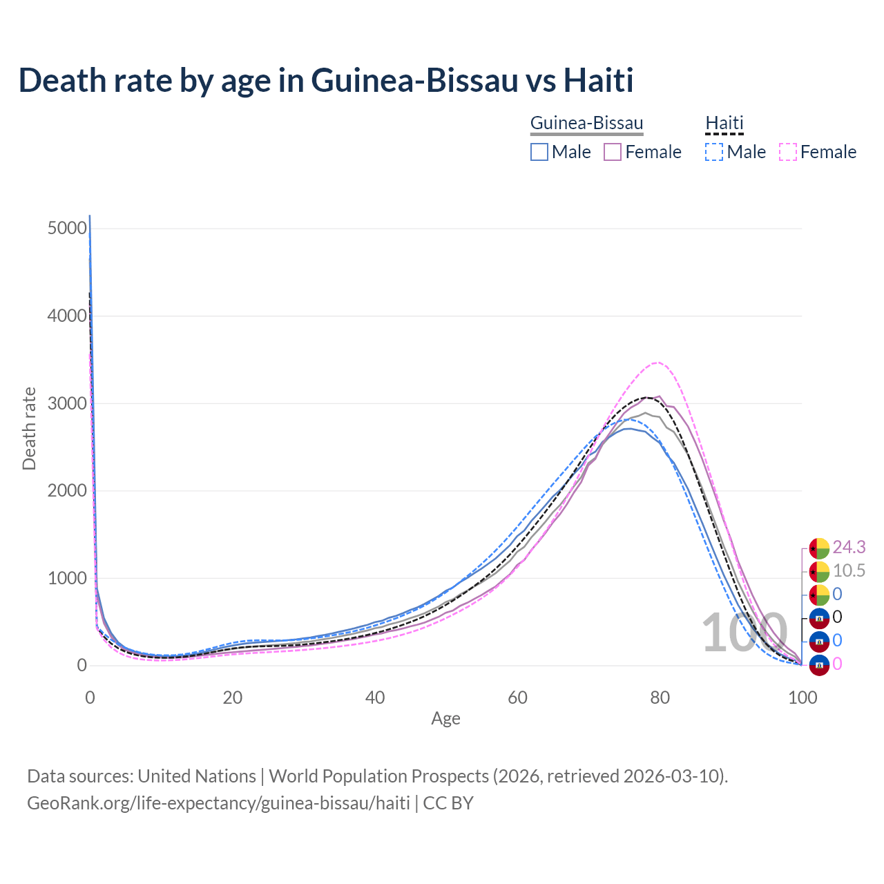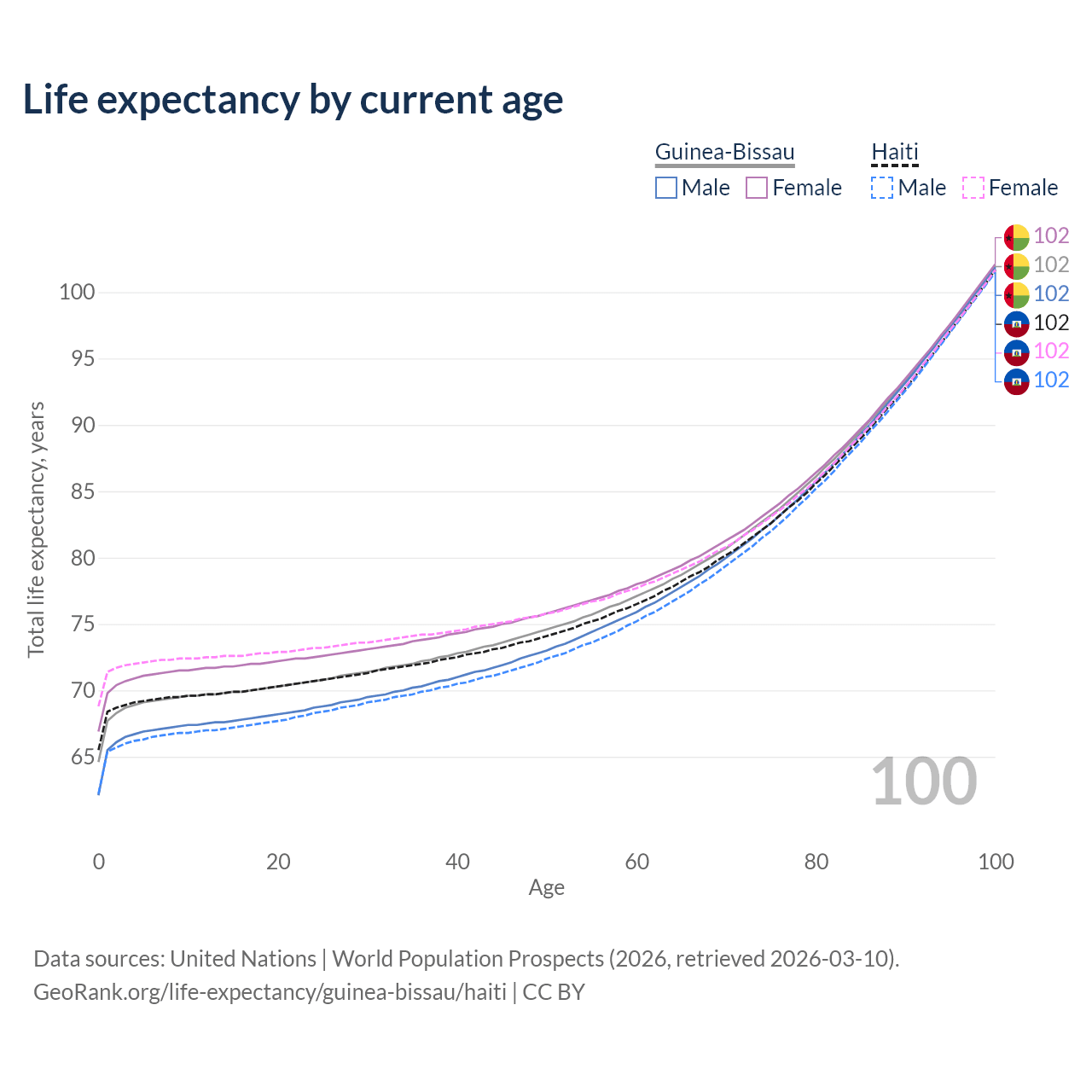 This life expectancy calculator shows the odds of living to 100, 95, 90, and below based on current age for both males and females in Guinea-Bissau and Haiti, along with mean and median age of death. The calculations are based on the 2026 life tables (actuarial tables) from the UN World Population Prospects.