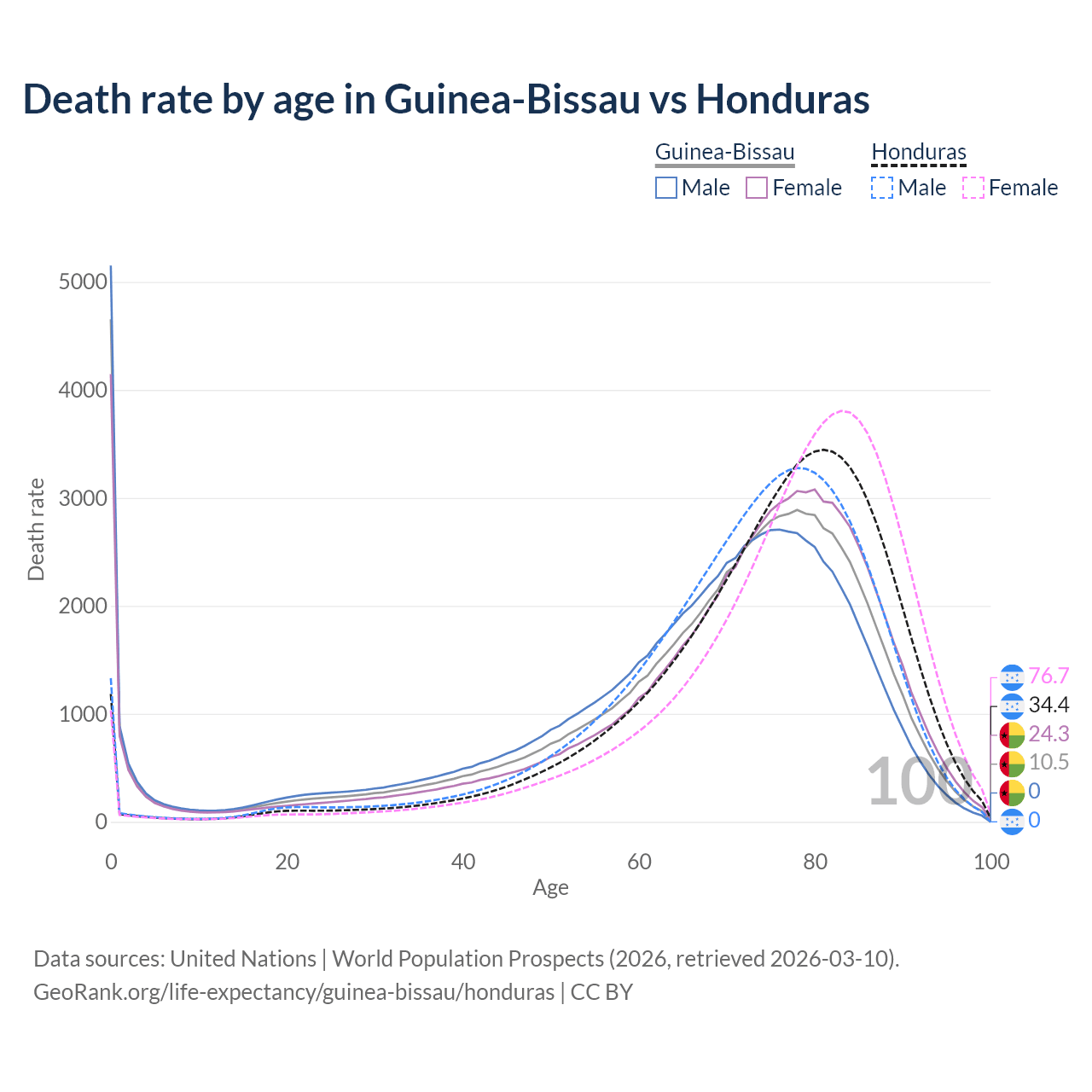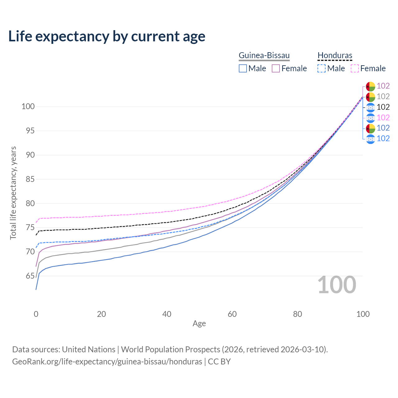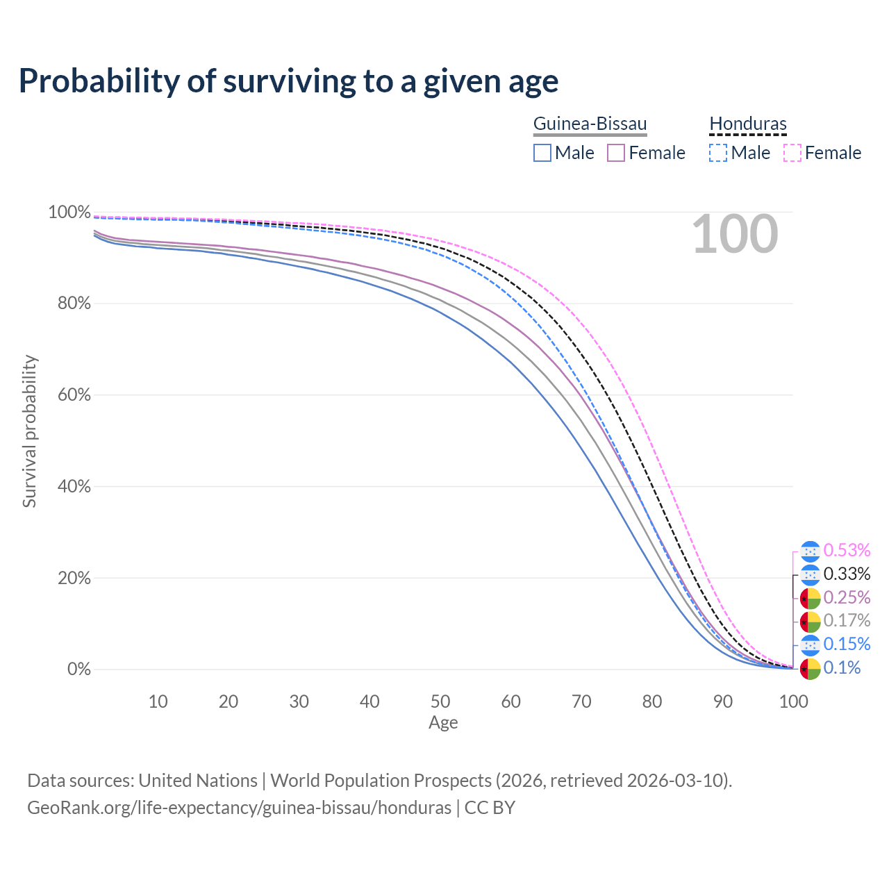 This life expectancy calculator shows the odds of living to 100, 95, 90, and below based on current age for both males and females in Guinea-Bissau and Honduras, along with mean and median age of death. The calculations are based on the 2026 life tables (actuarial tables) from the UN World Population Prospects.