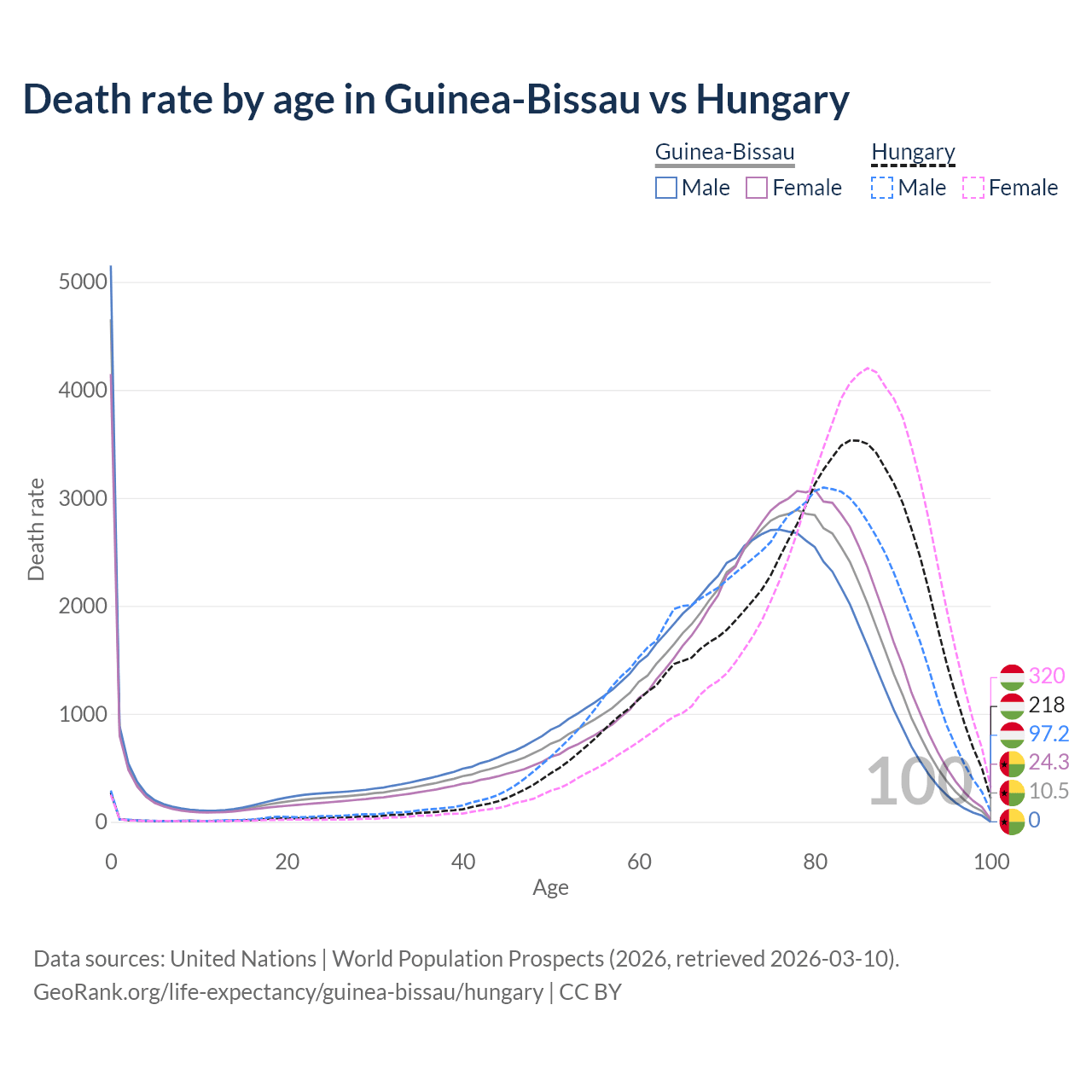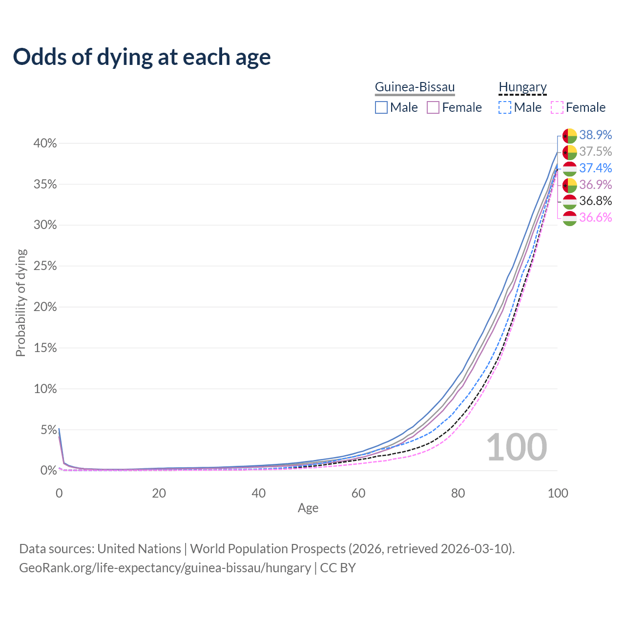 This life expectancy calculator shows the odds of living to 100, 95, 90, and below based on current age for both males and females in Guinea-Bissau and Hungary, along with mean and median age of death. The calculations are based on the 2026 life tables (actuarial tables) from the UN World Population Prospects.