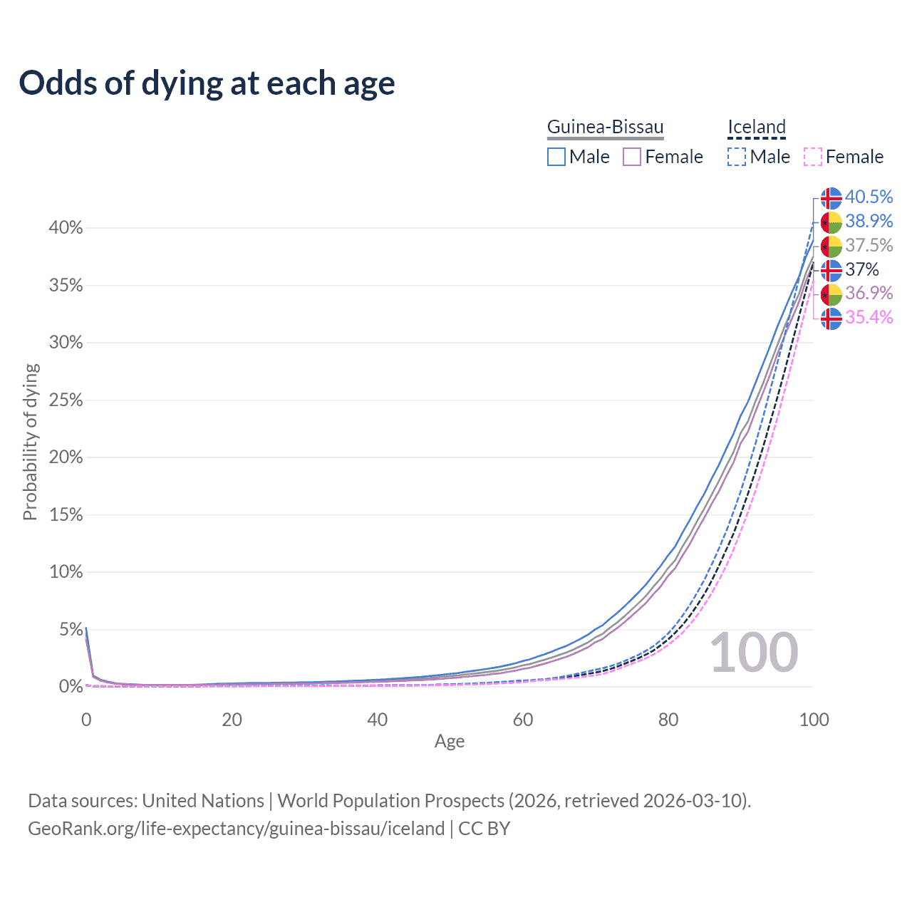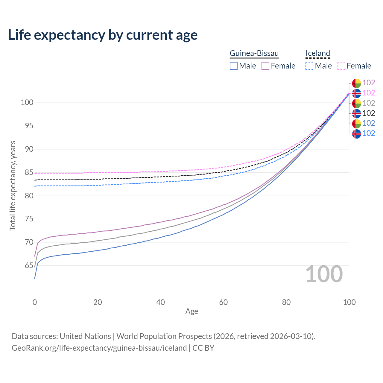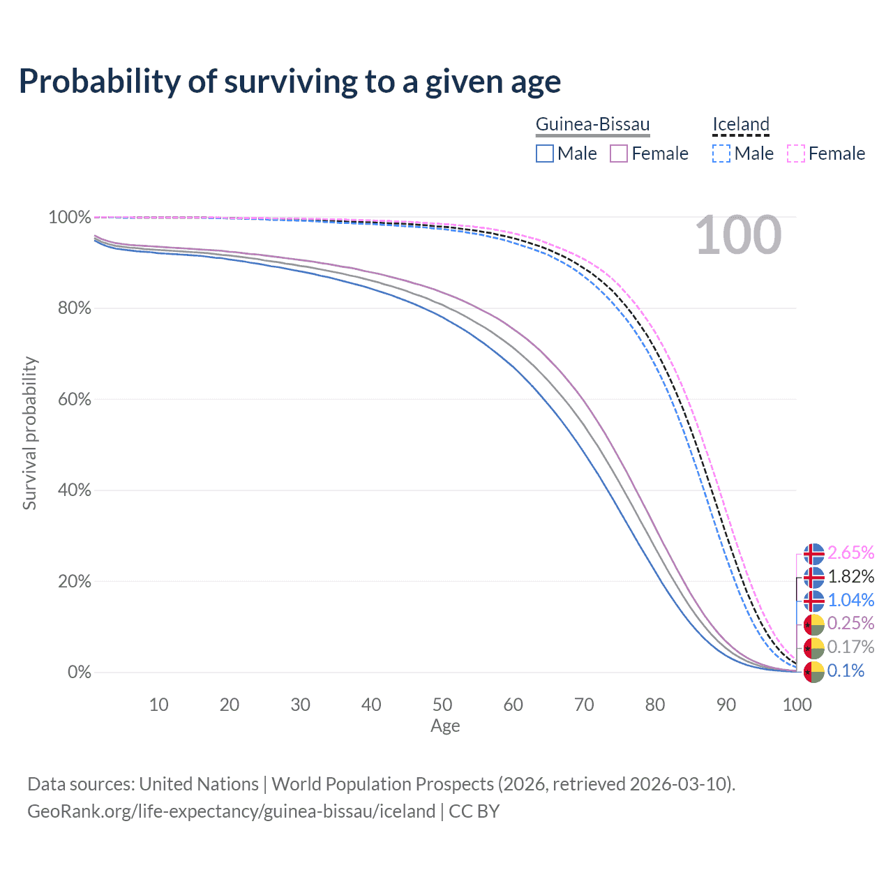This life expectancy calculator shows the odds of living to 100, 95, 90, and below based on current age for both males and females in Guinea-Bissau and Iceland, along with mean and median age of death. The calculations are based on the 2026 life tables (actuarial tables) from the UN World Population Prospects.