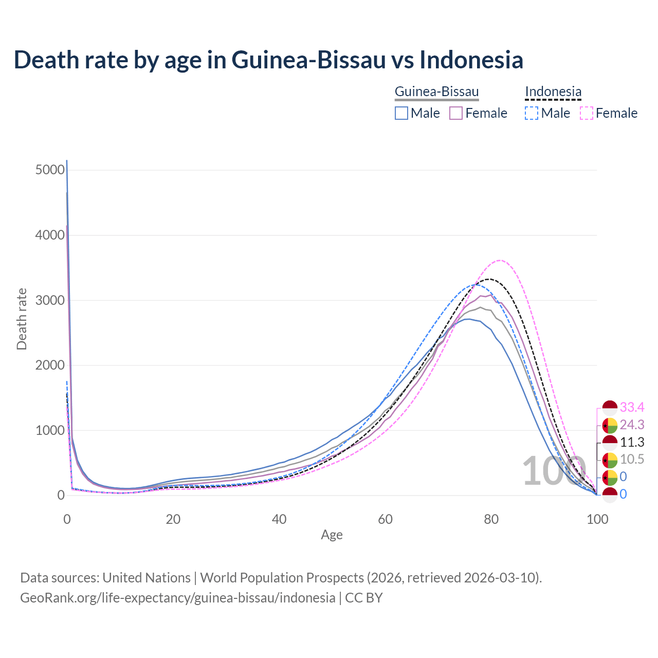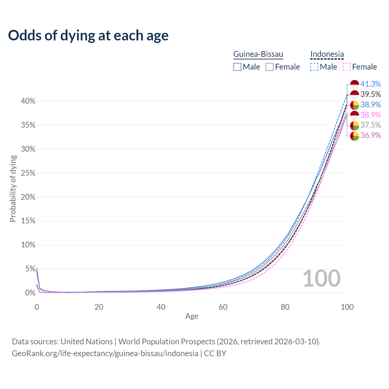This life expectancy calculator shows the odds of living to 100, 95, 90, and below based on current age for both males and females in Guinea-Bissau and Indonesia, along with mean and median age of death. The calculations are based on the 2026 life tables (actuarial tables) from the UN World Population Prospects.