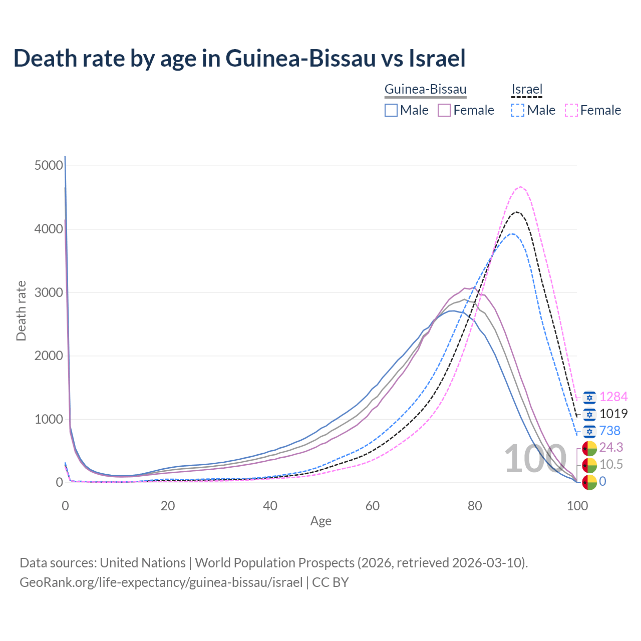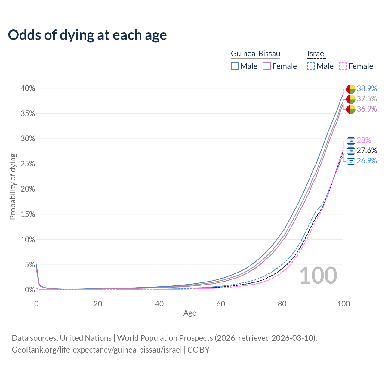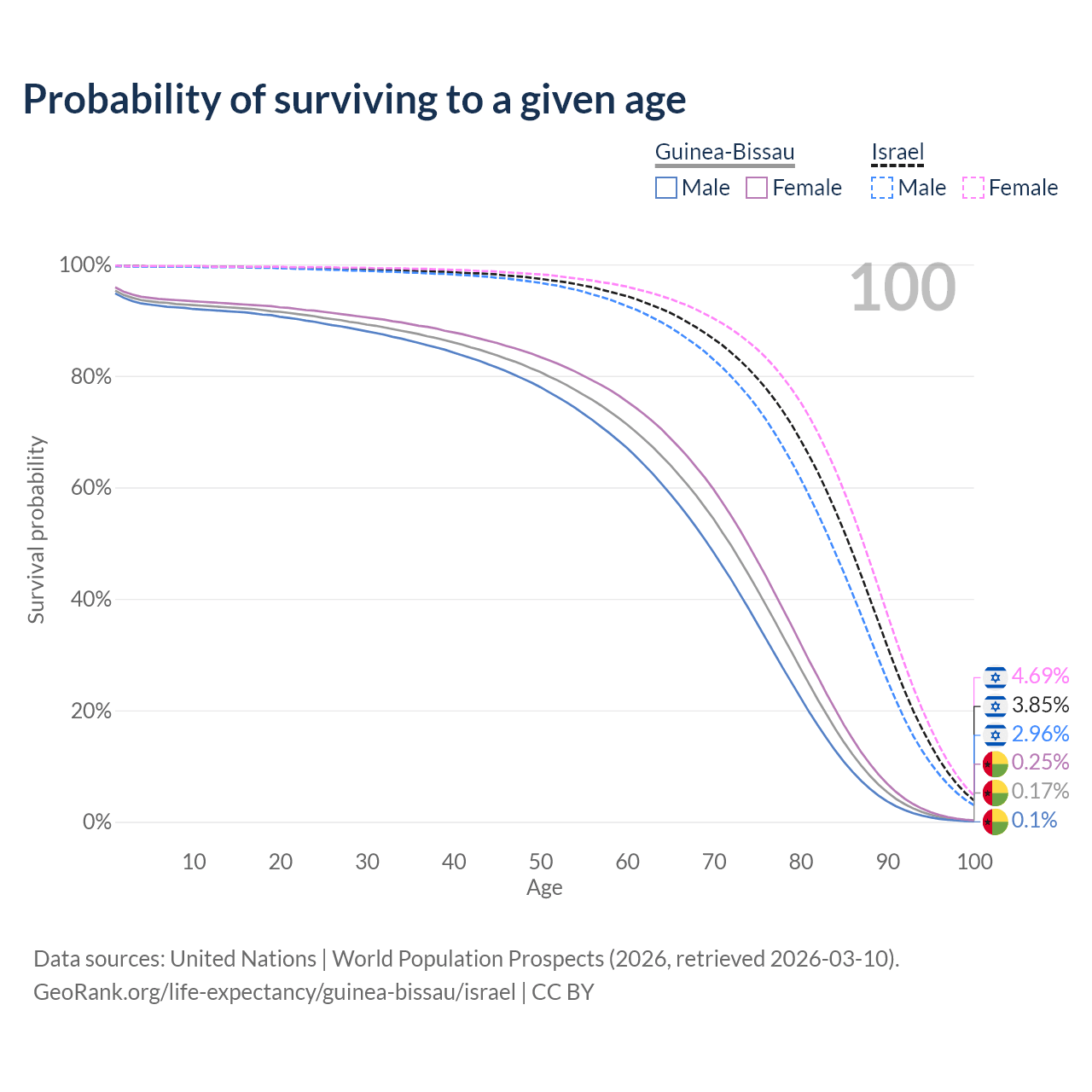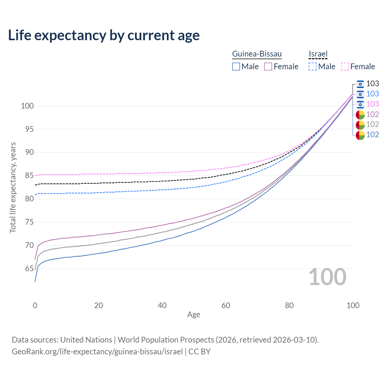 This life expectancy calculator shows the odds of living to 100, 95, 90, and below based on current age for both males and females in Guinea-Bissau and Israel, along with mean and median age of death. The calculations are based on the 2026 life tables (actuarial tables) from the UN World Population Prospects.