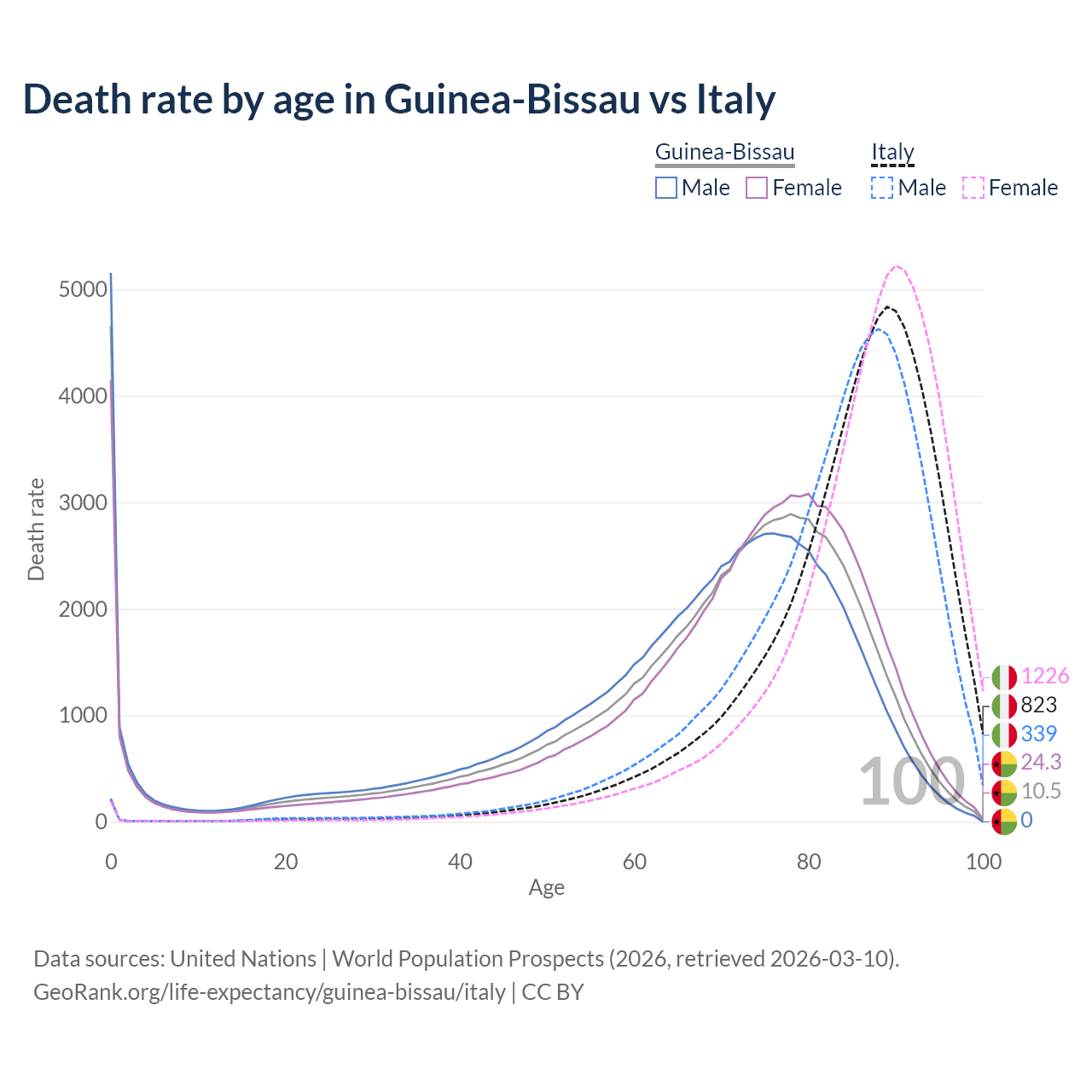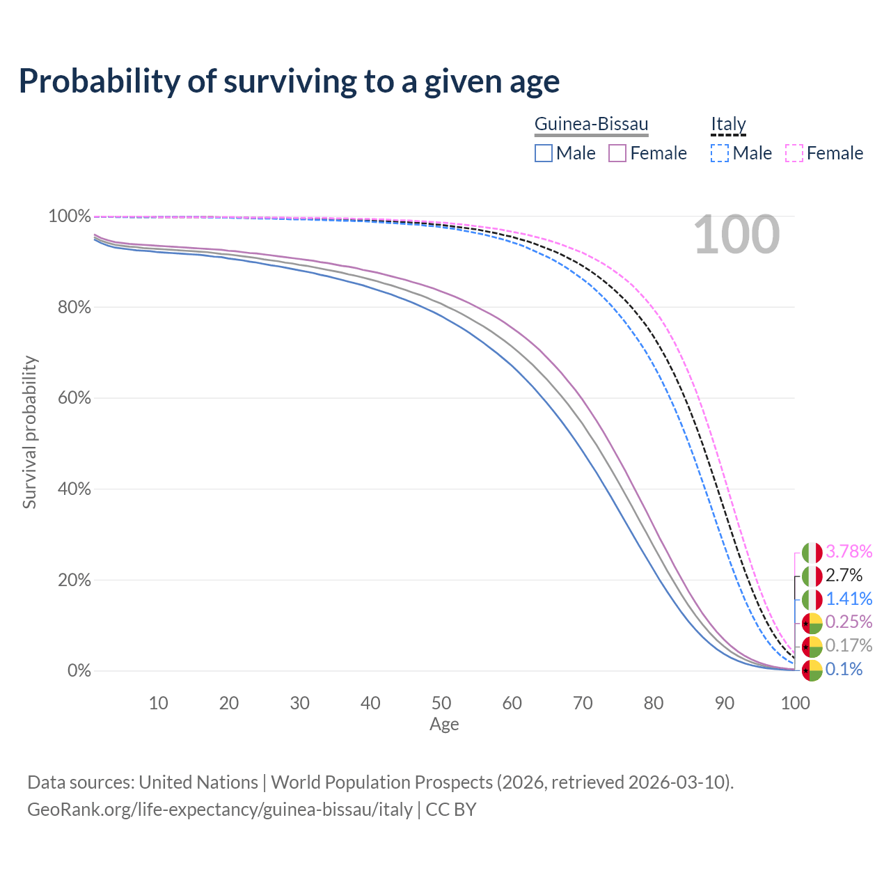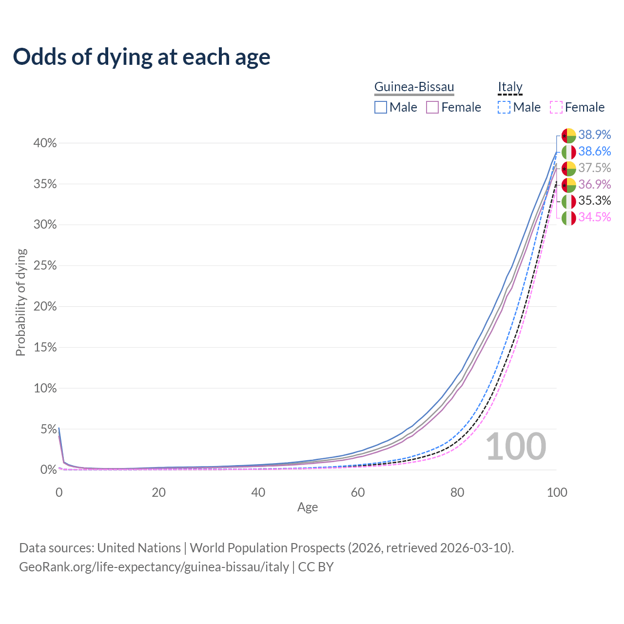 This life expectancy calculator shows the odds of living to 100, 95, 90, and below based on current age for both males and females in Guinea-Bissau and Italy, along with mean and median age of death. The calculations are based on the 2026 life tables (actuarial tables) from the UN World Population Prospects.