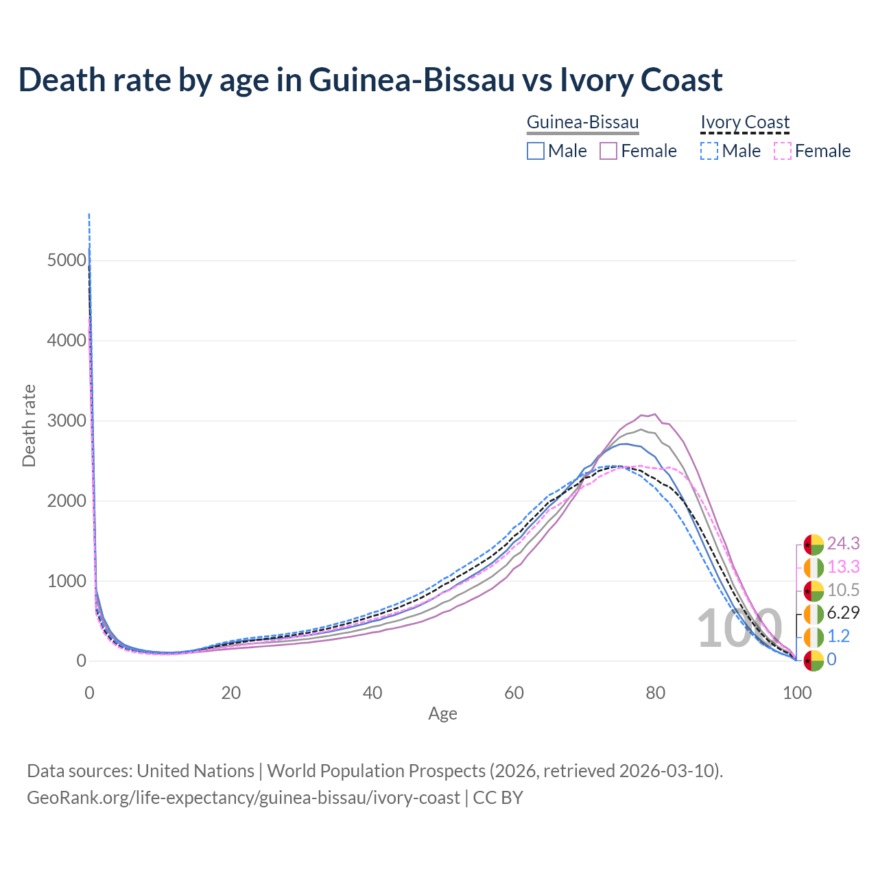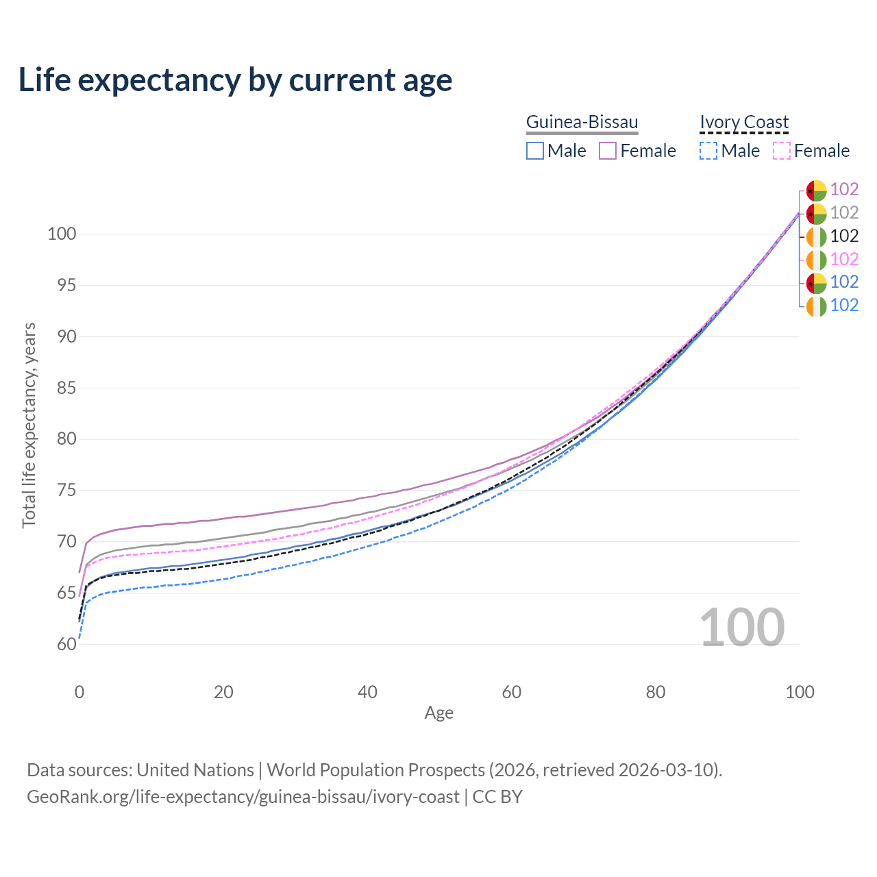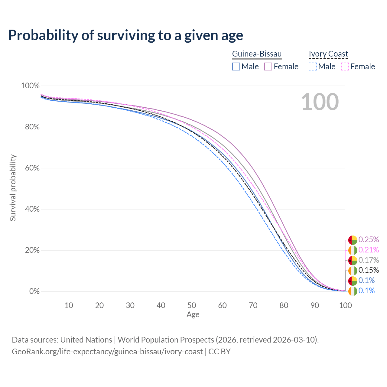 This life expectancy calculator shows the odds of living to 100, 95, 90, and below based on current age for both males and females in Guinea-Bissau and Ivory Coast, along with mean and median age of death. The calculations are based on the 2026 life tables (actuarial tables) from the UN World Population Prospects.
