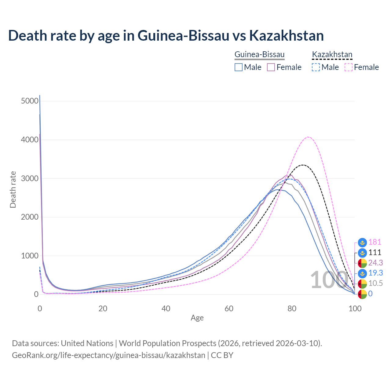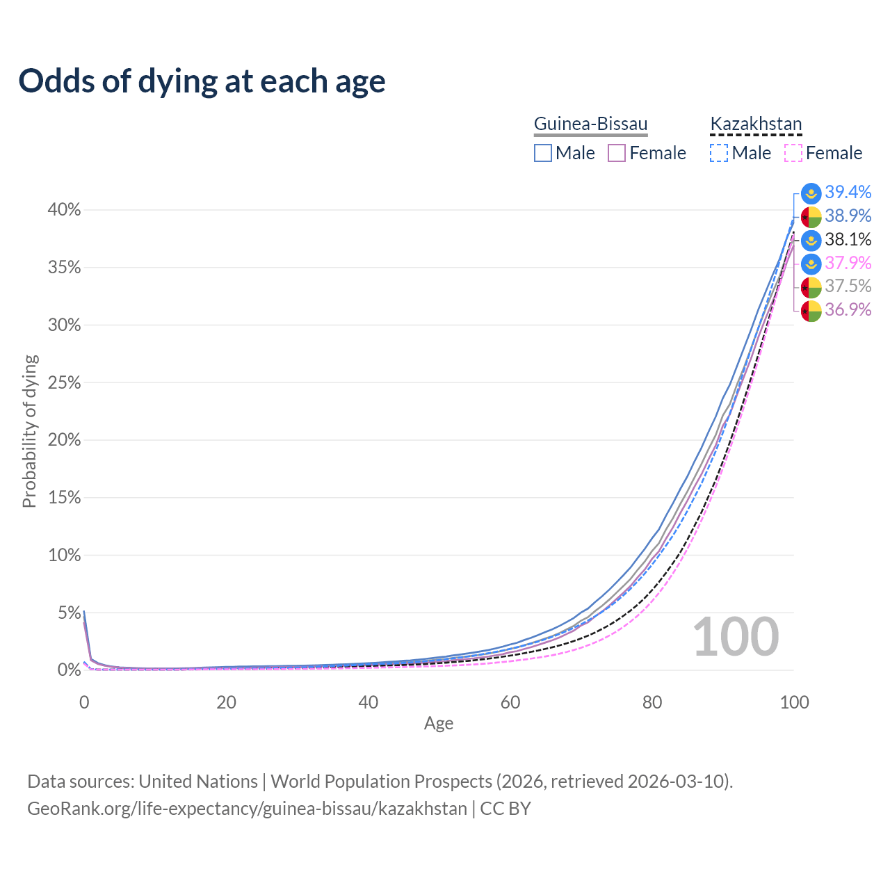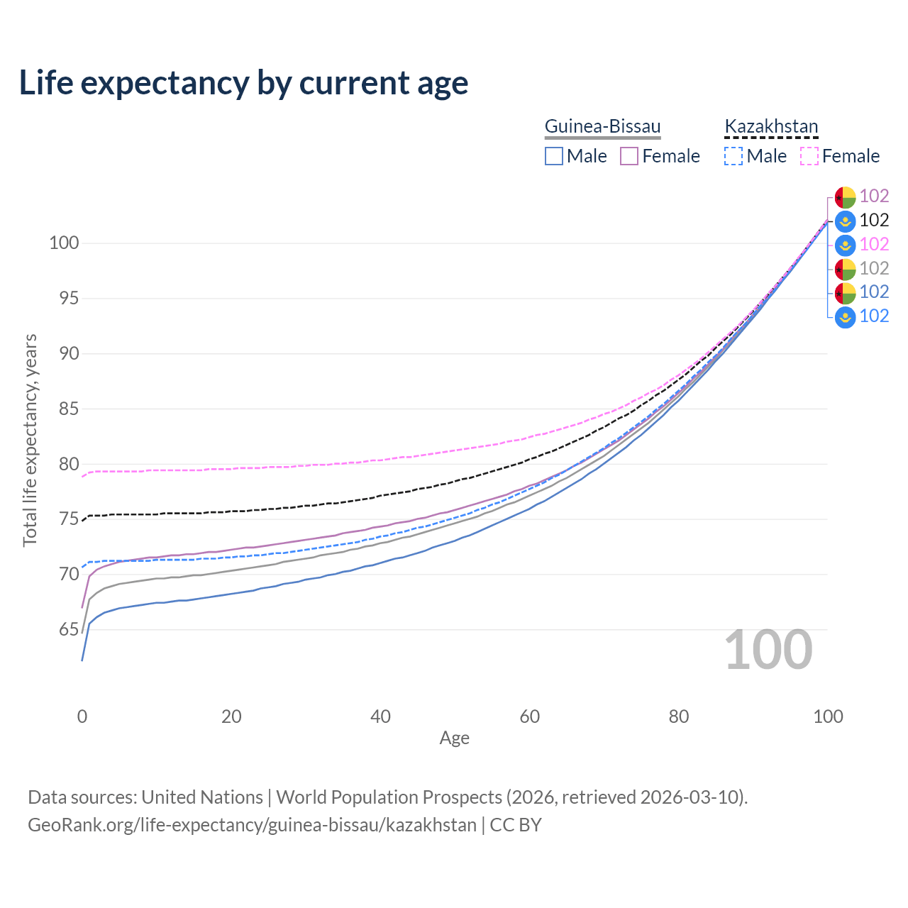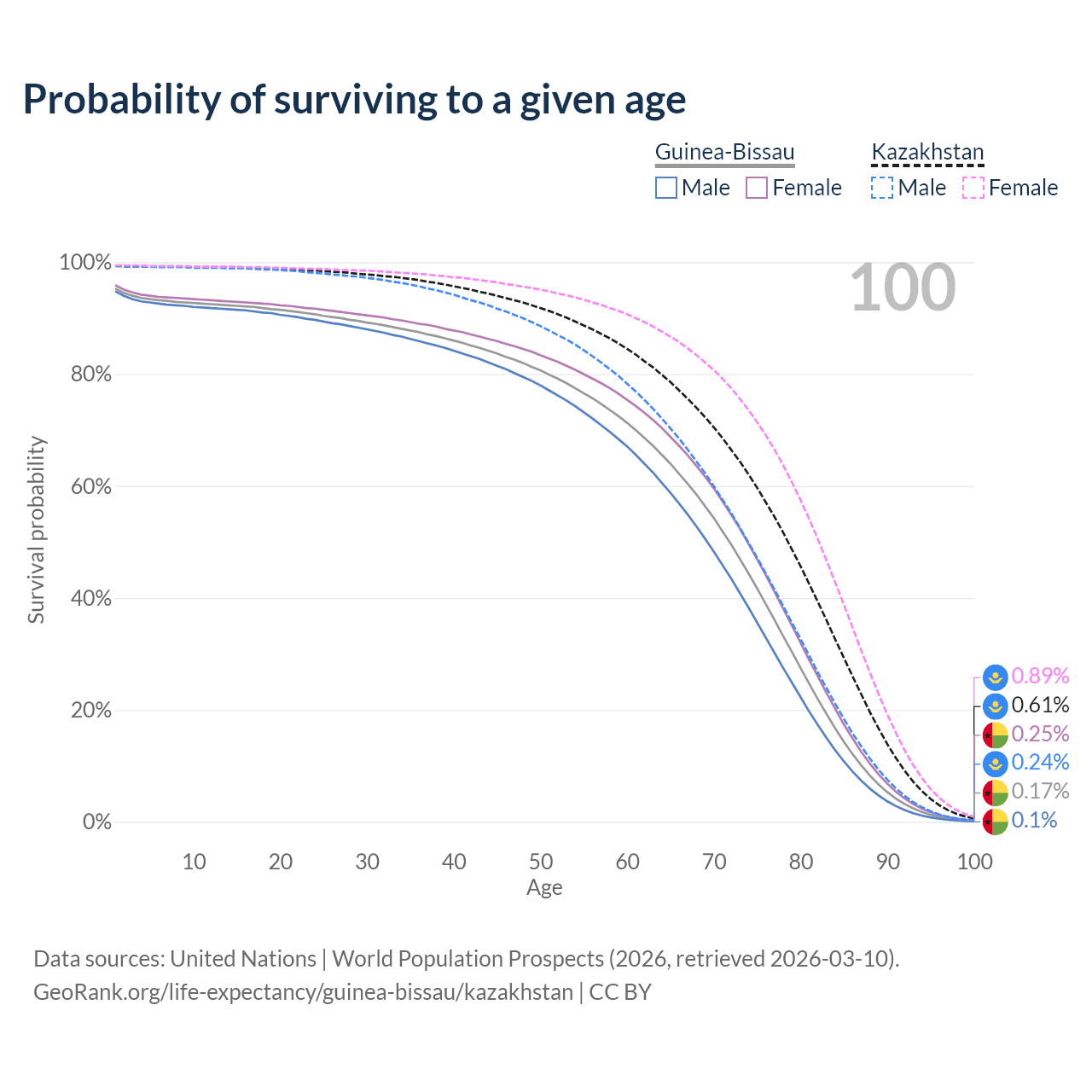 This life expectancy calculator shows the odds of living to 100, 95, 90, and below based on current age for both males and females in Guinea-Bissau and Kazakhstan, along with mean and median age of death. The calculations are based on the 2026 life tables (actuarial tables) from the UN World Population Prospects.