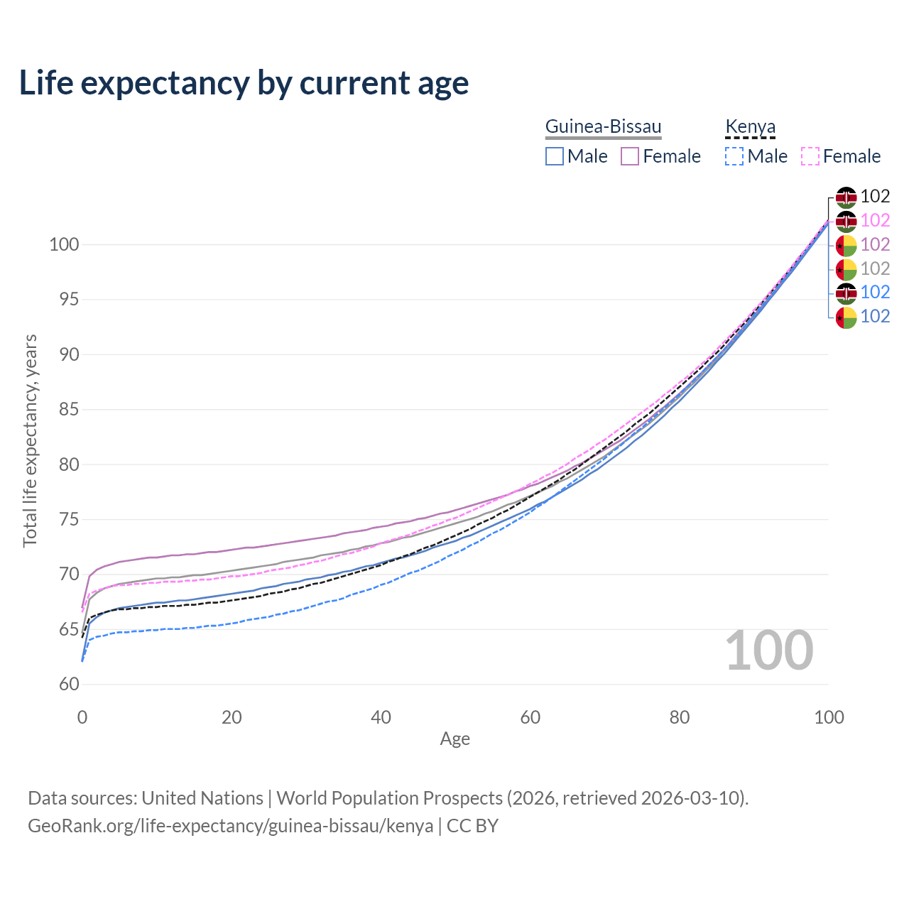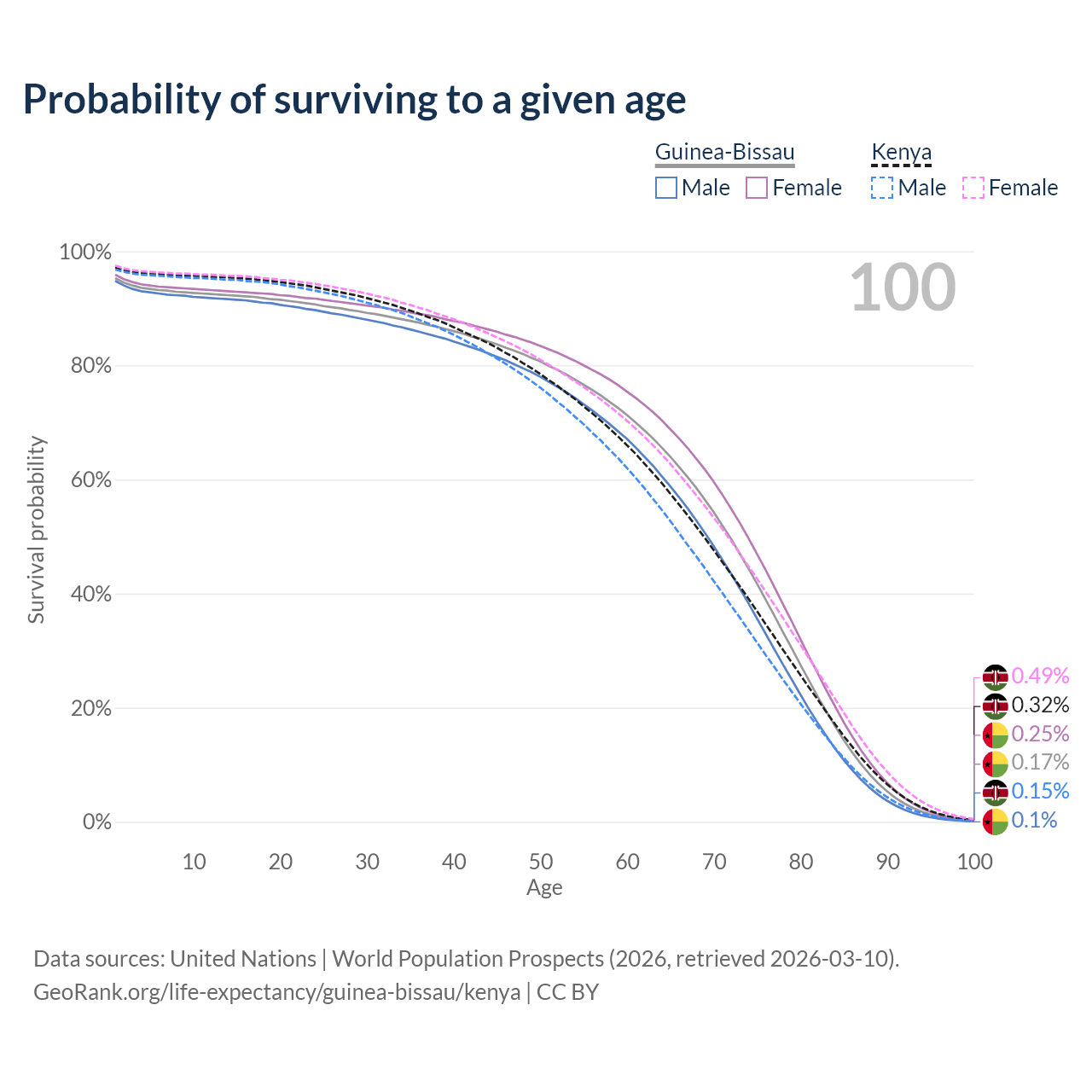 This life expectancy calculator shows the odds of living to 100, 95, 90, and below based on current age for both males and females in Guinea-Bissau and Kenya, along with mean and median age of death. The calculations are based on the 2026 life tables (actuarial tables) from the UN World Population Prospects.