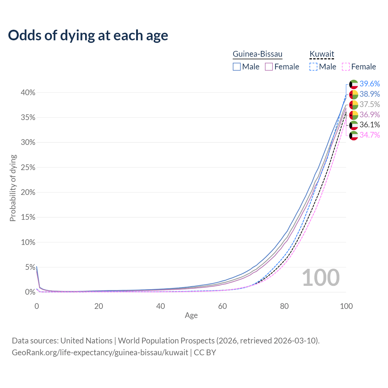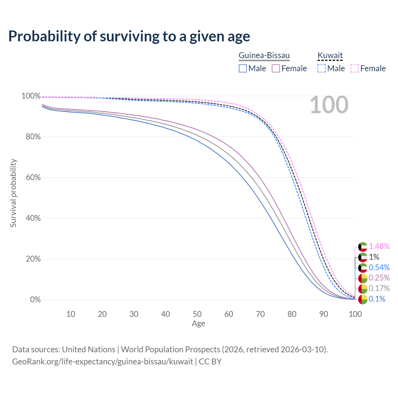 This life expectancy calculator shows the odds of living to 100, 95, 90, and below based on current age for both males and females in Guinea-Bissau and Kuwait, along with mean and median age of death. The calculations are based on the 2026 life tables (actuarial tables) from the UN World Population Prospects.