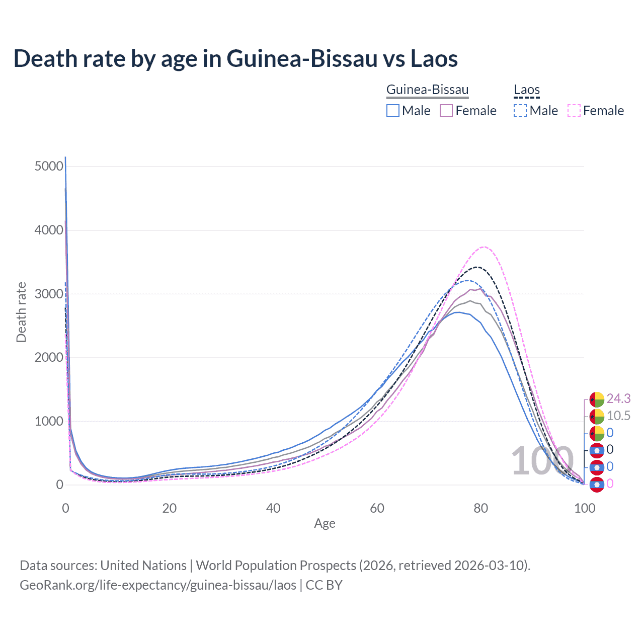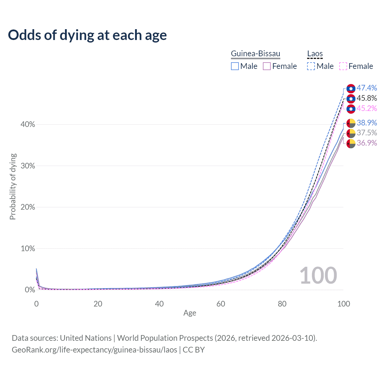 This life expectancy calculator shows the odds of living to 100, 95, 90, and below based on current age for both males and females in Guinea-Bissau and Laos, along with mean and median age of death. The calculations are based on the 2026 life tables (actuarial tables) from the UN World Population Prospects.