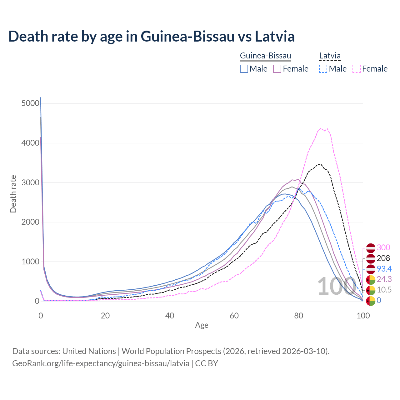 This life expectancy calculator shows the odds of living to 100, 95, 90, and below based on current age for both males and females in Guinea-Bissau and Latvia, along with mean and median age of death. The calculations are based on the 2026 life tables (actuarial tables) from the UN World Population Prospects.