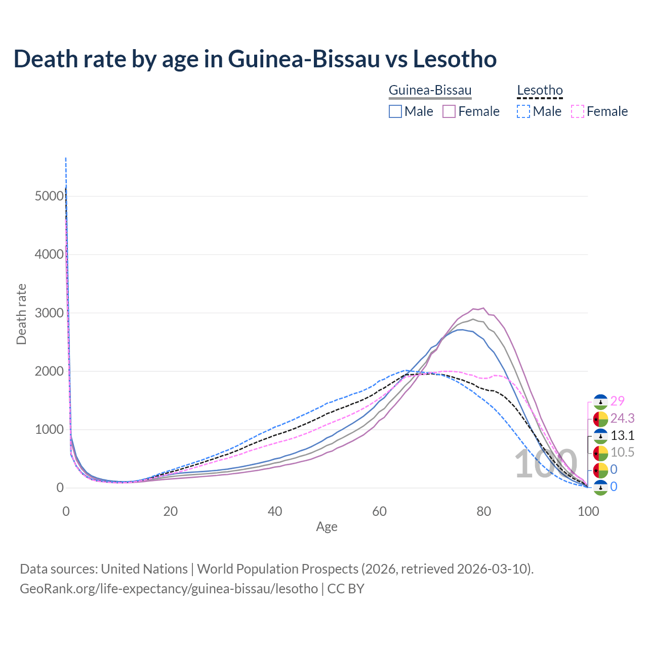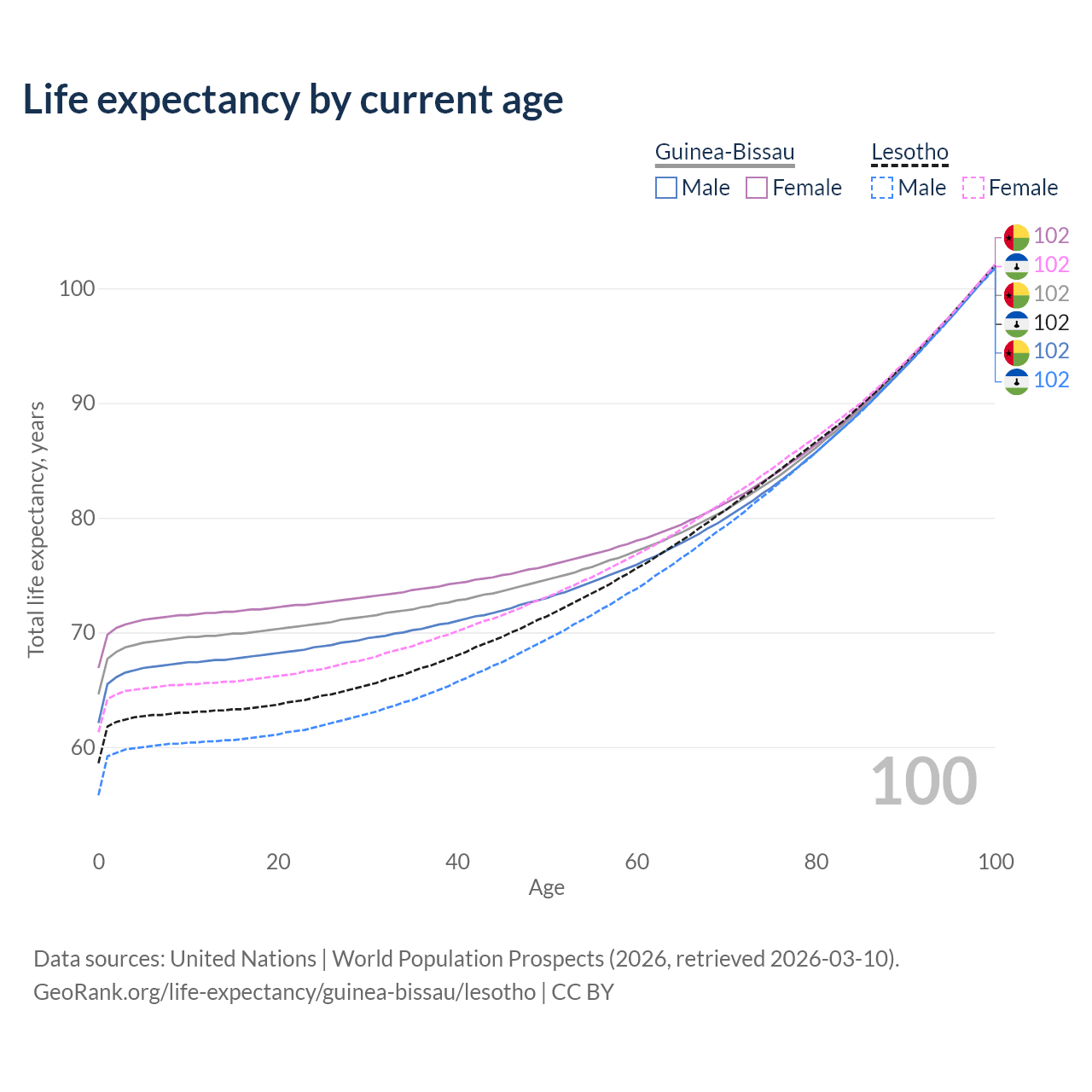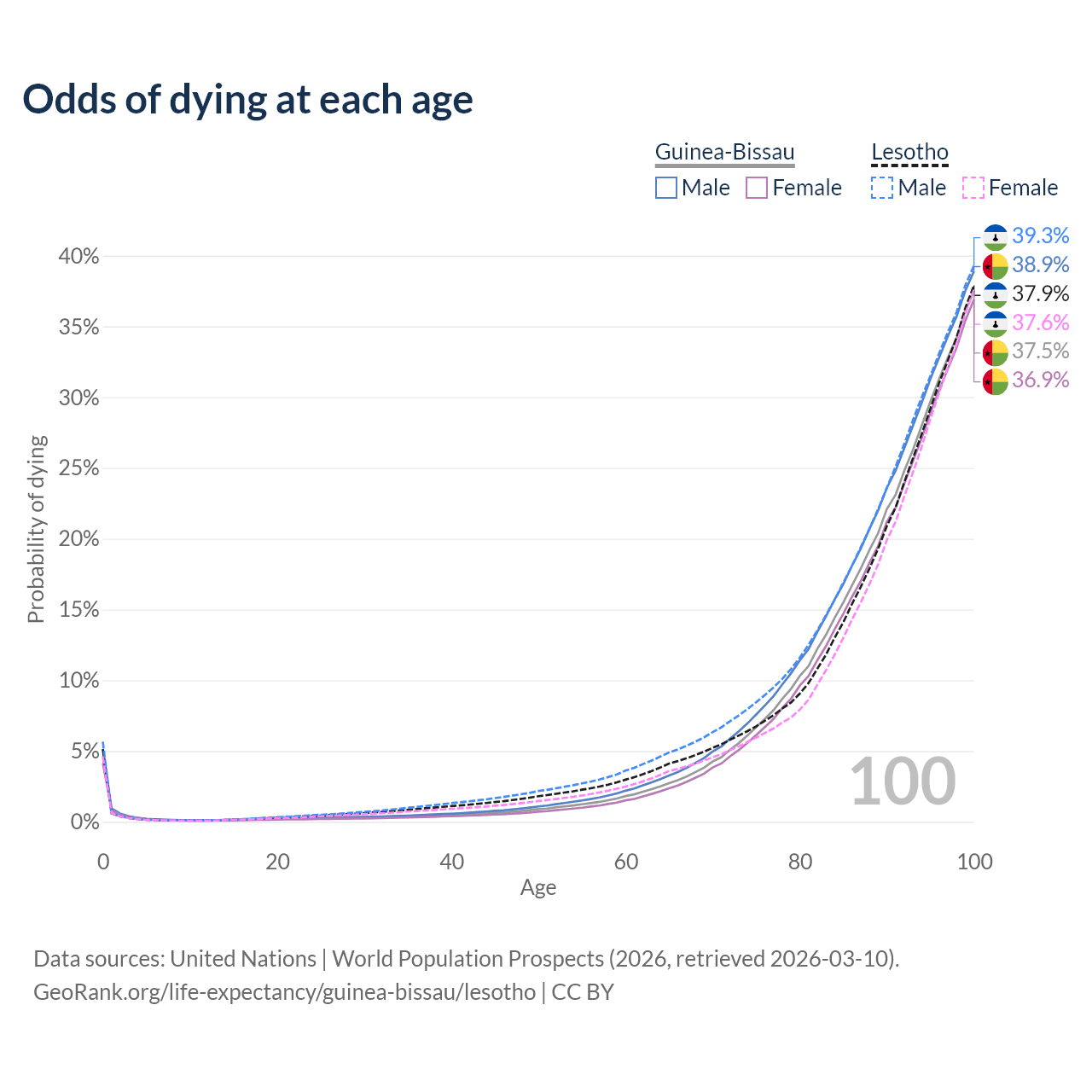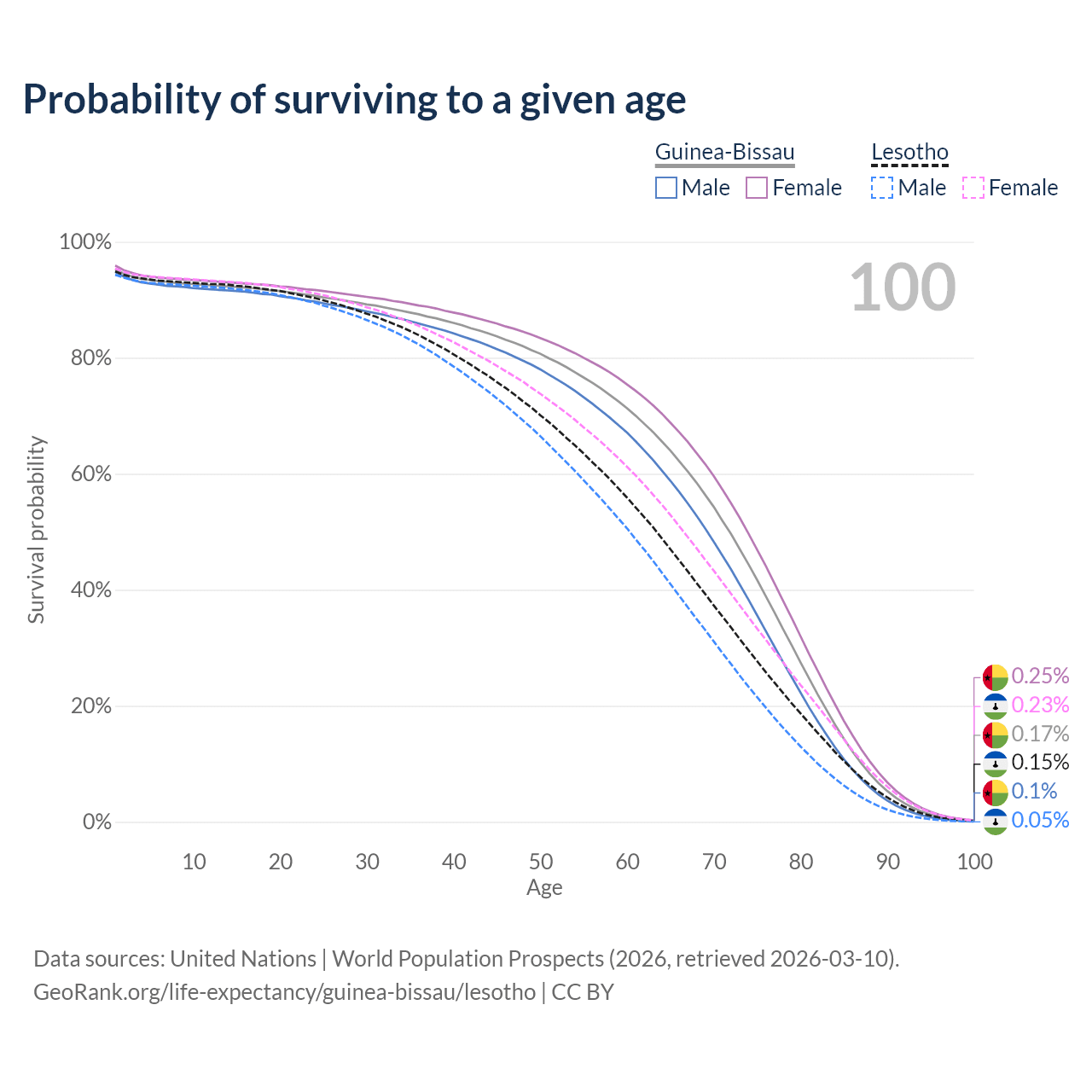 This life expectancy calculator shows the odds of living to 100, 95, 90, and below based on current age for both males and females in Guinea-Bissau and Lesotho, along with mean and median age of death. The calculations are based on the 2026 life tables (actuarial tables) from the UN World Population Prospects.