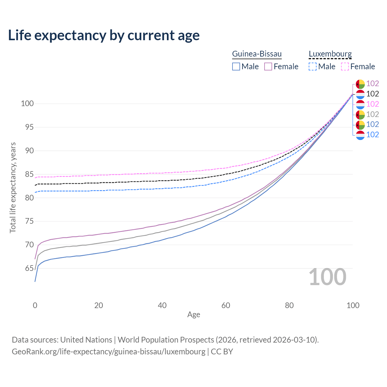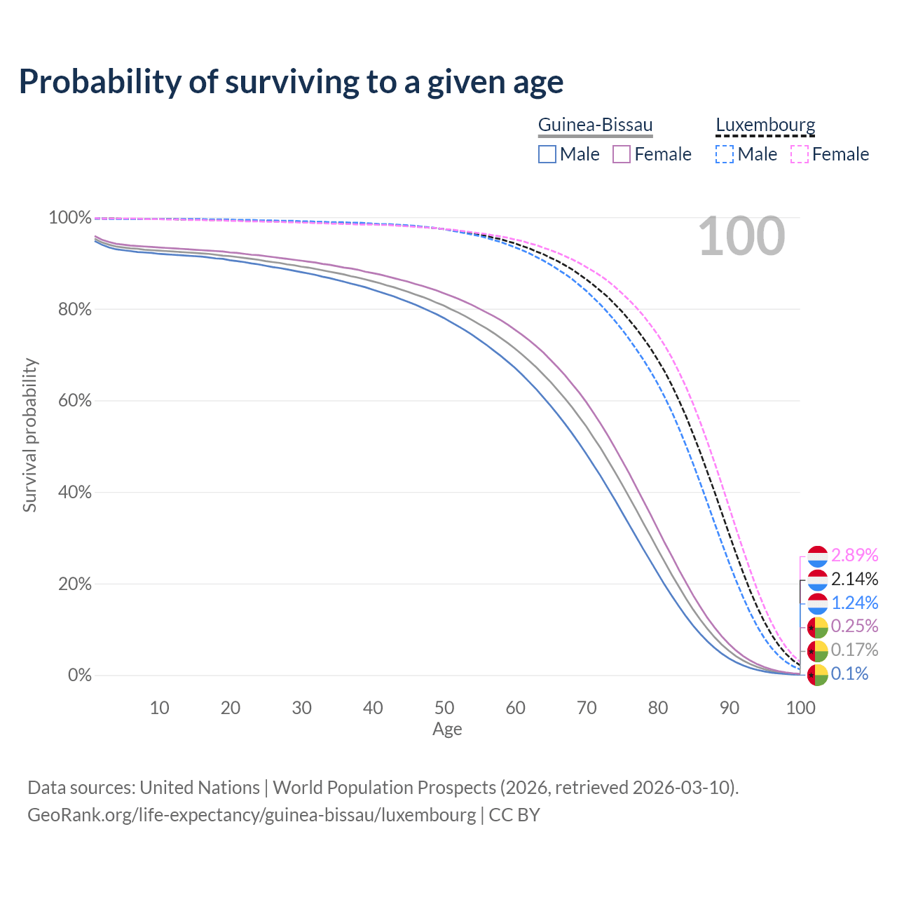 This life expectancy calculator shows the odds of living to 100, 95, 90, and below based on current age for both males and females in Guinea-Bissau and Luxembourg, along with mean and median age of death. The calculations are based on the 2026 life tables (actuarial tables) from the UN World Population Prospects.