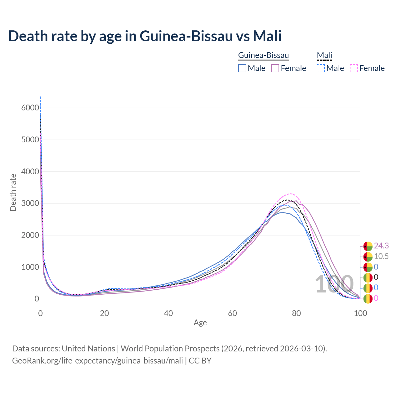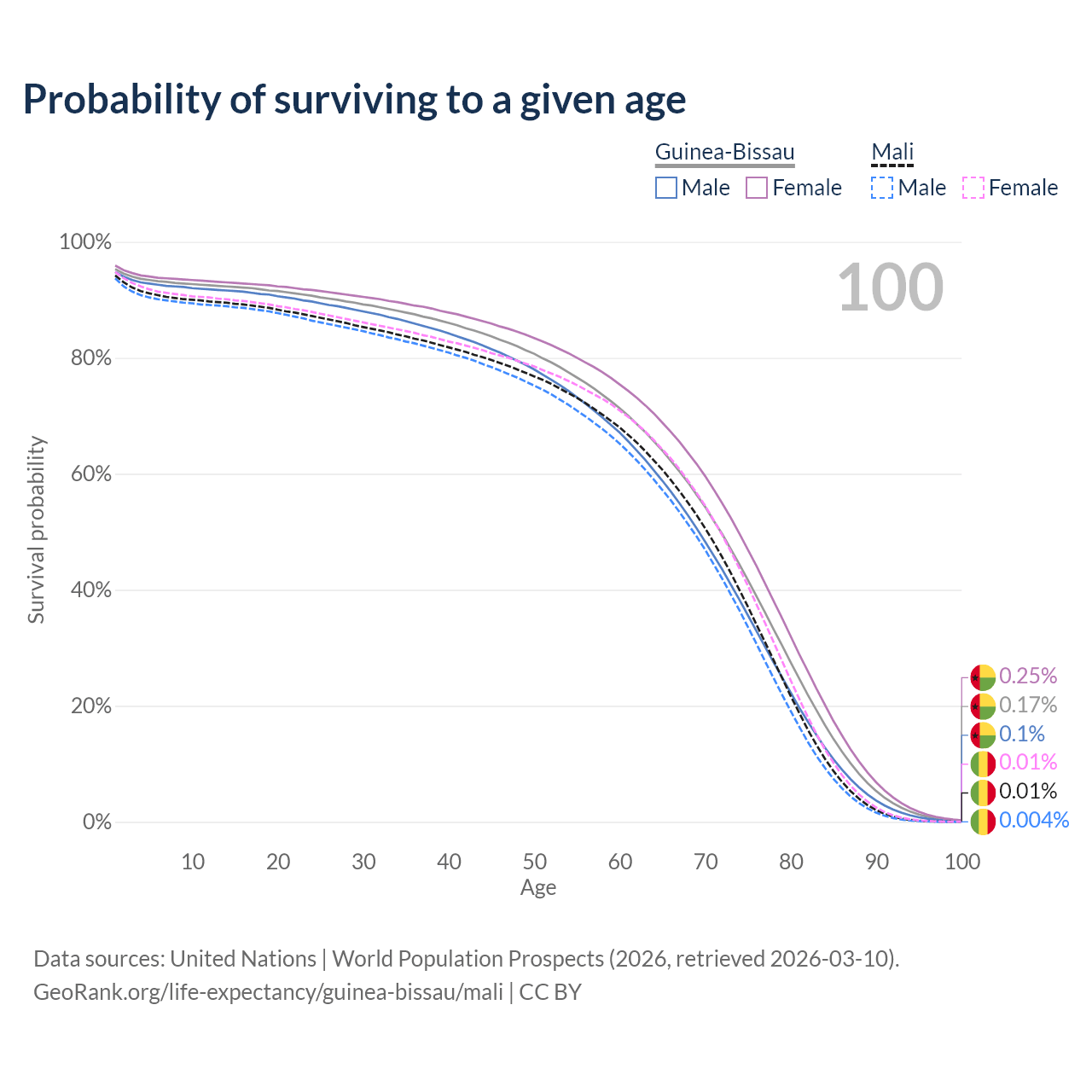 This life expectancy calculator shows the odds of living to 100, 95, 90, and below based on current age for both males and females in Guinea-Bissau and Mali, along with mean and median age of death. The calculations are based on the 2026 life tables (actuarial tables) from the UN World Population Prospects.