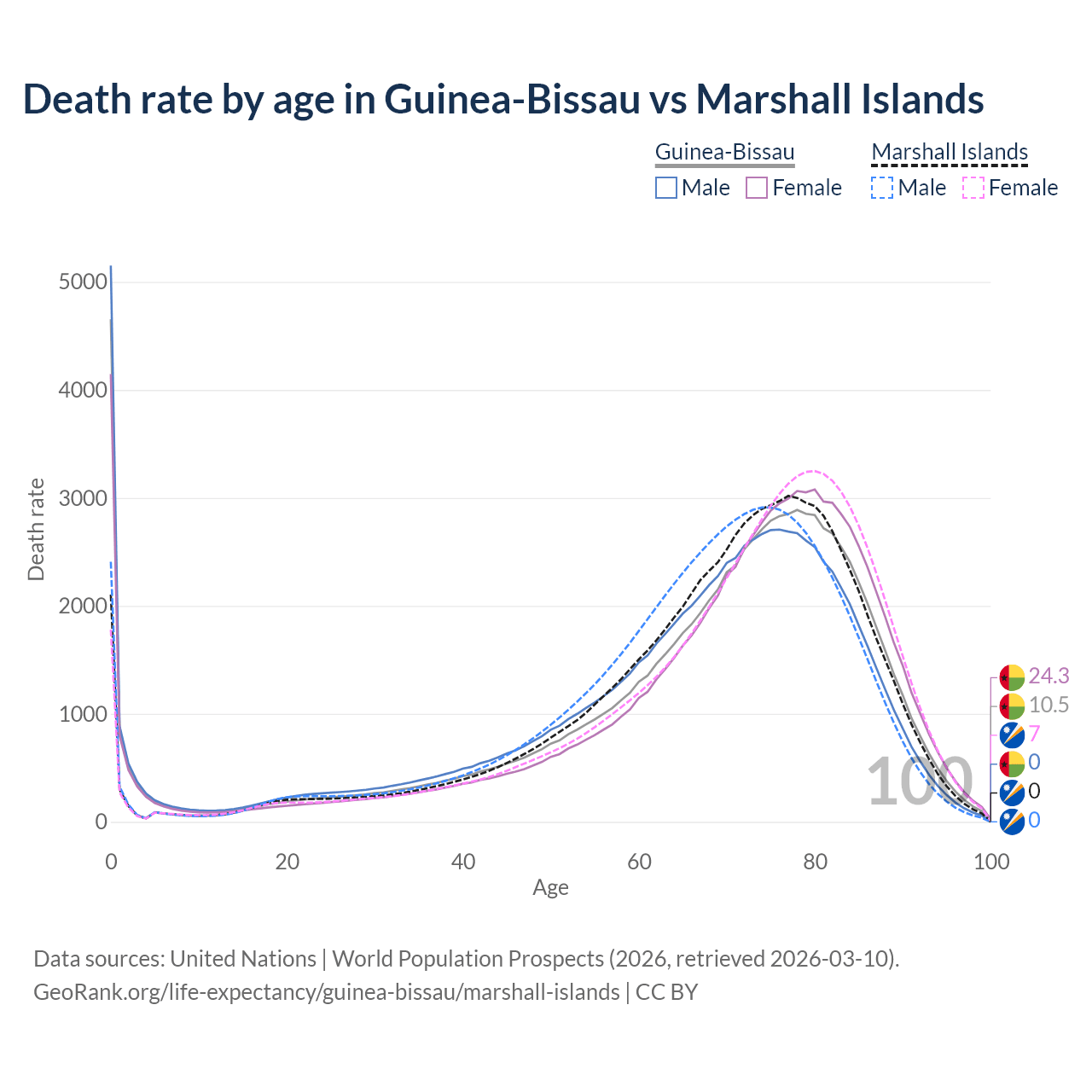 In Guinea-Bissau, the most common age of death is 0, compared to 77 in the Marshall Islands. The median age of death is 71.8 in Guinea-Bissau and 72 in the Marshall Islands, meaning only half of each cohort is expected to live past that age.