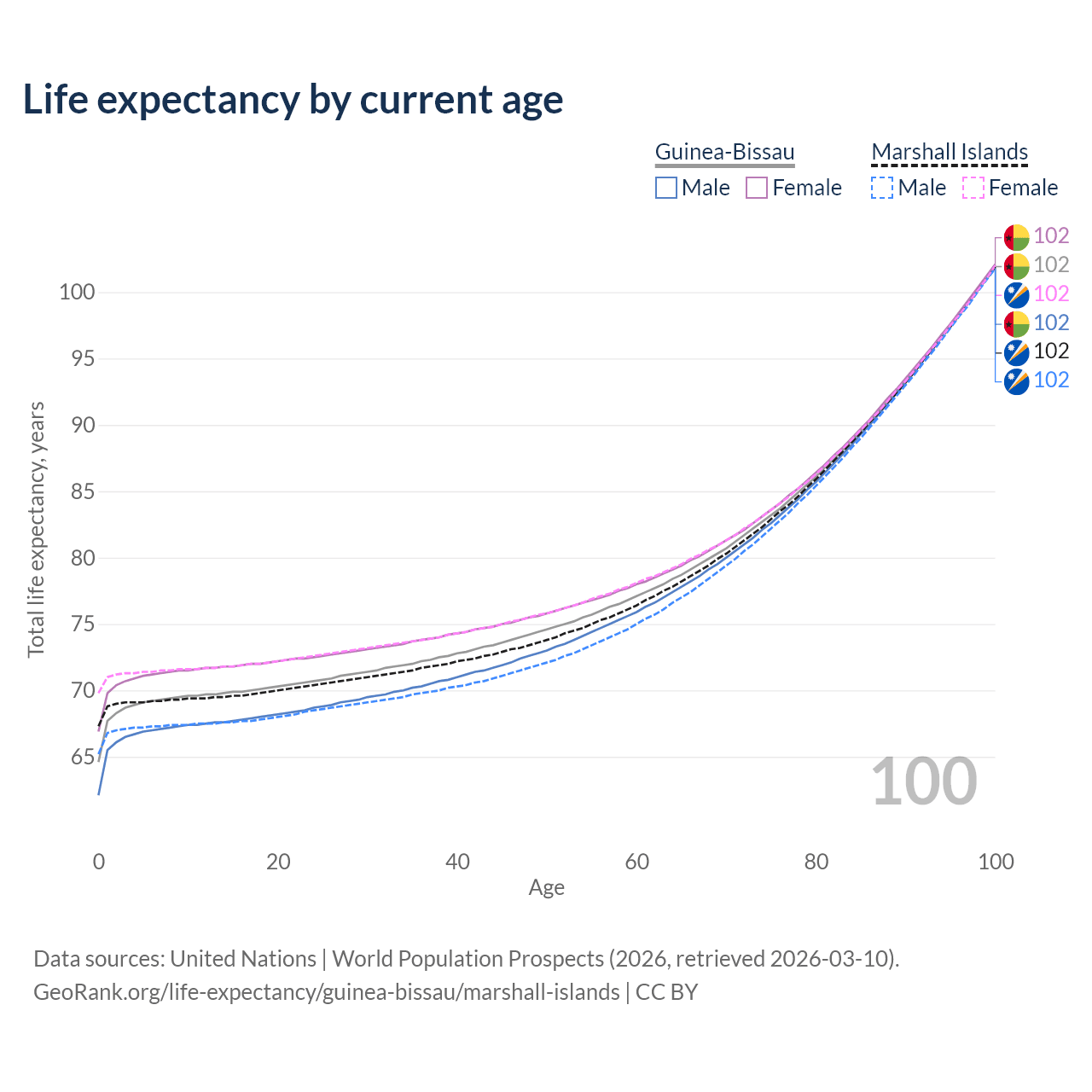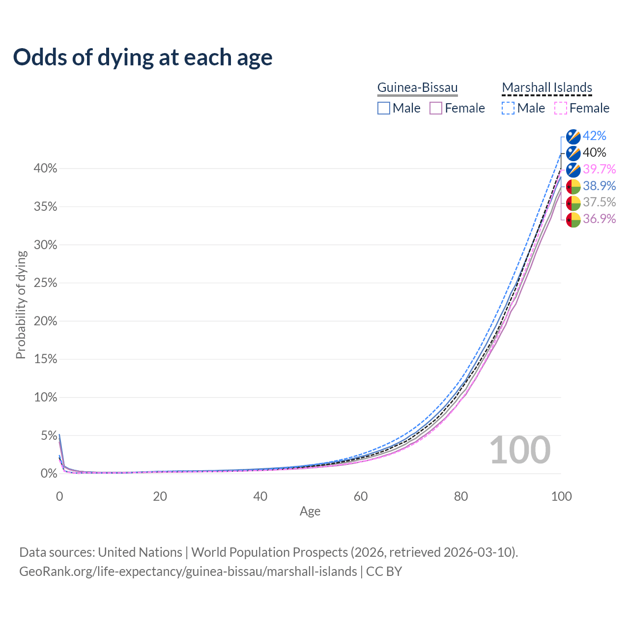 This life expectancy calculator shows the odds of living to 100, 95, 90, and below based on current age for both males and females in Guinea-Bissau and the Marshall Islands, along with mean and median age of death. The calculations are based on the 2026 life tables (actuarial tables) from the UN World Population Prospects.