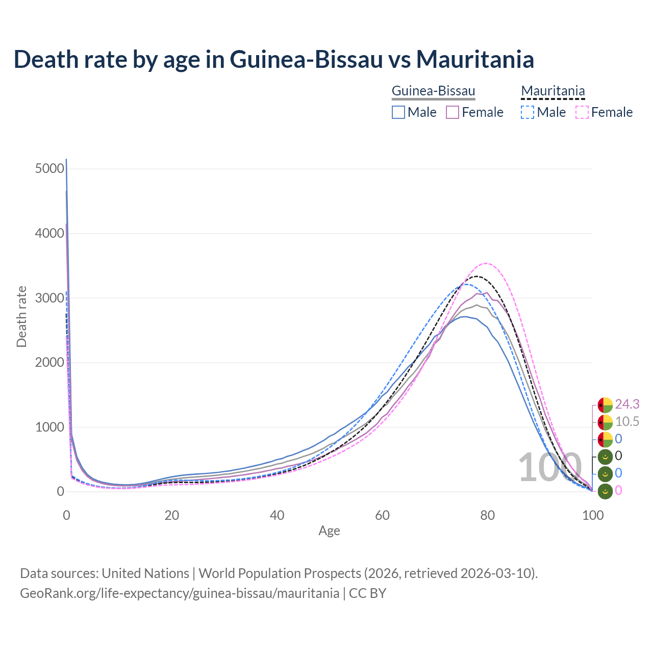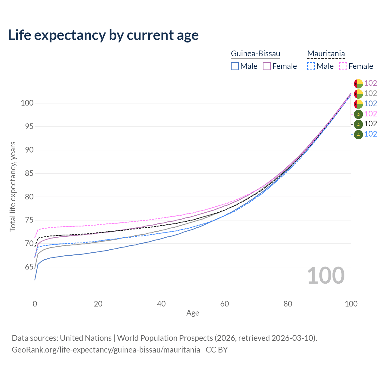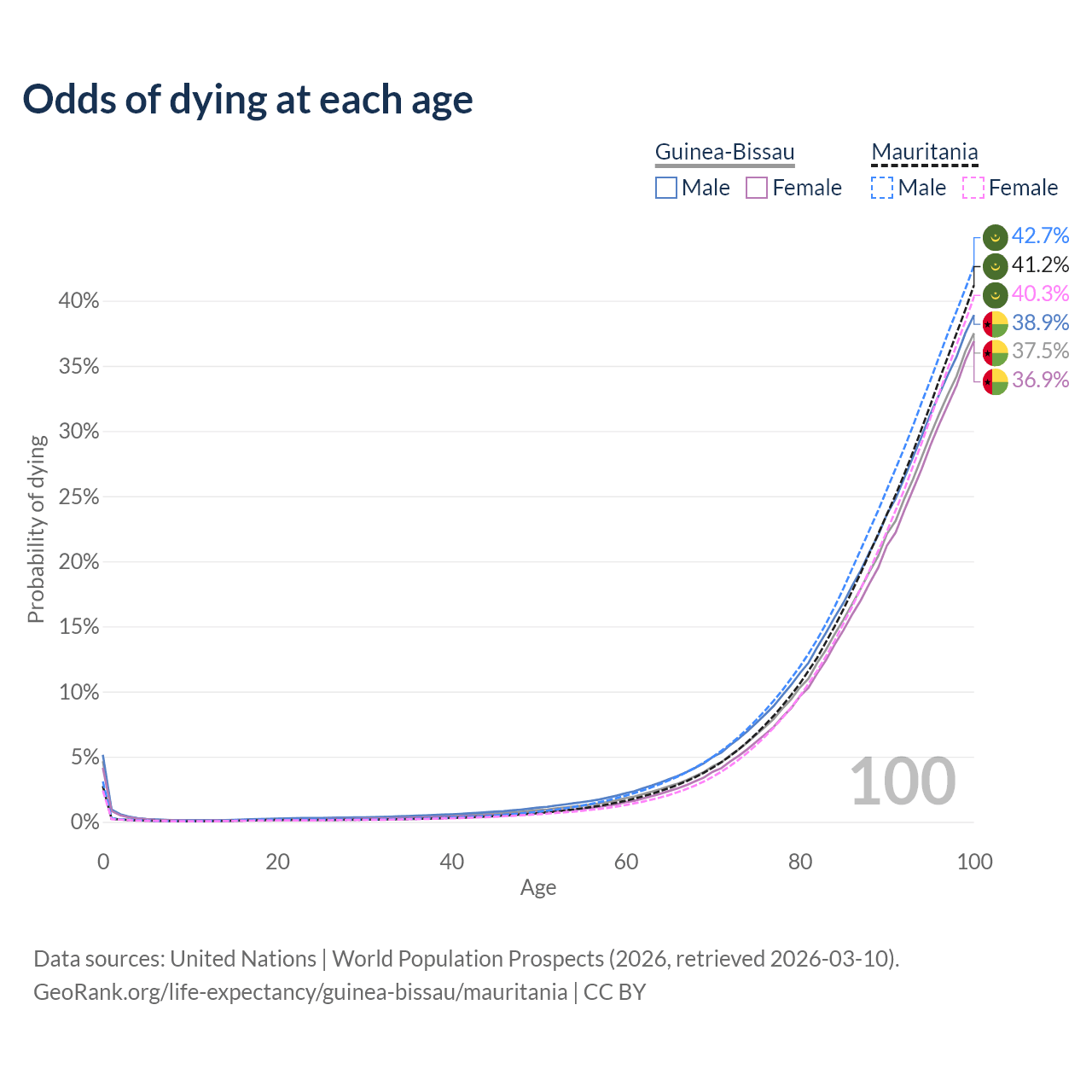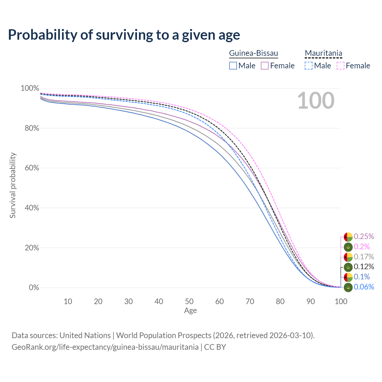 This life expectancy calculator shows the odds of living to 100, 95, 90, and below based on current age for both males and females in Guinea-Bissau and Mauritania, along with mean and median age of death. The calculations are based on the 2026 life tables (actuarial tables) from the UN World Population Prospects.