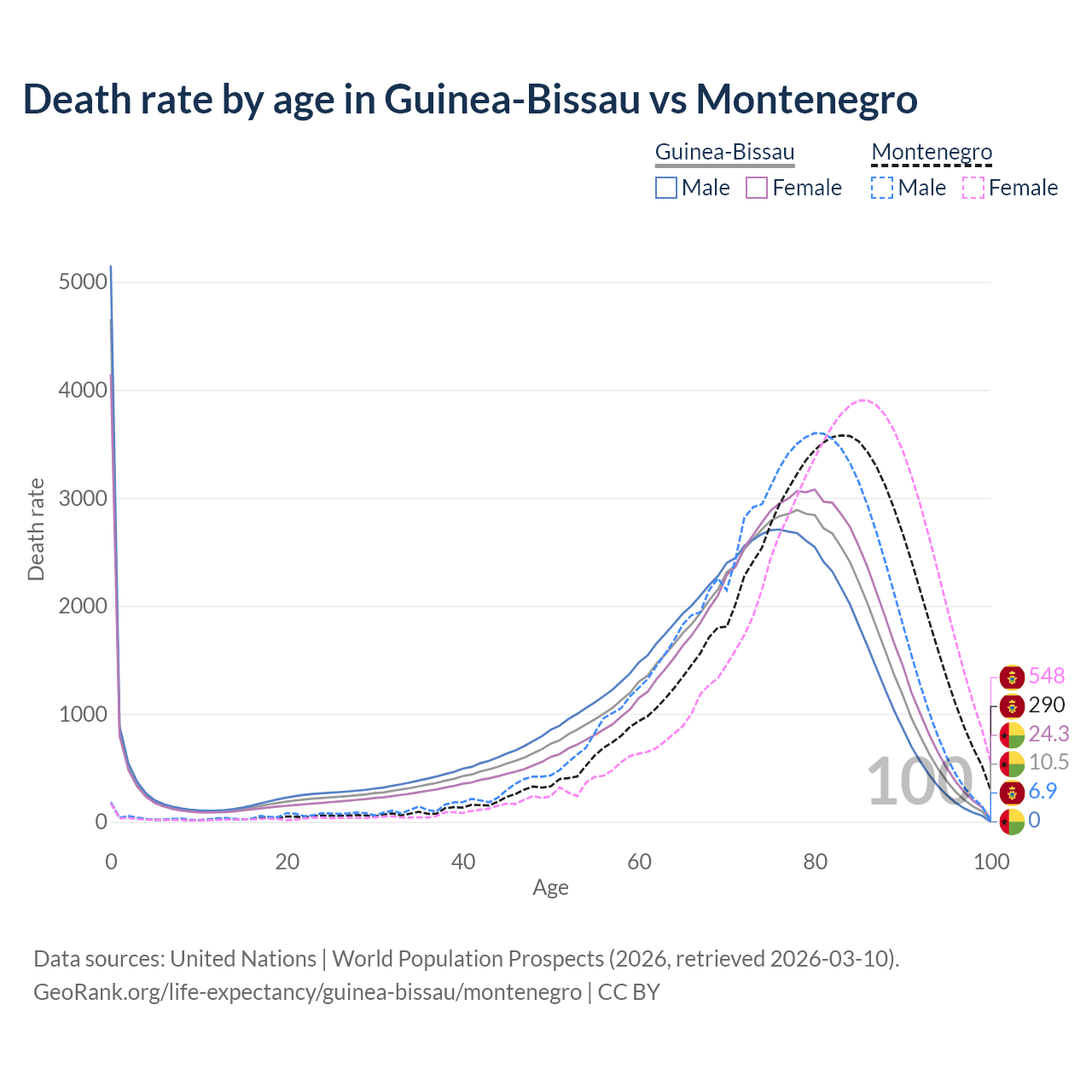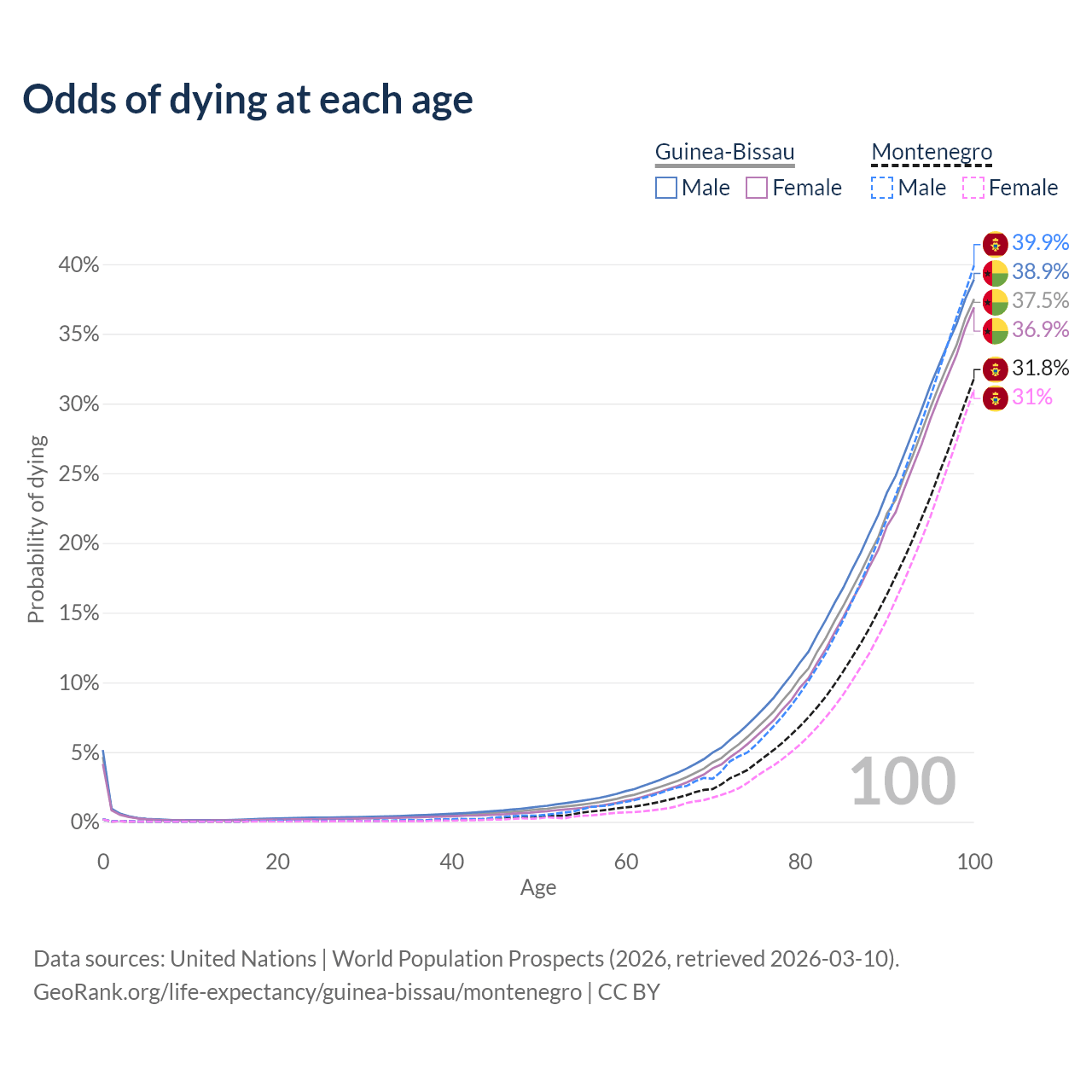This life expectancy calculator shows the odds of living to 100, 95, 90, and below based on current age for both males and females in Guinea-Bissau and Montenegro, along with mean and median age of death. The calculations are based on the 2026 life tables (actuarial tables) from the UN World Population Prospects.