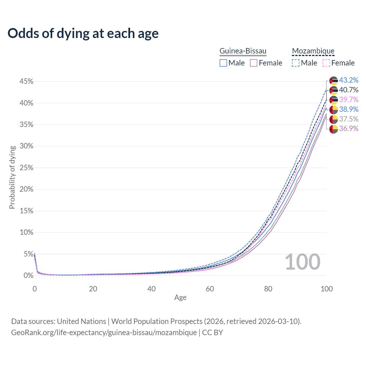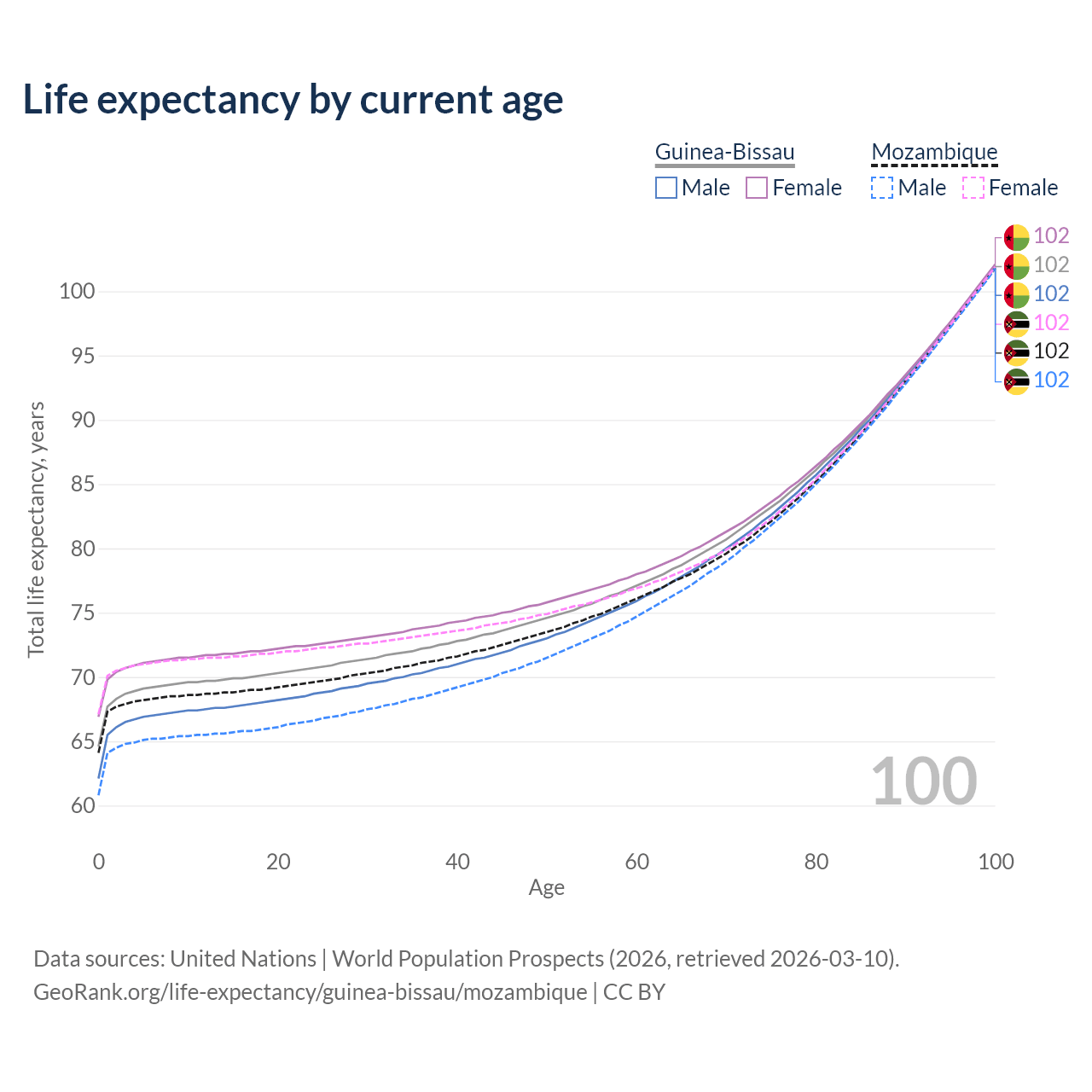 This life expectancy calculator shows the odds of living to 100, 95, 90, and below based on current age for both males and females in Guinea-Bissau and Mozambique, along with mean and median age of death. The calculations are based on the 2026 life tables (actuarial tables) from the UN World Population Prospects.