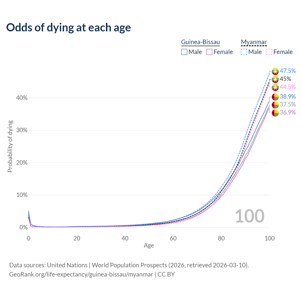 This life expectancy calculator shows the odds of living to 100, 95, 90, and below based on current age for both males and females in Guinea-Bissau and Myanmar, along with mean and median age of death. The calculations are based on the 2026 life tables (actuarial tables) from the UN World Population Prospects.