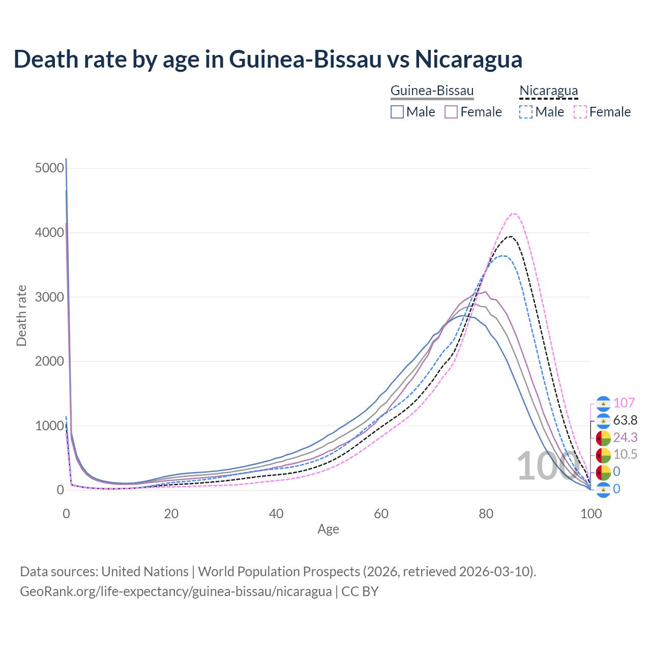 In Guinea-Bissau, the most common age of death is 0, compared to 85 in Nicaragua. The median age of death is 71.8 in Guinea-Bissau and 79.9 in Nicaragua, meaning only half of each cohort is expected to live past that age.