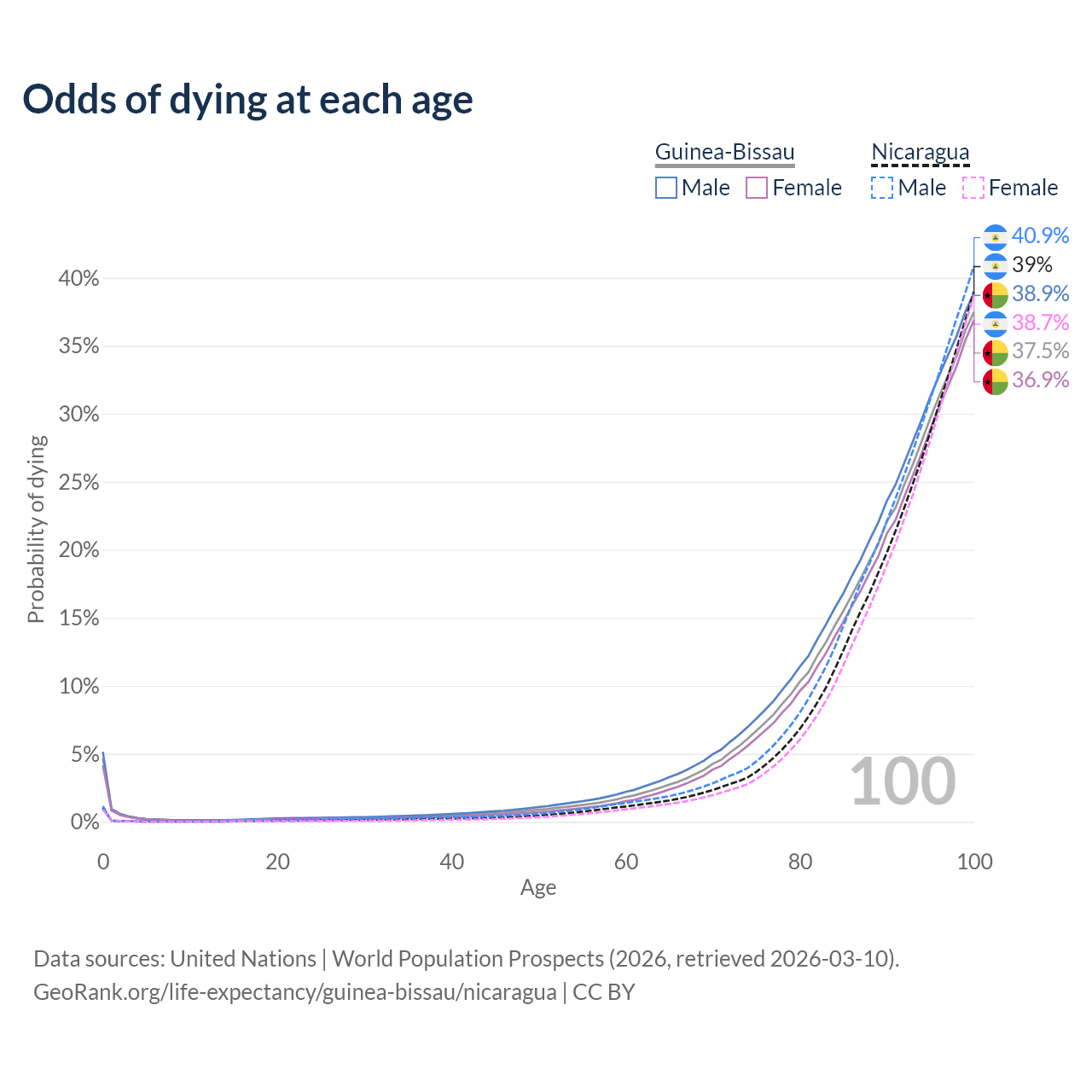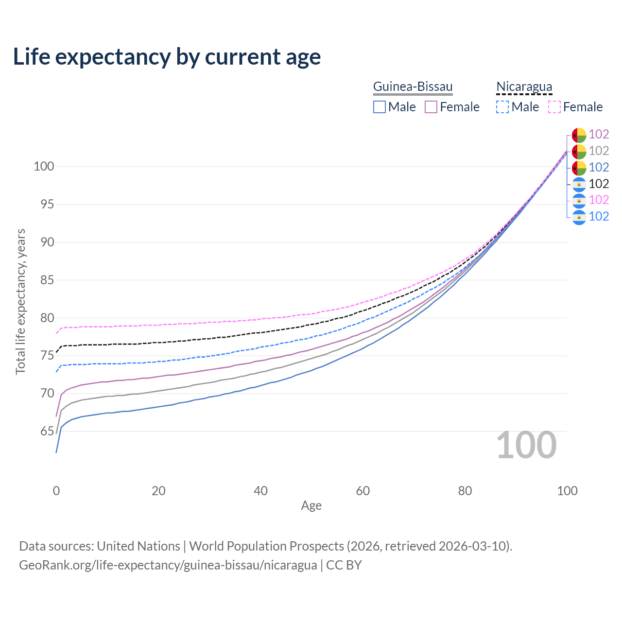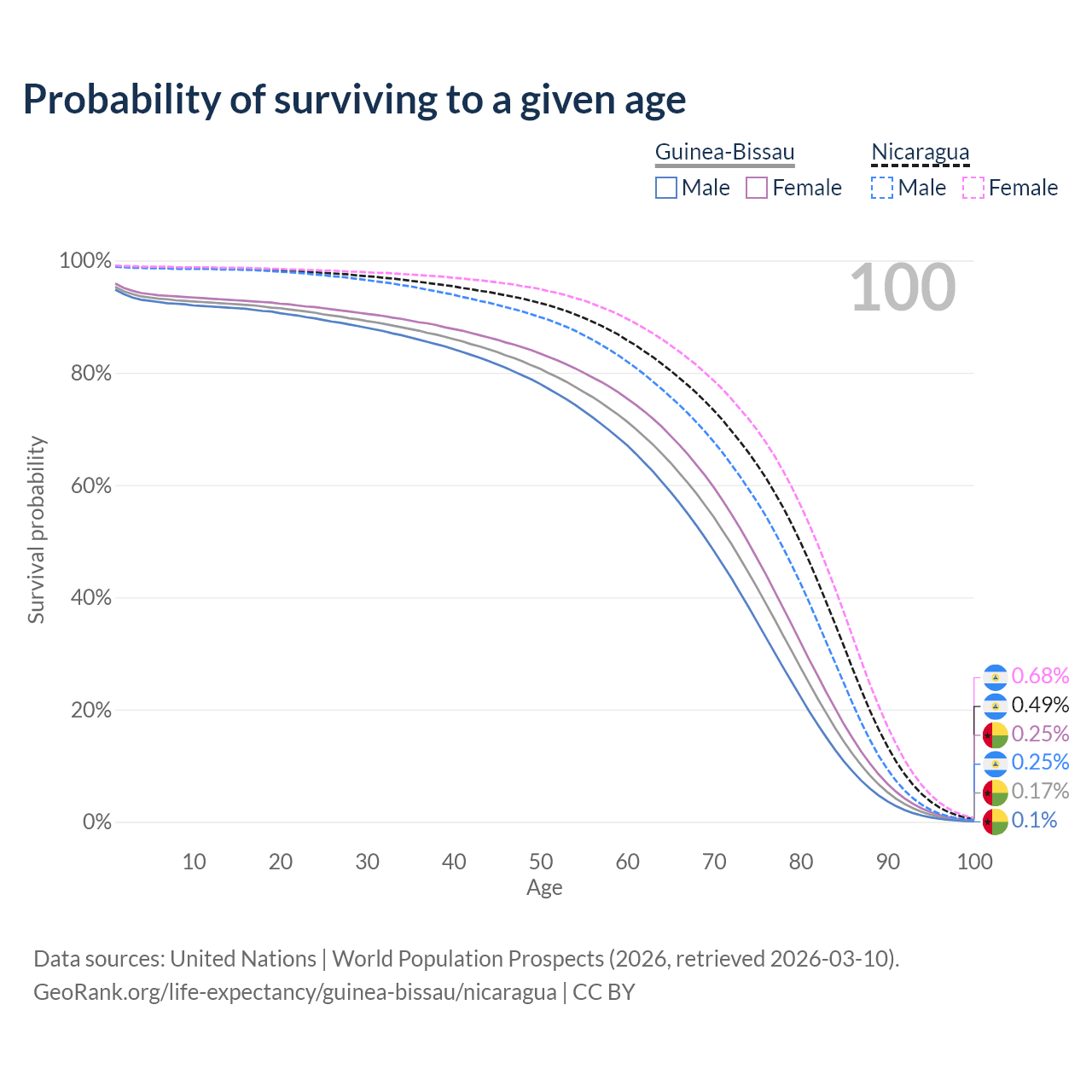This life expectancy calculator shows the odds of living to 100, 95, 90, and below based on current age for both males and females in Guinea-Bissau and Nicaragua, along with mean and median age of death. The calculations are based on the 2026 life tables (actuarial tables) from the UN World Population Prospects.