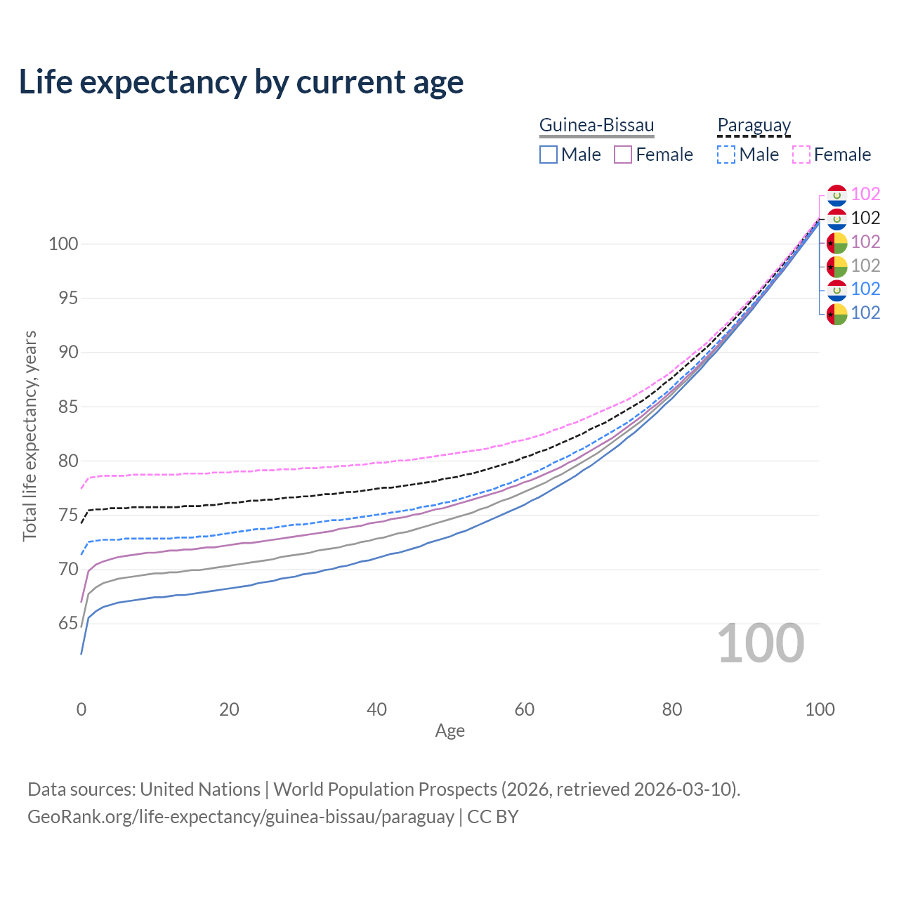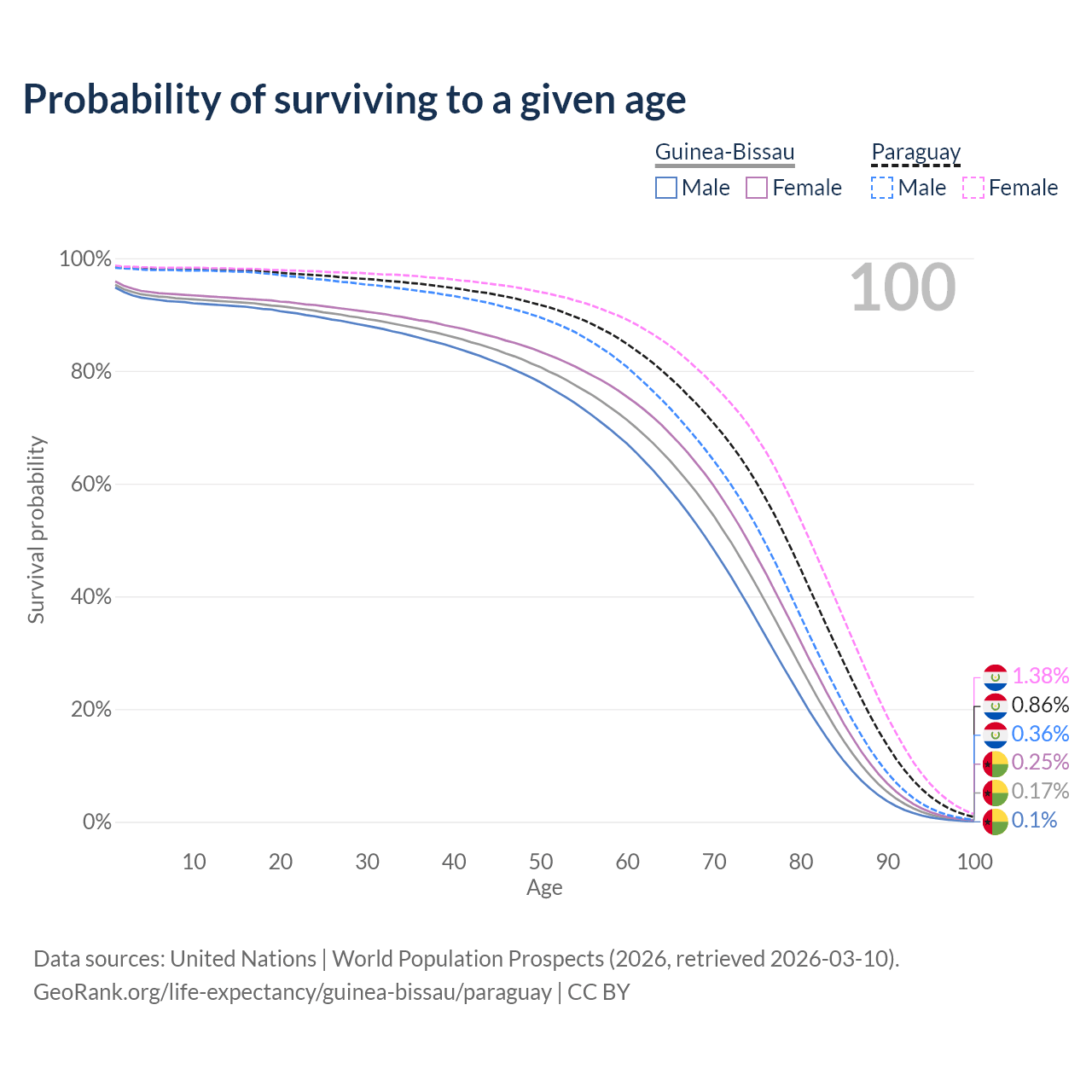 This life expectancy calculator shows the odds of living to 100, 95, 90, and below based on current age for both males and females in Guinea-Bissau and Paraguay, along with mean and median age of death. The calculations are based on the 2026 life tables (actuarial tables) from the UN World Population Prospects.