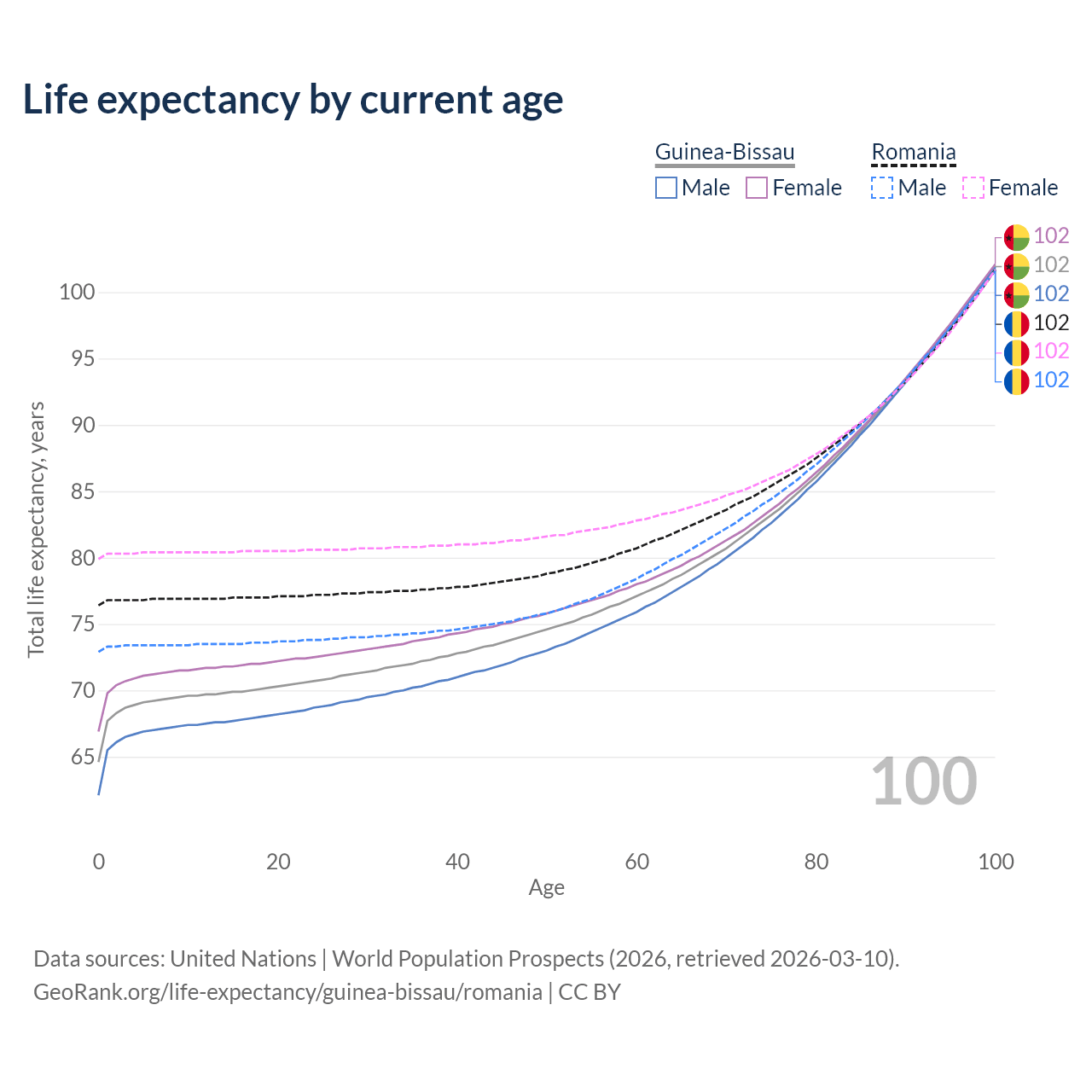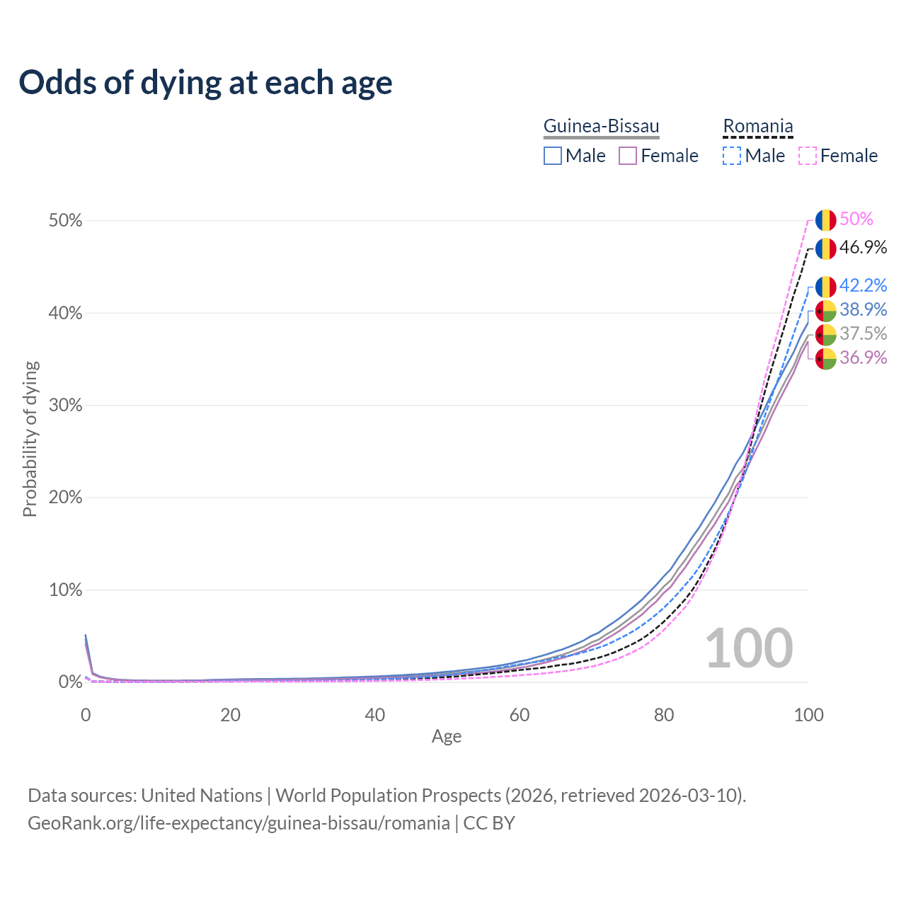 This life expectancy calculator shows the odds of living to 100, 95, 90, and below based on current age for both males and females in Guinea-Bissau and Romania, along with mean and median age of death. The calculations are based on the 2026 life tables (actuarial tables) from the UN World Population Prospects.