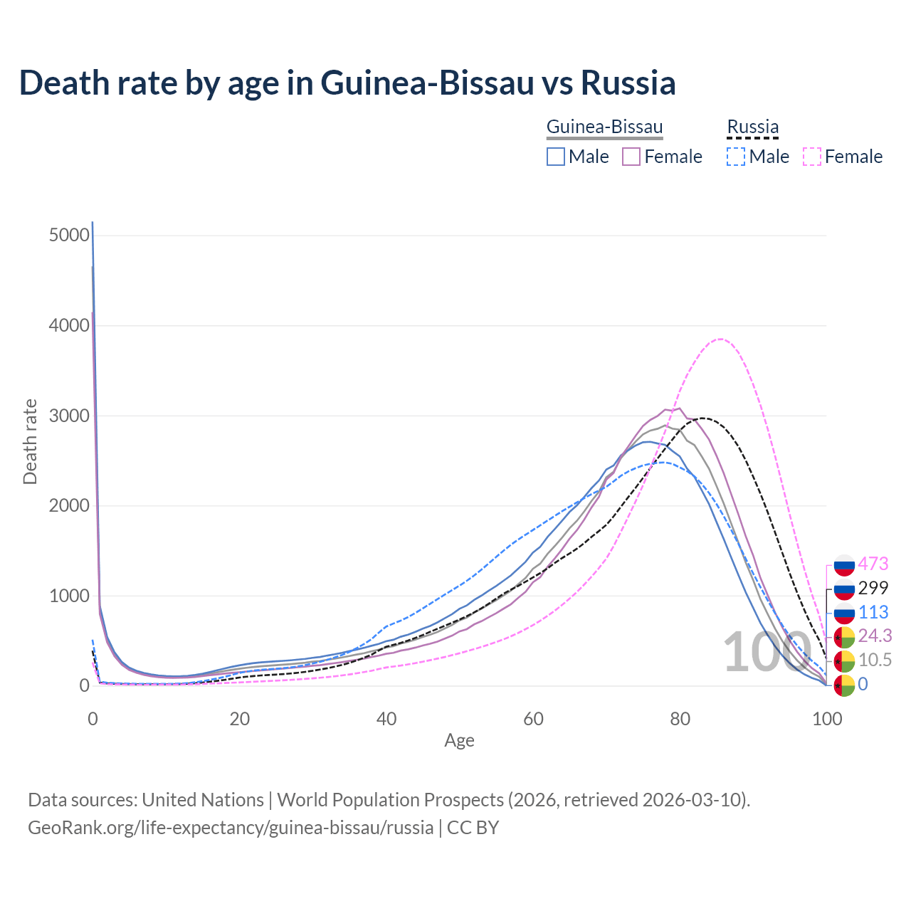 In Guinea-Bissau, the most common age of death is 0, compared to 83 in Russia. The median age of death is 71.8 in Guinea-Bissau and 77.5 in Russia, meaning only half of each cohort is expected to live past that age.