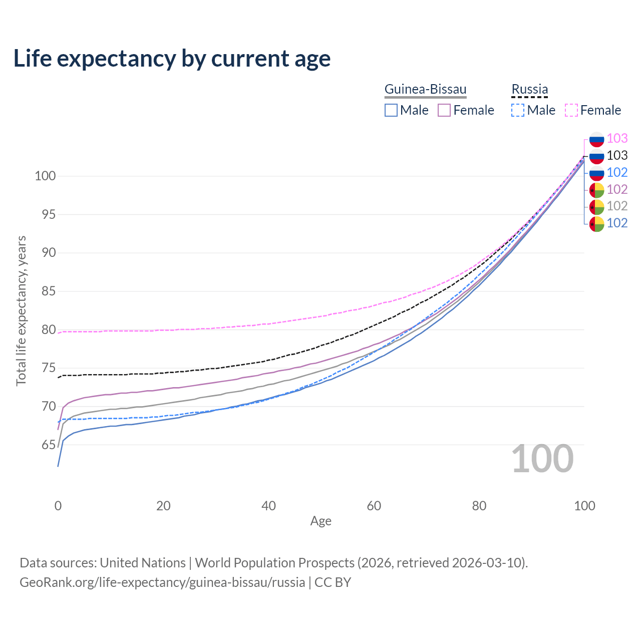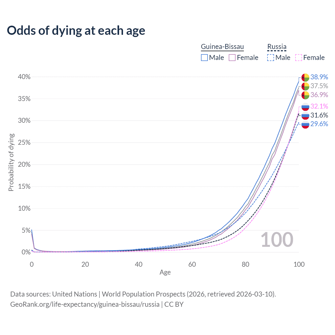 This life expectancy calculator shows the odds of living to 100, 95, 90, and below based on current age for both males and females in Guinea-Bissau and Russia, along with mean and median age of death. The calculations are based on the 2026 life tables (actuarial tables) from the UN World Population Prospects.