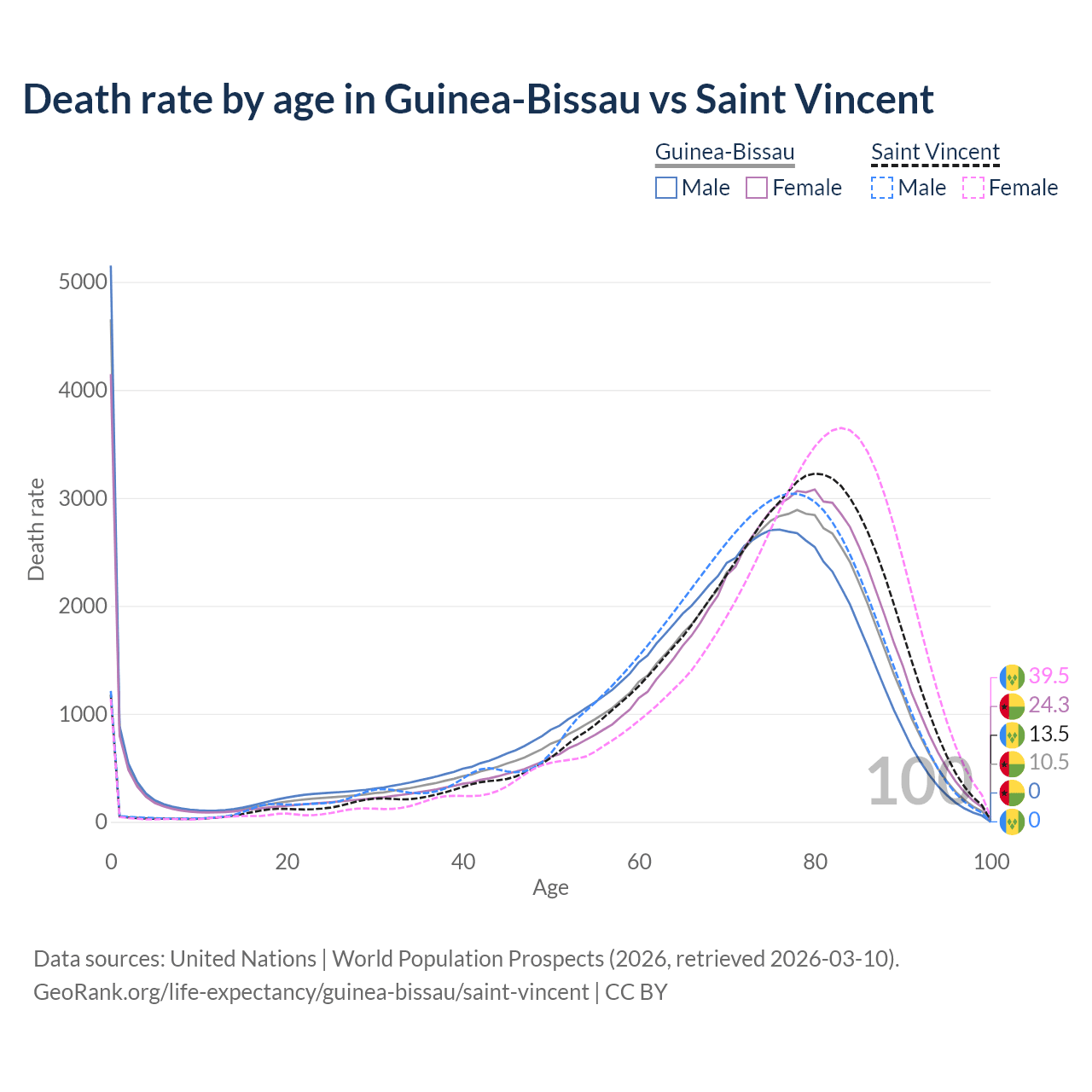 In Guinea-Bissau, the most common age of death is 0, compared to 80 in Saint Vincent. The median age of death is 71.8 in Guinea-Bissau and 75.6 in Saint Vincent, meaning only half of each cohort is expected to live past that age.